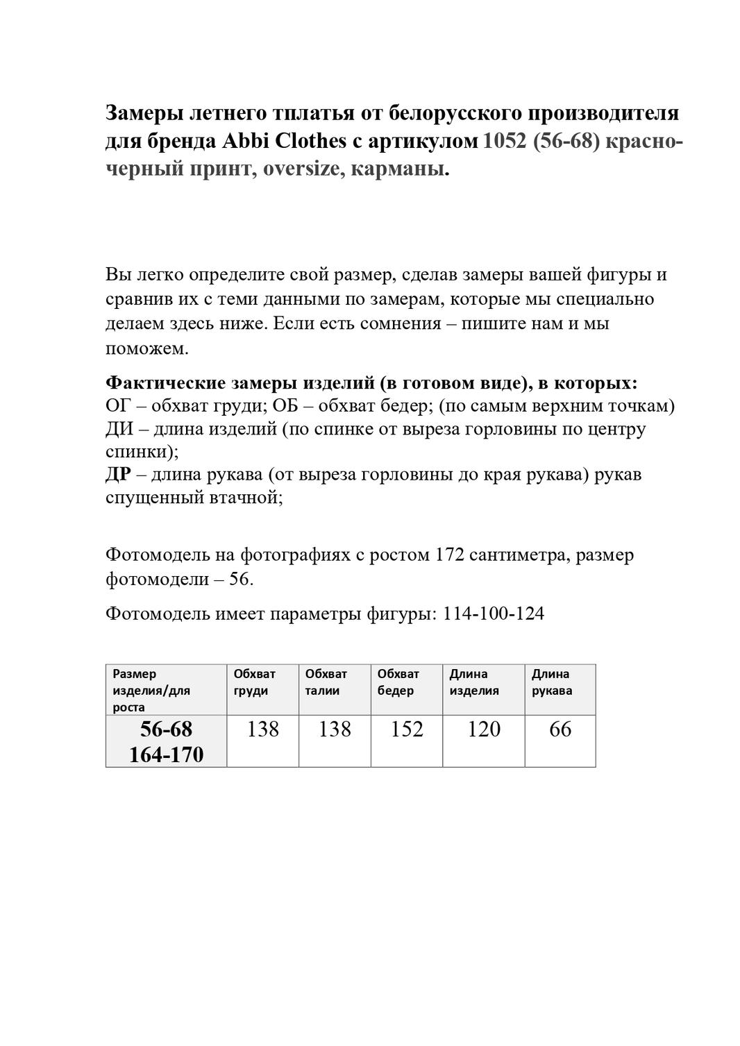 Захватите лето в стиле и комфорте! Представляем летнее платье бренда Abbi с артикулом 1052 в сочном красно-черном принте – идеальный выбор для роскошных форм от 62 до 68 размеров (универсальный размер, который стоит примерить и для 56, как на фотомодели при съемке). Свободного силуэта.