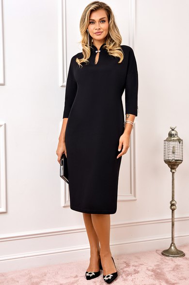 Элегантное и нарядное платье, выполнено из высококачественной трикотажной ткани (ткань мягкая, приятная к телу, хорошо тянется). Горловина стойка с вырезом-капелькой и отделкой из блестящего канта с застежкой дизайнерской брошью, придает модели особый шарм. Рукав втачной, спущенный с манжетой и пришивным декором в виде бантика. Платье с левого бока по низу с небольшим разрезом. Модель стильная и практичная, невероятно стройнит, прекрасно подойдет для торжественного мероприятия, вы будете выглядеть неотразимо и роскошно.