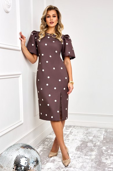 Роскошное нарядное платье, выполнено из плательной ткани Барби с добавлением вискозы с модным принтом горох. Платье с объемными рукава, что придает модели особый стиль и шарм. Платье прилегающего силуэта, вырез горловины округлый, по переду с разрезом и декорировано кружевом. По спинке платья потайная молния застежка. Модель прекрасно подойдет для торжественного мероприятия!