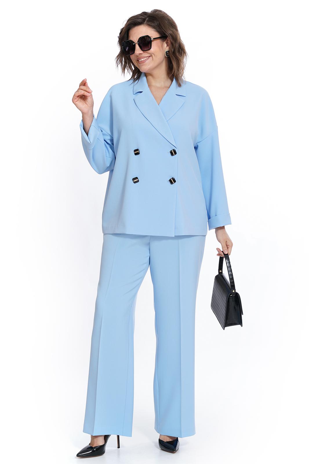 Брюки прямого силуэта, со сгибом, на притачном поясе с резинкой по боковым. Застёжка типа «гульфик» на молнию и петлю, пуговицу по краю пояса. Передние части с имитацией боковых косых карманов. Задние части с талевыми выточками.