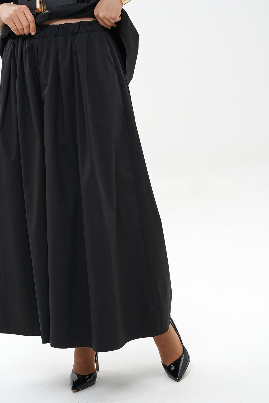 Юбка-Брюки широкие свободного силуэта, с притачным поясом на резинке. Передние части с мягкими складками от пояса и косыми боковыми карманами.
