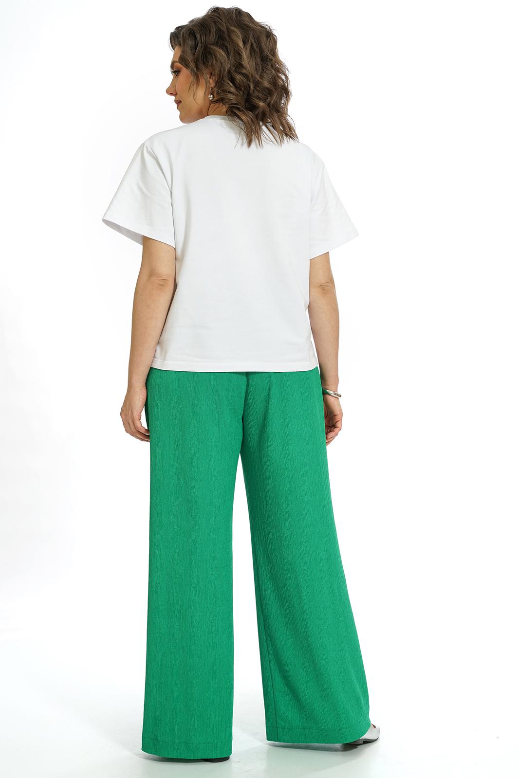 Брюки прямого силуэта, со сгибом, с притачным поясом по боковым на резинке, с застёжкой типа «гульфик» на молнию и петли, пуговицы по краю пояса. Передние части с имитацией косых боковых карманов. Задние части с талевыми выточками