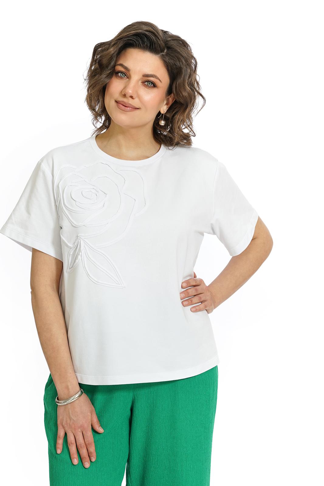 Блуза прямого, свободного силуэта. Рукава втачные, одношовные, короткие. По горловине бейка. Декорированная по переду аппликацией цветок
