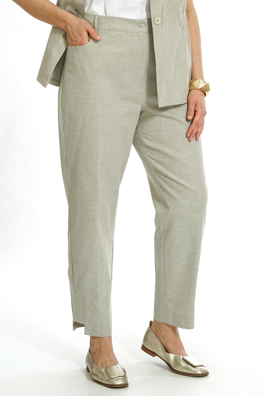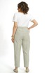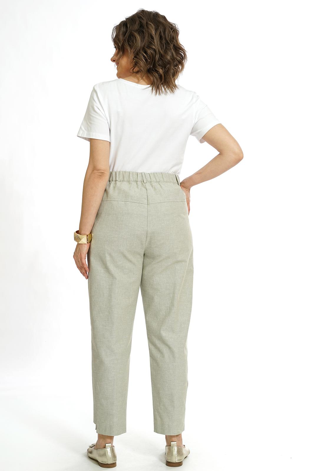 Брюки типа «банан», длиной 7/8, с разноуровневым низом и конструктивными выточками, на притачном поясе со шлёвками, по спинке на резинке. Застёжкой типа «гульфик» на молнию и петлю, пуговицу по краю пояса. Передние части с полукруглыми боковыми карманами, в правом кармане маленький карман. Задние части с притачной кокеткой.