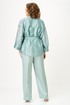 Блузон прямого, свободного силуэта, с удлинённой линией плеча, с завязывающимся поясом, с застёжкой на петли, пуговицы, с разно-уровневым низом (спинка длиннее переда). Спинка с притачной кокеткой и бантовой складкой. Рукава втачные, одношовные, длиной ¾, понизу вдоль разреза планка, мягкие складки и притачные манжеты, застёгивающиеся на петли, пуговицы. Воротник стояче-отложной на отрезной стойке застёгивающейся на петлю, пуговицу.