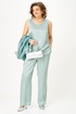 Брюки свободного, прямого силуэта, с притачным поясом на резинке. Передние части с боковыми, косыми карманами