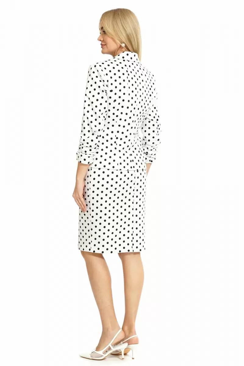 Жакет полуприлегающего силуэта, на подкладке, с отложными лацканами с центральной застёжкой на петлю, пуговицу, по лацкану, краю борта вставлен отделочный кант. Перед с фигурными рельефными швами с прорезными карманами с листочкой. Спинка со средним швом и фигурными рельефными швами. Рукава втачные, двухновные, длиной ¾, понизу со сборкой. Воротник отложной с отворотом.