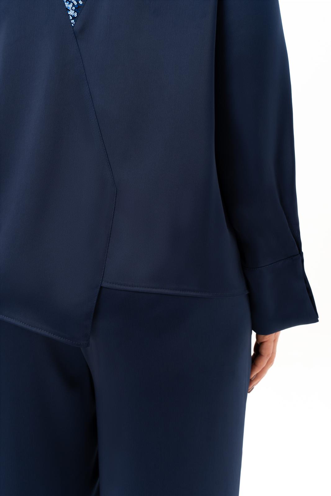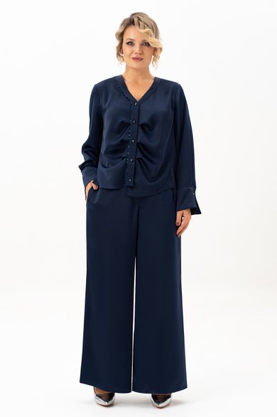 Элегантный женский брючный костюм — настоящая находка для тех, кто ищет идеальный образ на праздник, свадьбу или важный вечер. Классический крой и свободные брюки палаццо подчёркивают достоинства фигуры и дарят комфорт. Нарядный и вечерний стиль — безупречно смотрится на большом мероприятии, создавая образ, полный уверенности и шарма. Блуза выполнена из шелковистой ткани с приятной фактурой. Блузка с длинными струящимися рукавами выглядит очень изящно и очаровательно. Блузка без воротника, застежка на петли и пуговицы по планке, с V – образным вырезом горловины. Спинка с декоративным элементом из паеток. По переду вдоль планок заложены складки и обработан кант из паеток. Изделие асимметрично по низу. Боковые швы перенесены в линию рельфа полочки и спинки. В рельефах полочки обработаны разрезы. Рукав со складкой по шву притачивания манжеты. Прямого силуэта с втачным , длинным рукавом. Брюки с широкими штанинами палаццо выгодно подчеркивают женственные формы, а свободный крой обеспечивает удобство в любой ситуации. На брюках обработаны карманы в боковых швах, по талии пояс с застежкой на молнию и частично на резинке. Красивая двойка строгого силуэта — идеальное сочетание для торжеств и даже для делового офисного дресс кода. Подходит для женщин больших и полных размеров, продуманный крой визуально стройнит, подчёркивает талию и скрывает лишнее. Создайте идеальный образ — выберите стильный женский нарядный костюм с брюками палаццо и подчеркните свою индивидуальность!