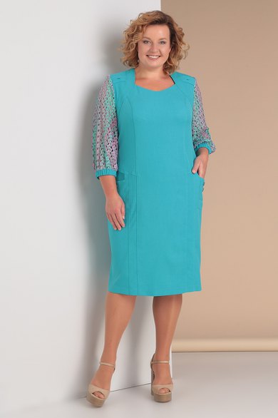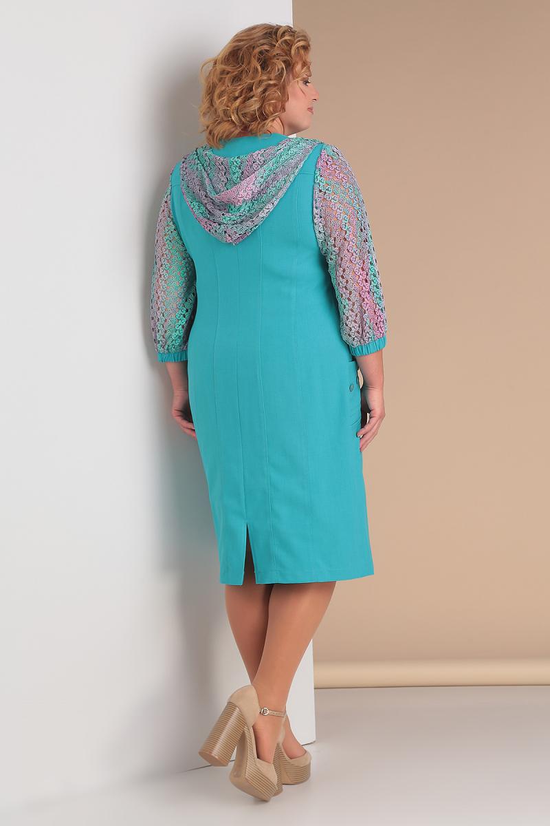 Оригинальное платье прямого силуэта с накладными карманами, обработанными на полочке. Горловина фигурная. Рукав длиной 3/4 с небольшой манжетой на резинке, выполнен из кружевного полотна. Спинка со средним швом. В модели есть съемный капюшон выполненный из кружевного полотна. Декором служат многочисленные отделочные строчки, пуговицы. В этом платье женщина выглядит на два размера меньше, но чувствует себя абсолютно комфортно.