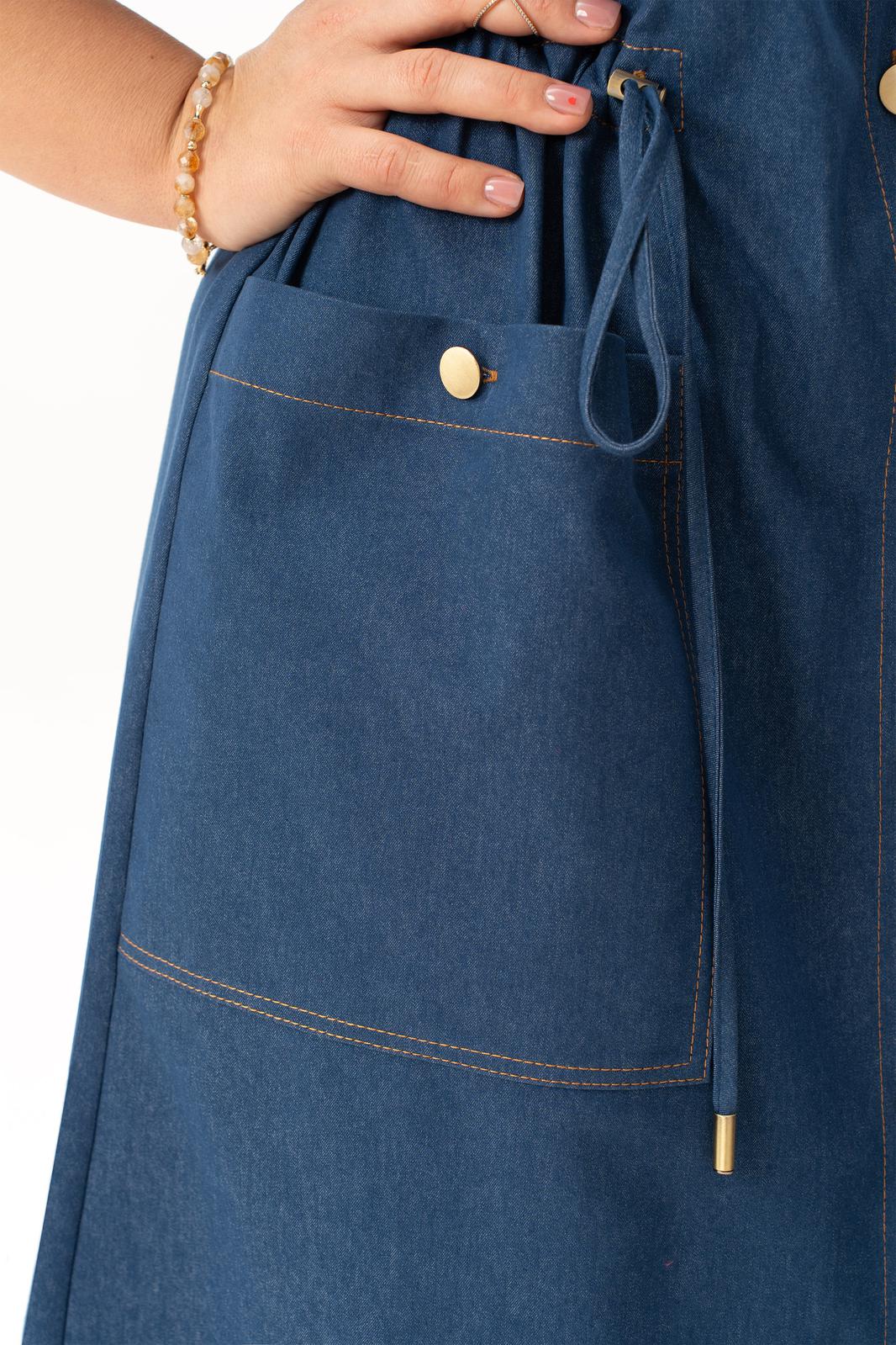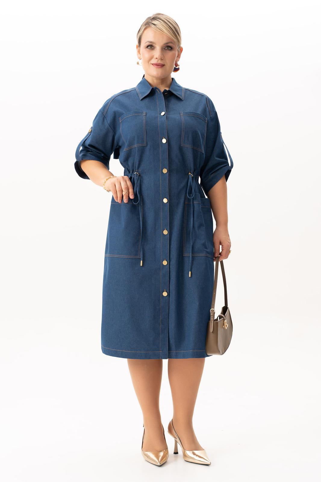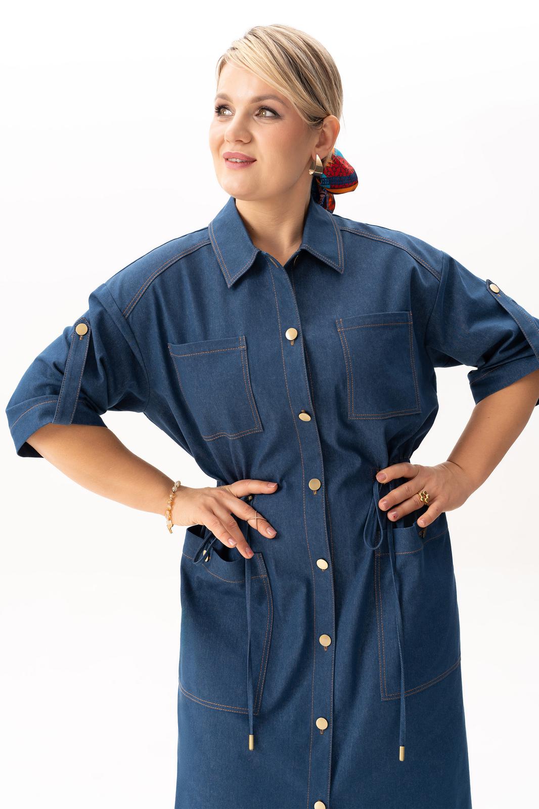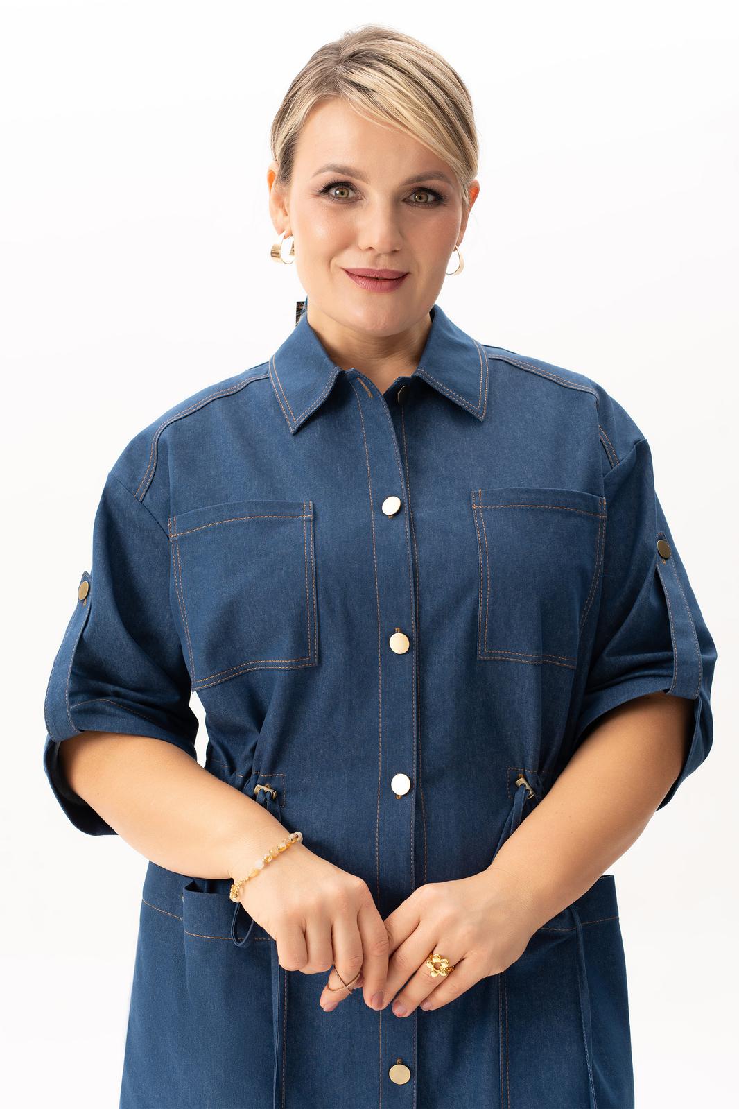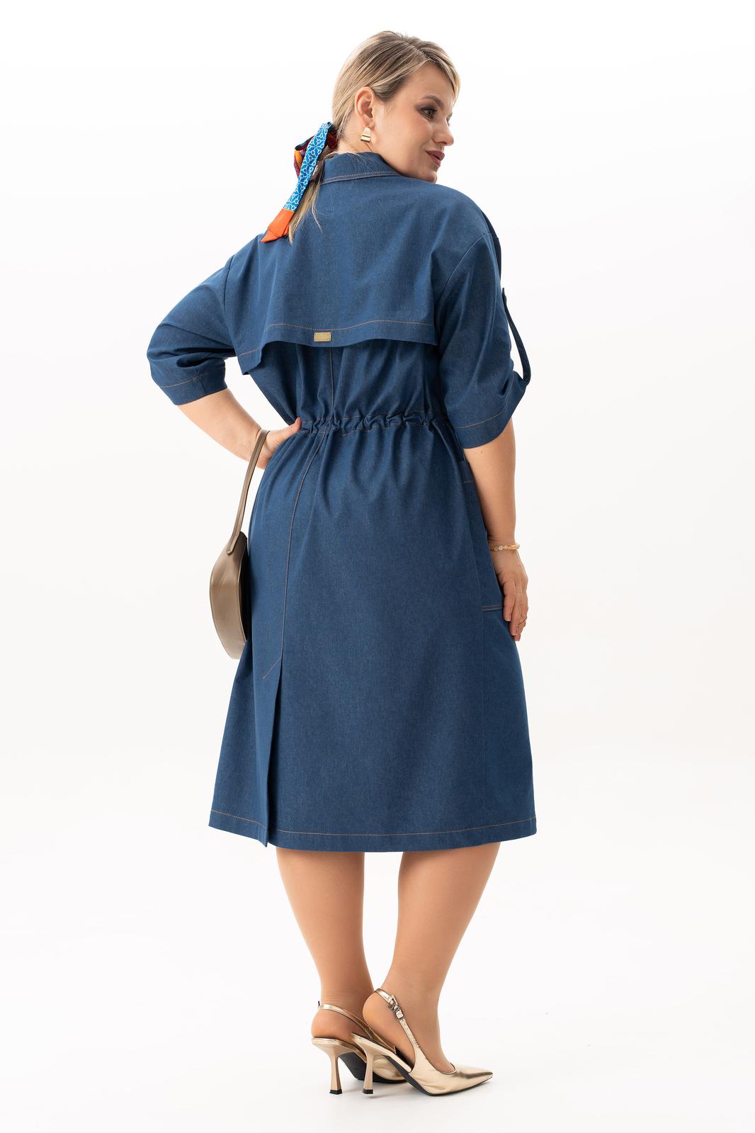 Стильное джинсовое платье больших размеров– это идеальный выбор для женщин, стремящихся сочетать стиль и комфорт в одежде. Модель выполнена из легкого хлопка, что обеспечивает комфорт в течение всего дня. Подходит для различных сезонов — весной и летом оно станет незаменимым элементом гардероба. Этот универсальный вариант представлен в больших размерах, что позволяет каждой женщине найти свой идеальный стиль. Оно прекрасно смотрится с кроссовками, что делает его отличным выбором для активных женщин. С этим нарядом вы можете смело отправляться на деловые встречи или в ресторан, благодаря элегантному крою, аккуратной застежке на петли пуговицы, поясом на кулисе платье скрывает недостатки фигуры, придавая ей стройный вид, а наличие карманов добавляет практичности. По спинке имеется средний шов, шлица и отлитная кокетка в верхней части спинки. Особенностью этой модели является декоративная кокетка , напоминающая плащ. Рукава с патами на петли пуговицы, позволяют регулировать длину , гармонично дополняя классический фасон платья с воротником рубашечного типа. Длина ниже колен создает образ, который легко сочетать с различными аксессуарами. Вечером такое платье отлично дополнит вечерний образ, а днем подчеркнет вашу индивидуальность и профессионализм.