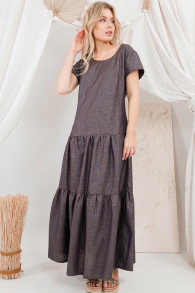 Очень красивая ткань - иммитация льна с легчайшим золотистым блеском. Платье с сильно заниженной трендовой талией и двумя воланами по нзу. Подкладки нет.