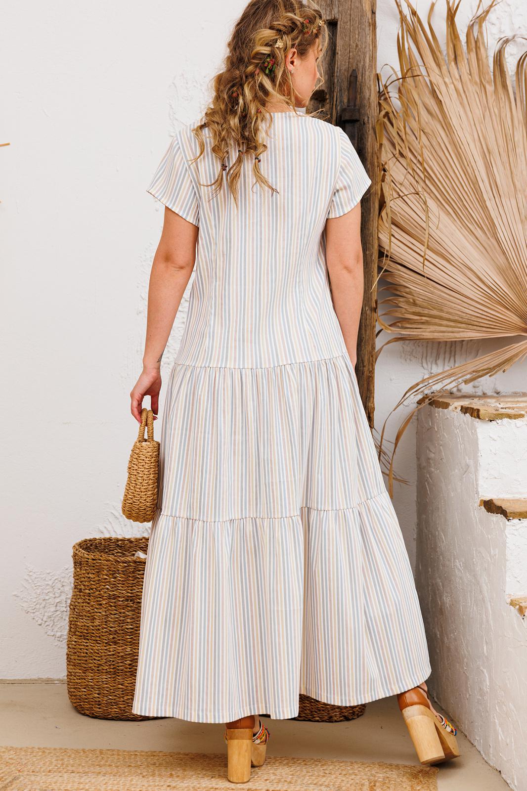 Очень красивое натуральное платье в нежную, слегка фактурную полоску. Спинка имеет средний шов, талиевые выточки и молнию.
