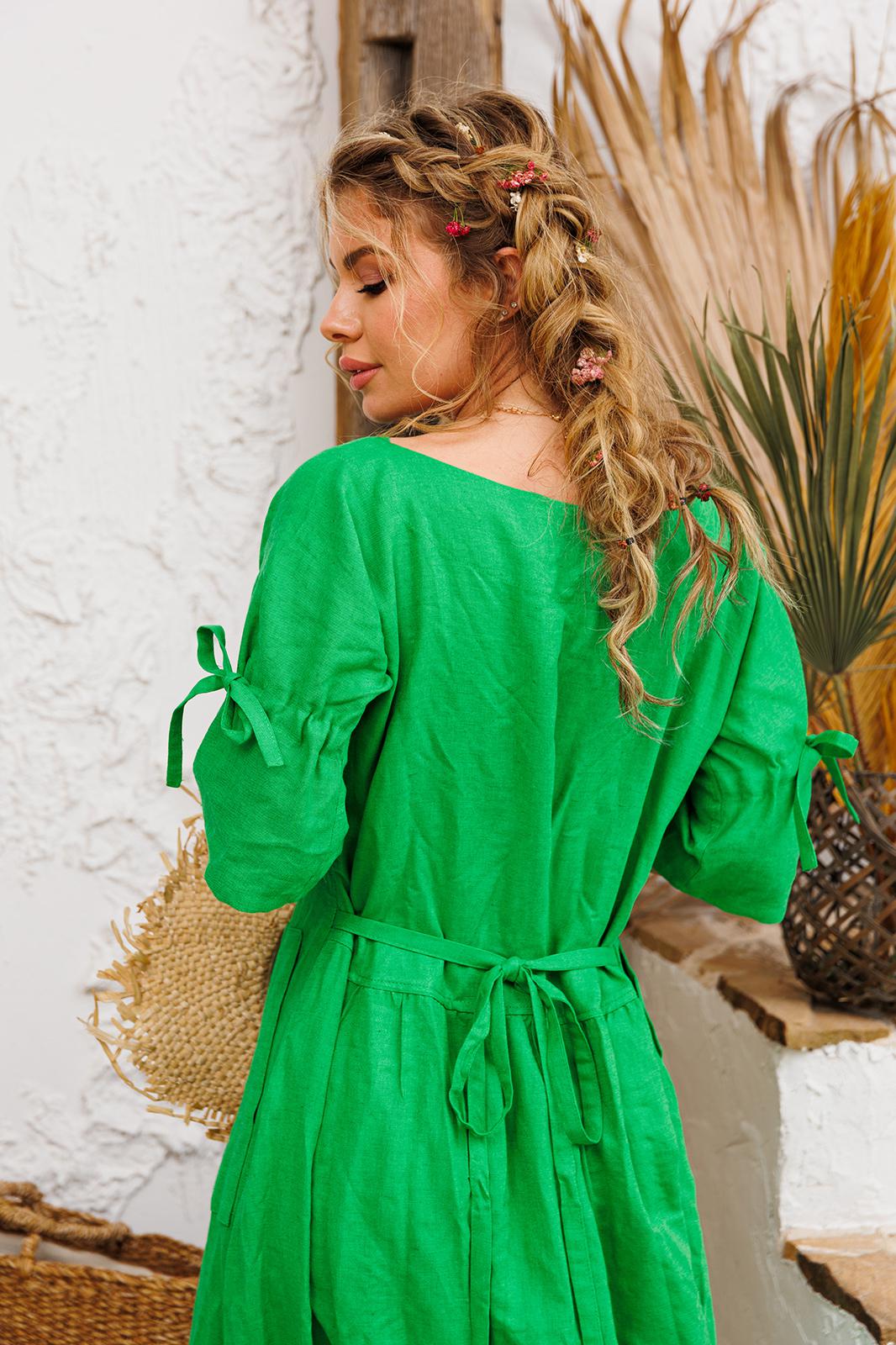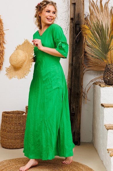 Очень эффектное льняное длинное платье с регулированием прилегания завязками по спинке. Элегантный V-образный вырез горловины, рукавчики имеют кулиску с завязочками что тоже позволяет регулировать обьем и образ. По спине на талии сборочка которая создает игривости и дополнительный шик юбке платья. Изделия бренда А М У Л Е Т создаются по славянским законам энергообережной одежды. Имеют перекидной крой и нет швов по главным энергоцентрам человека и они все пошиты закрытым способом по изнанке платья. Используется только натуральная ткань и фурнитура. В по д а р о к платье упаковывается в шопер с символом бренда.