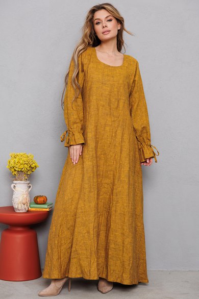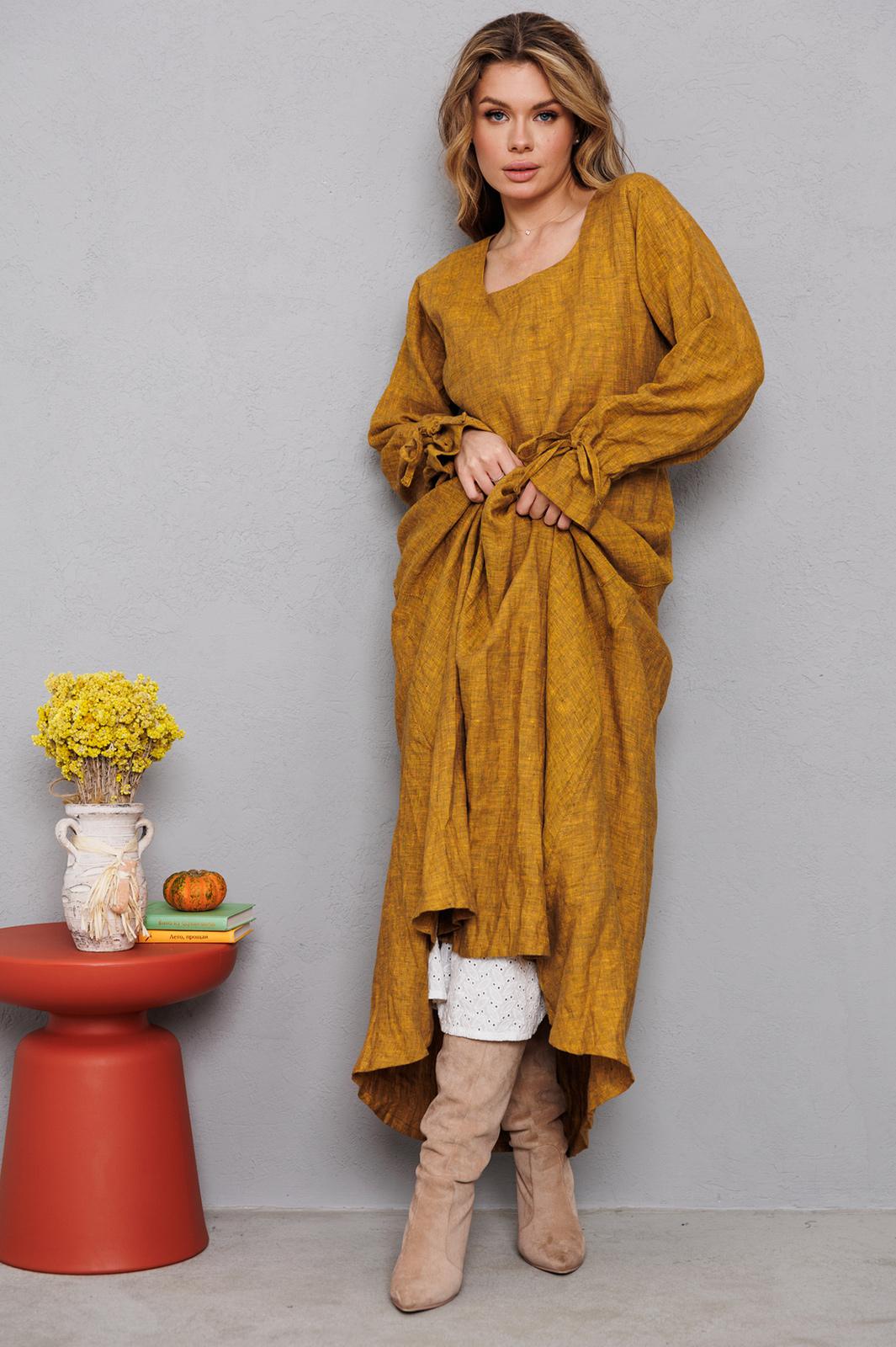 Натуральное льняное шикарное платье со смыслом. Немного необычный рябенький лён сложного привлекательного оттенка. Широкая юбка платья позволяет испытывать истинное наслаждение при ходьбе. Карманы это так же красиво как и удобно. Особая фишка этого платья - рукава с кулисой и оборкой. Это действительно шик и невозможно оторвать взгляд от этой красоты. На груди идёт очень глубокая обтачка уголком к талии, что создает эффект стройности и дополнительно защищает грудь и позволяет ходить без нижнего белья. На фото виднеется нижнее платье , это модель 9729, которую можно надевать для утепления под любые платья А М У Л Е Т и заказывается отдельно. Каждое платье бренда А М Л Е Т создано с применением древних славянских принципов по изготовлению обережной одежды. Обращаю Ваше внимание на то, что к заказу надо подходить осознанно, с пониманием ценности, а возвраты или неоплата, не в вашу копилку Благочестия, как говорится ). Мы Вас Любим и в комплекте к платью прилагаем сумку-шопер с логотипом бренда. Это Платье для Радости и Благости! Наслаждайтесь!