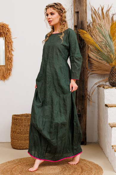 Натуральное льняное шикарное платье со смыслом. Это платье уникально и восхищает своим сочетанием цветов. Тёмно-зелёный с фуксией, это правда удивительно красиво. А силуэт который создается таким изысканным кроем получается очень стройным, причём в любом размере. Тюльпанчики по низу платья и по рукавам не оставят равнодушными никого. А карманы какие! Каждый элемент этого платья, это шедевр от талантливого дизайнера который сумел сочетать современное восприятие и исконные славянские знания об одежде. . На груди идёт очень глубокая обтачка уголком к талии, что создает эффект стройности и дополнительно защищает грудь и позволяет ходить без нижнего белья. Каждое платье бренда А М У Л Е Т создано с применением древних славянских принципов по изготовлению обережной одежды. Обращаю Ваше внимание на то, что к заказу надо подходить осознанно, с пониманием ценности, а возвраты или неоплата, не в вашу копилку Благочестия, как говорится ). Мы Вас Любим и в комплекте к платью прилагаем сумку-шопер с логотипом бренда. Это Платье для Радости и Благости! Наслаждайтесь!