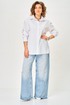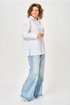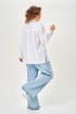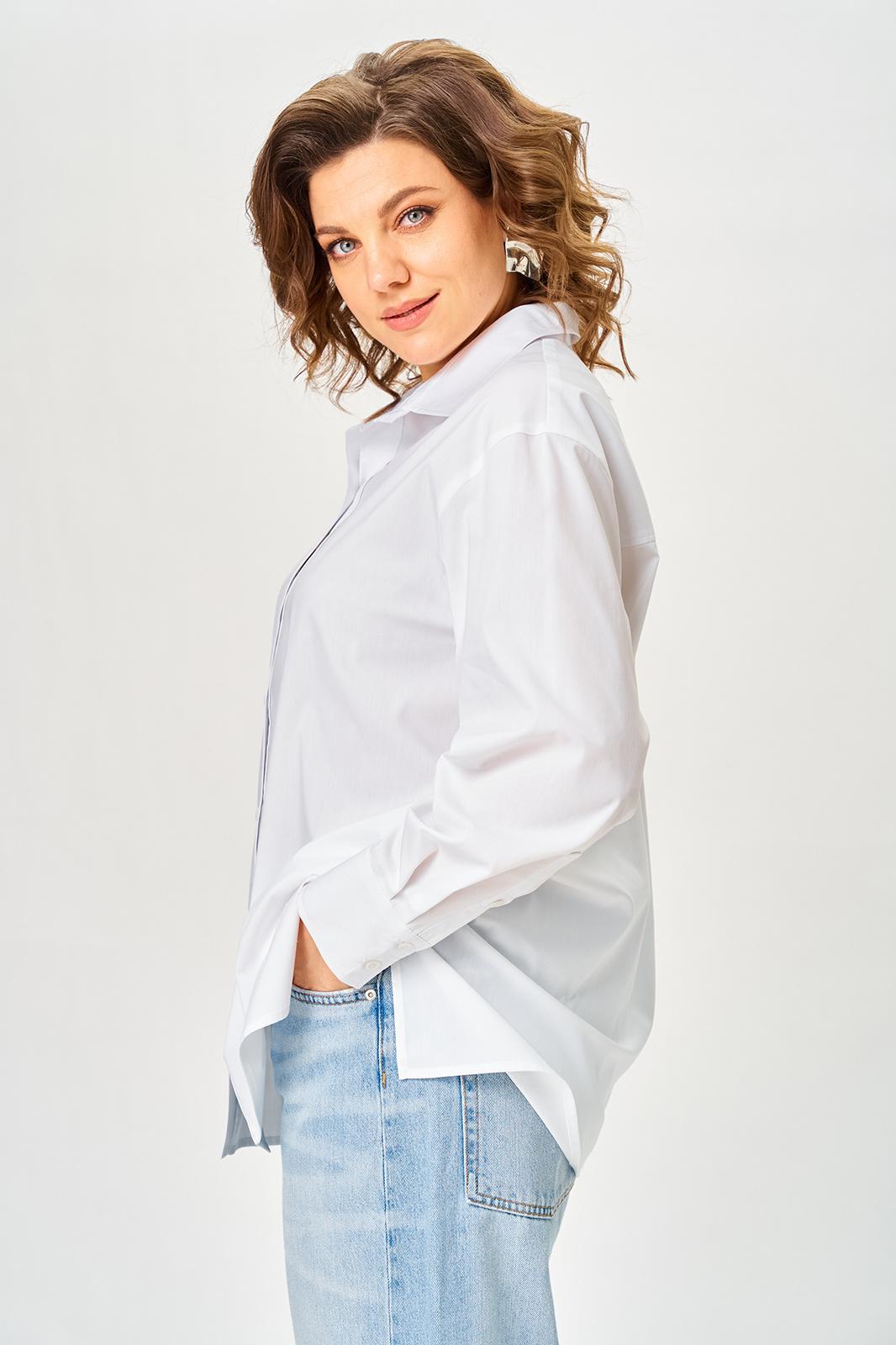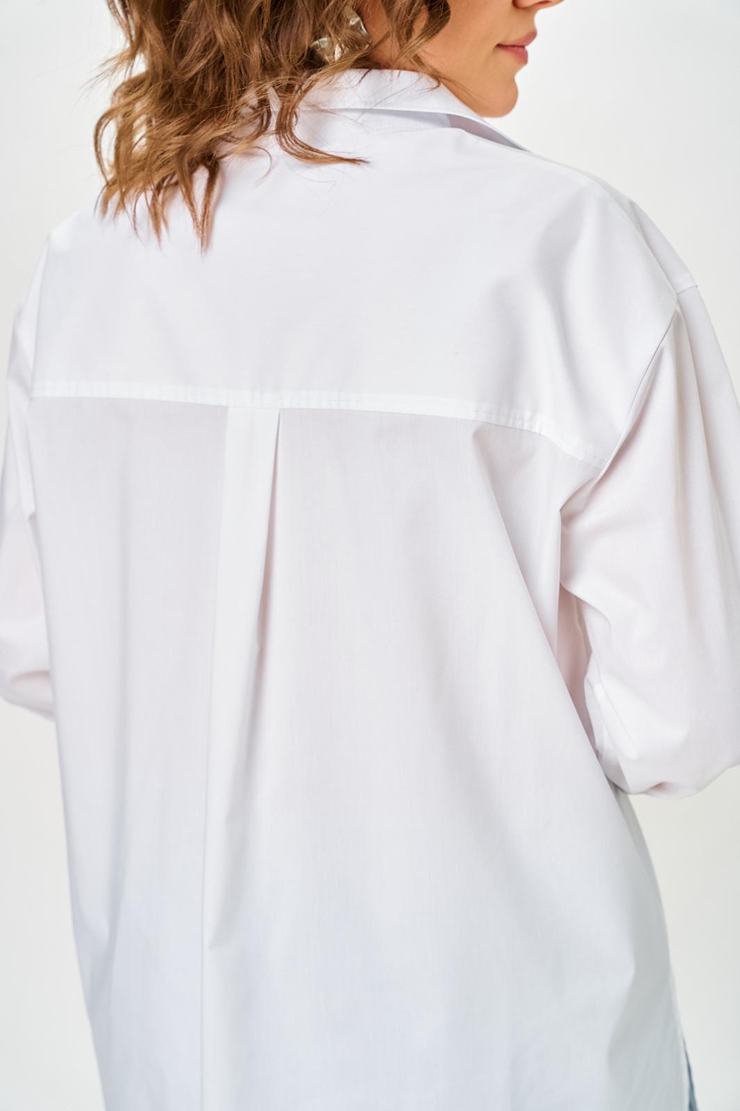 Рубашка прямого силуэта, выполнена из однотонной, рубашечной ткани. Полочка рубашки с центральной застежкой по притачной планке на петли и пуговицы, горловина круглой формы, с воротником рубашечного типа. Спинка с отрезной плечевой кокеткой и центральной бантовой складкой. Пройма углубленная. Рукав рубашечного типа, длинный, одношовный, по низу со складками, шлицей и на притачной манжете с застежкой на петли и пуговицы.