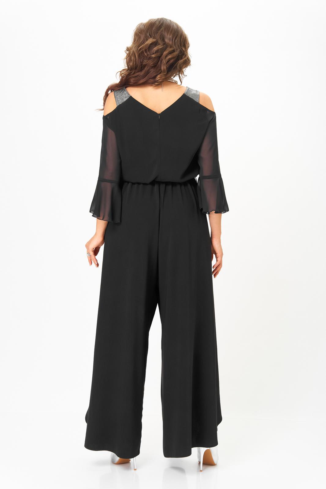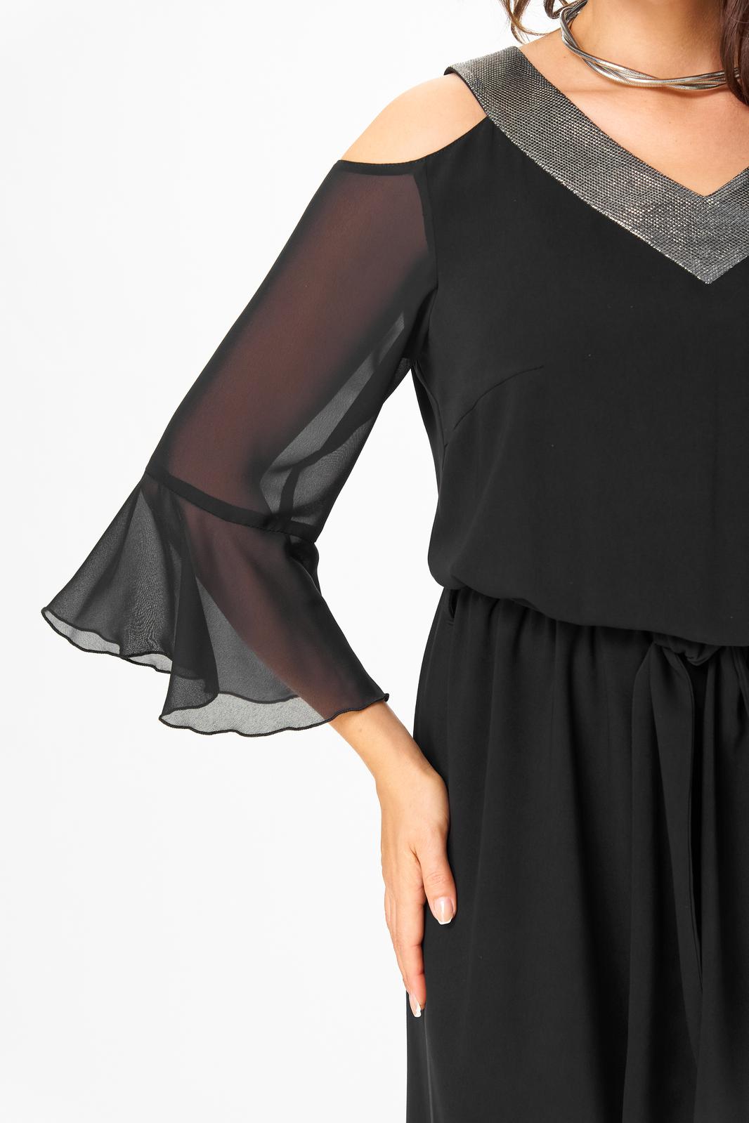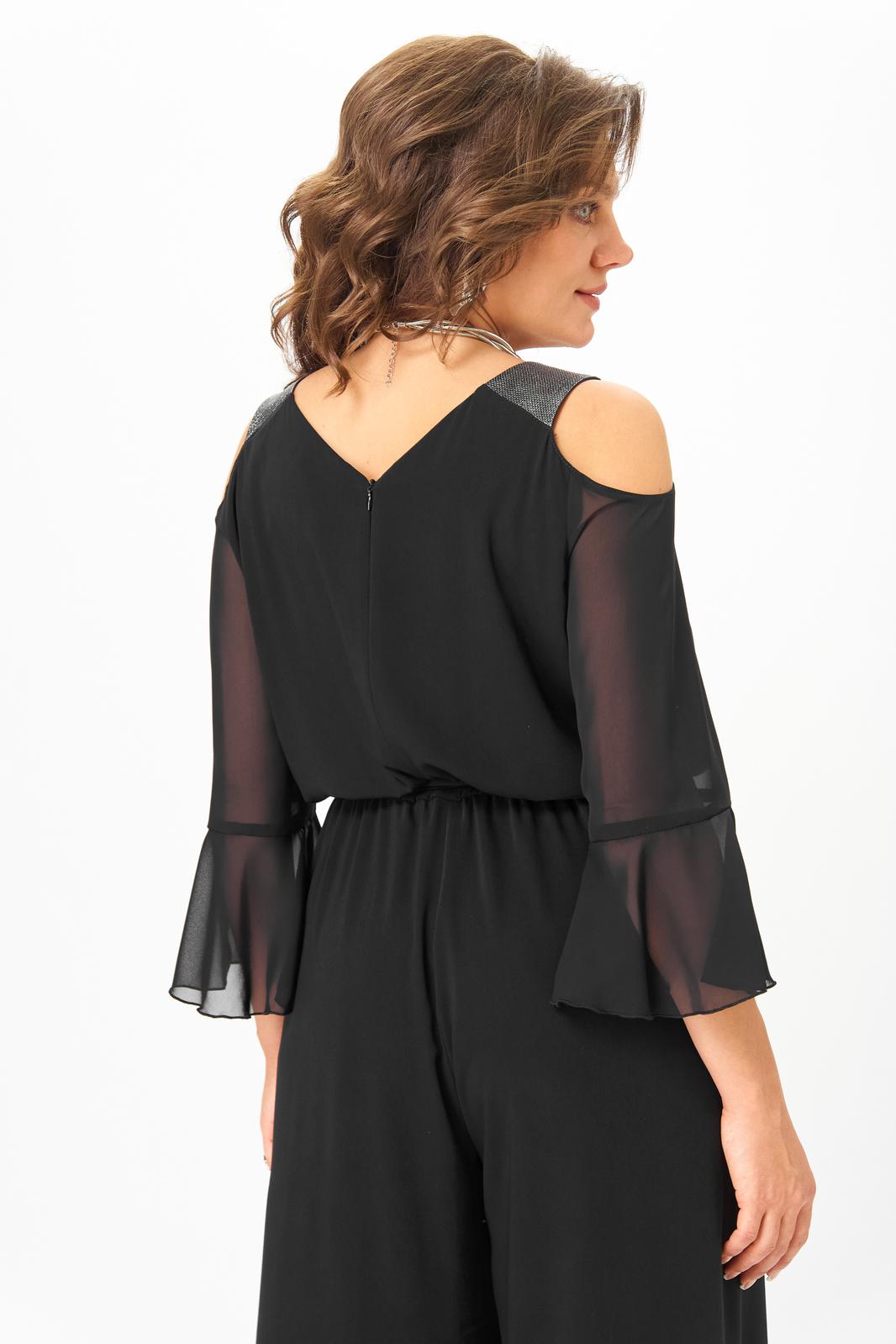 Комбинезон отрезной по линии талии. Полочка лифа с нагрудными вытачками, спинка с потайной молнией в среднем шве. Горловина V-образной формы, обработана притачной планкой из материала с люрексом. Рукав с открытым плечом, выполнен из шифона. Длина рукава ¾, по низу рукава обработан притачной волан. Нижняя часть комбинезона выполнена с запахом. По линии талии комбинезон на резинке. По боковым швам настрочены шлевки, через которые продет пояс, завязывающийся спереди.