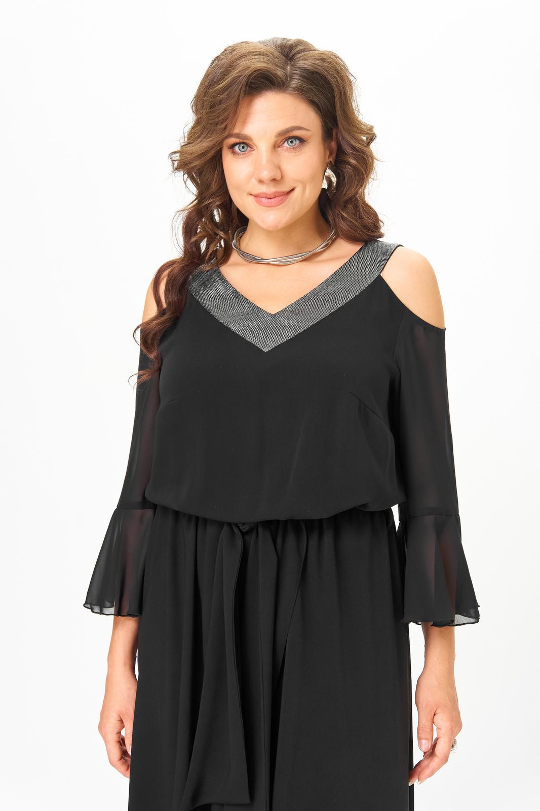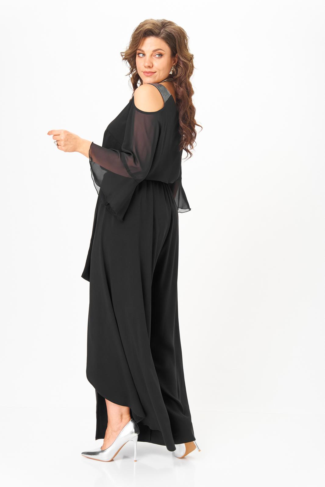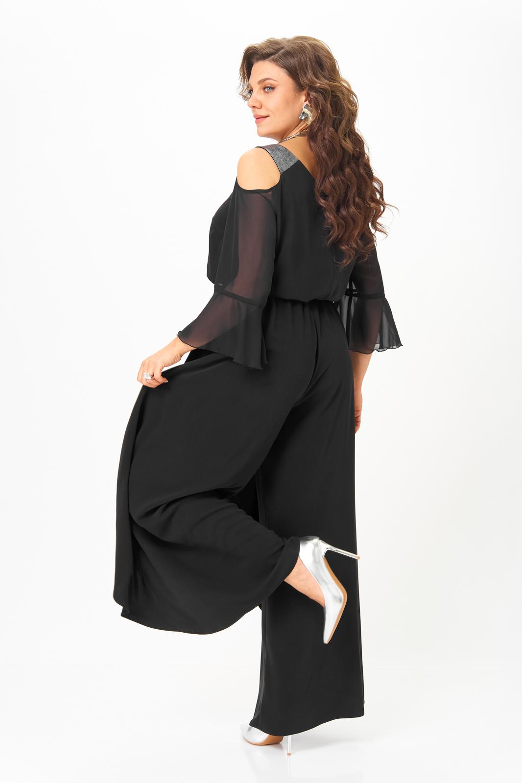 Комбинезон отрезной по линии талии. Полочка лифа с нагрудными вытачками, спинка с потайной молнией в среднем шве. Горловина V-образной формы, обработана притачной планкой из материала с люрексом. Рукав с открытым плечом, выполнен из шифона. Длина рукава ¾, по низу рукава обработан притачной волан. Нижняя часть комбинезона выполнена с запахом. По линии талии комбинезон на резинке. По боковым швам настрочены шлевки, через которые продет пояс, завязывающийся спереди.