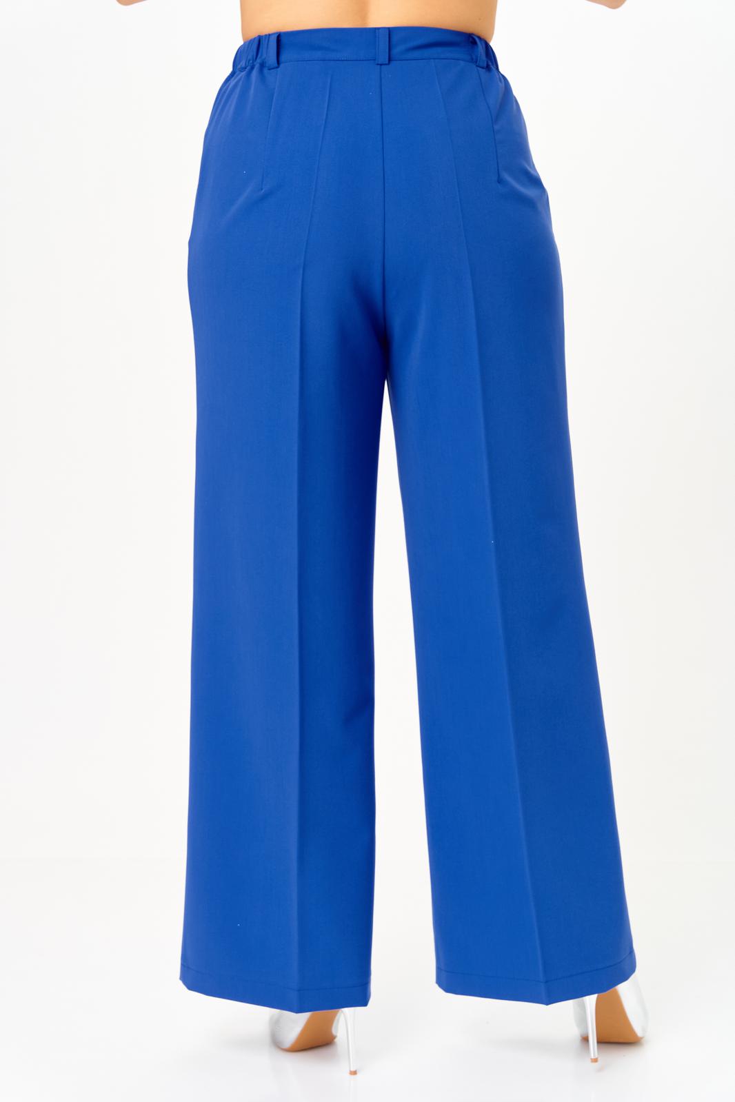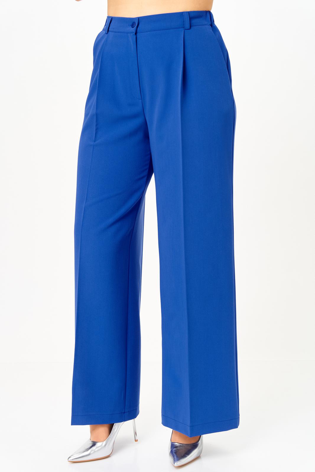 Брюки полной длины, прилегающие в области бедер и свободные в колене и по низу. Брюки со стрелками. По передним половинкам выполнены наклонные карманы. В среднем шве передней половинки обработана застежка на молнию. По задним половинкам обработаны талиевые вытачки. Брюки на притачном поясе с эластичной тесьмой и застежкой на петлю и пуговицу. На поясе обработаны шлевки для ремня.