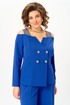 Жакет полуприлегающего силуэта, без подкладки, выполнен из костюмной однотонной ткани, в качестве отделки на бретелях использован материал с люрексом, в качестве декора использованы пуговицы сочетающиеся по цвету с бретелями.
