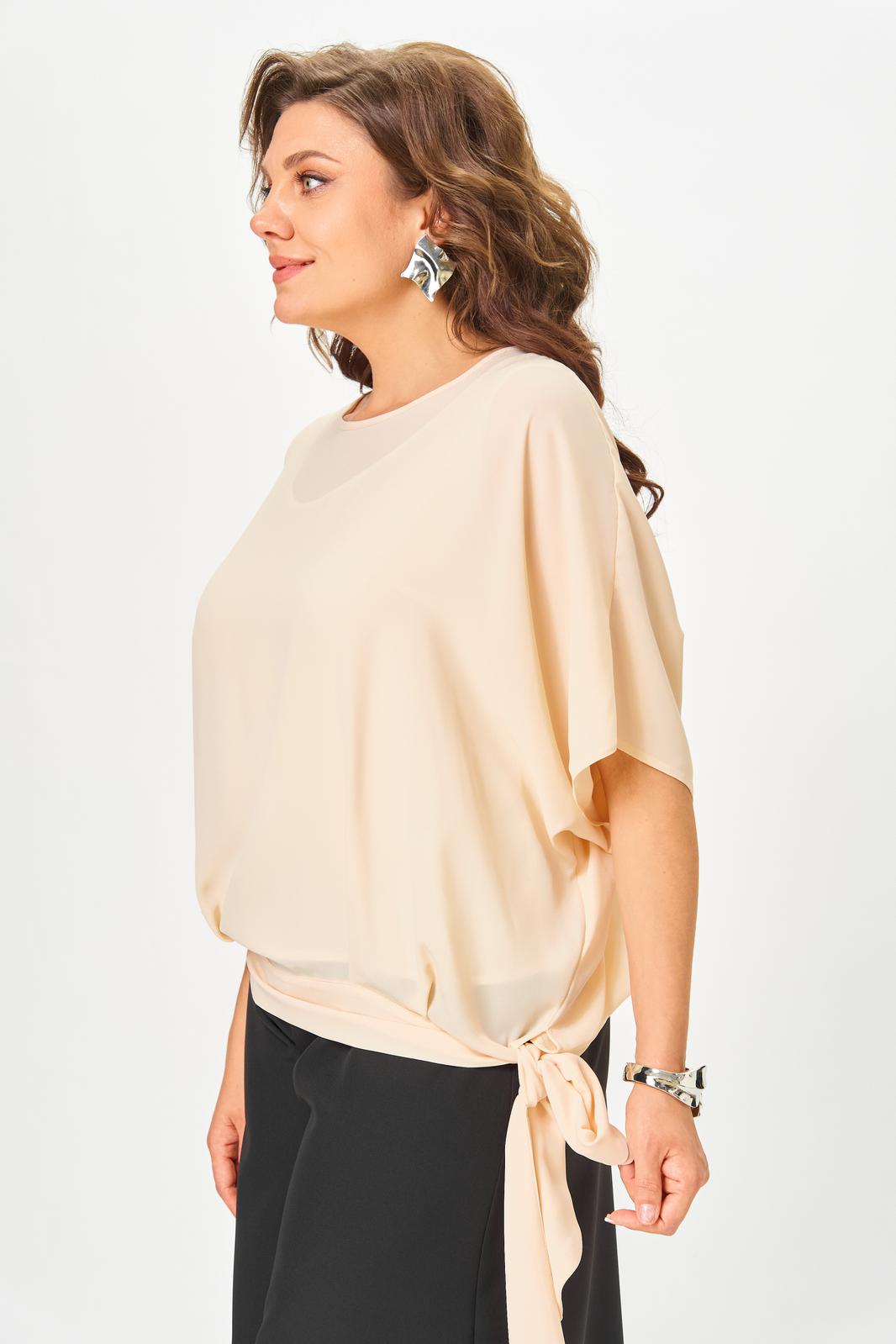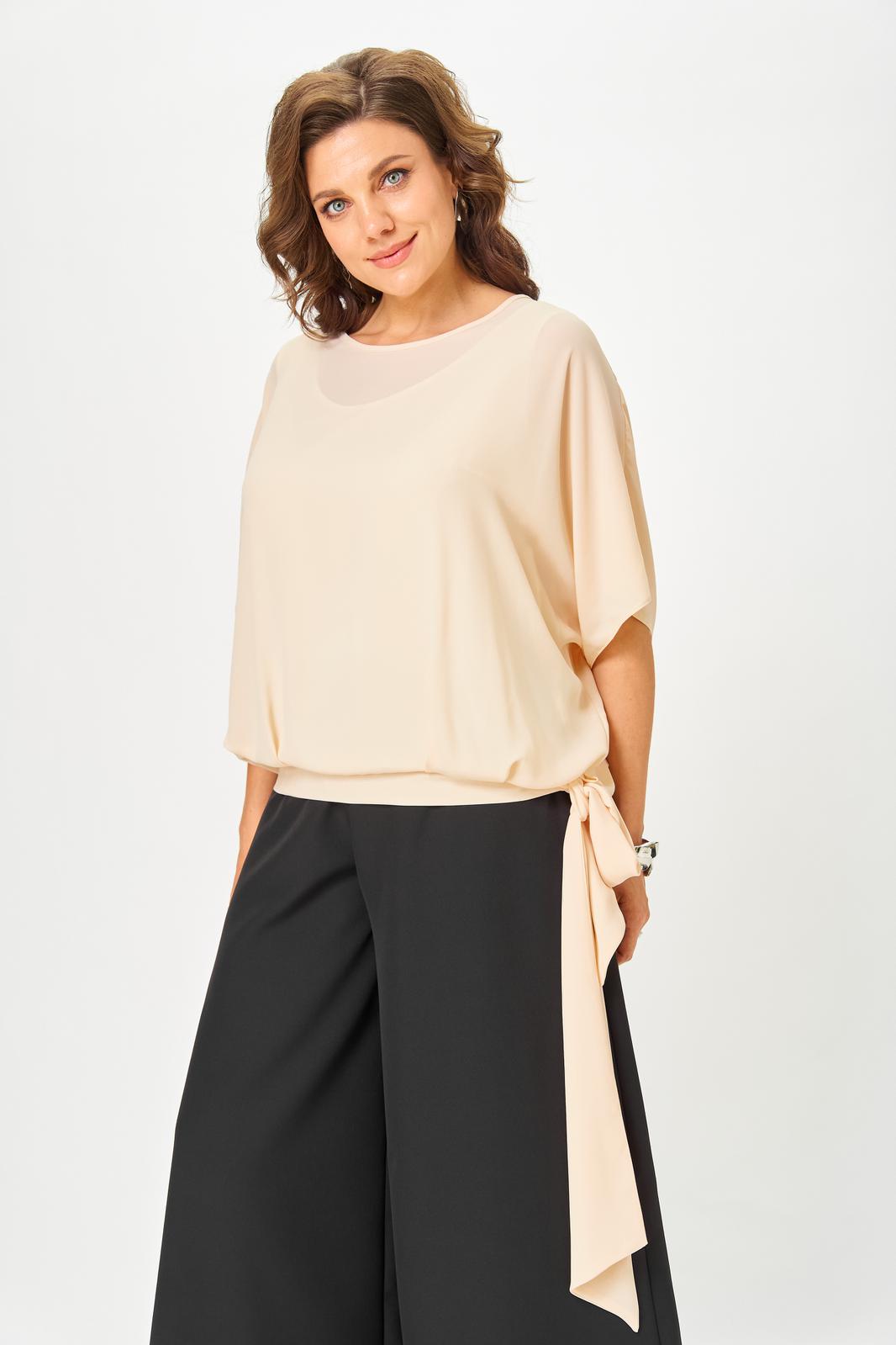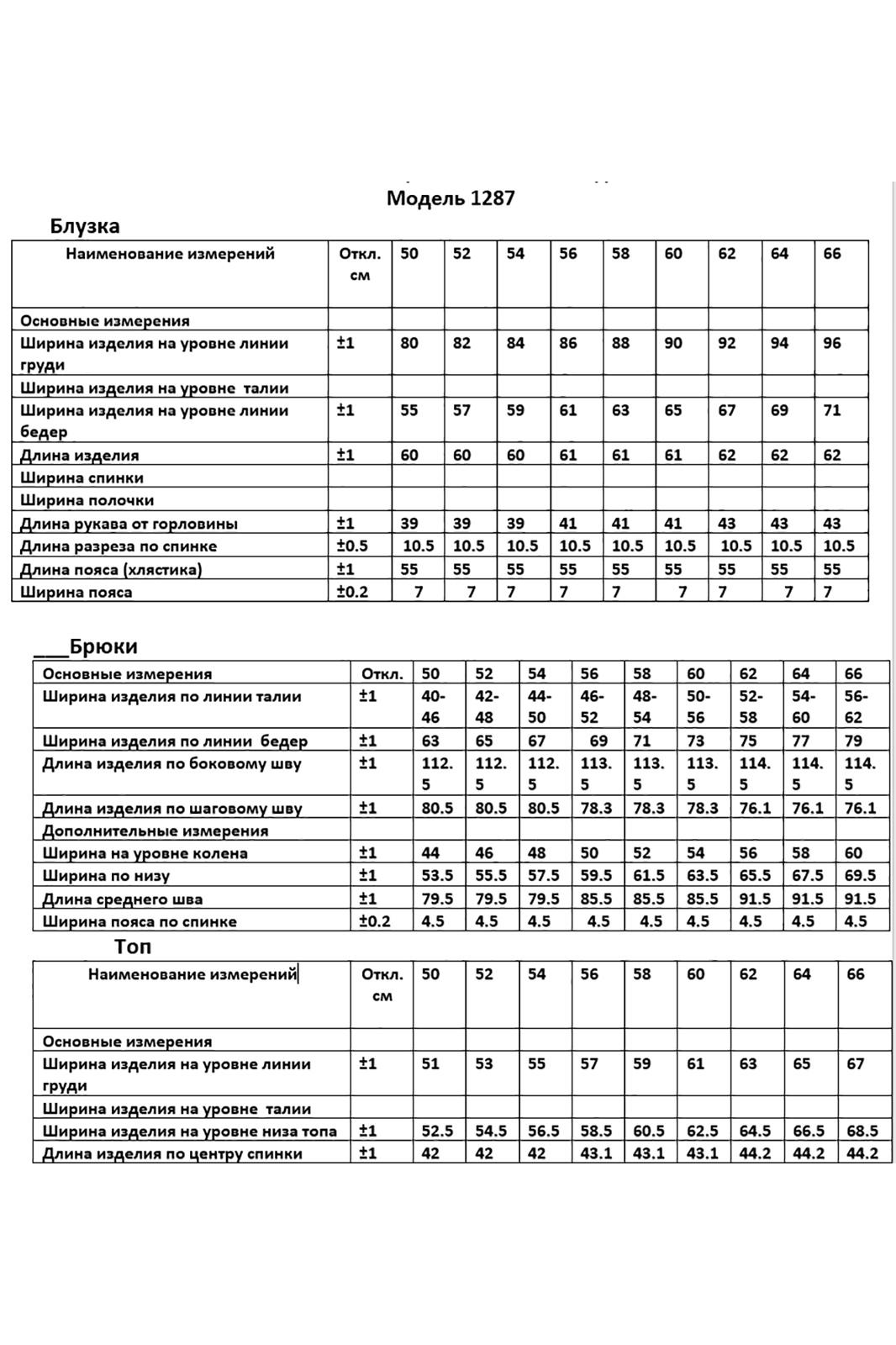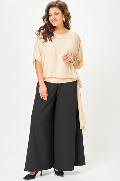 Комплект состоит из блузки топа и брюк. Блузка выполнена из однотонного креп-шифона, топ выполнен из блузочной однотонной ткани, брюки выполнены из однотонной струящейся ткани, контрастной по цвету.