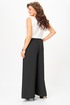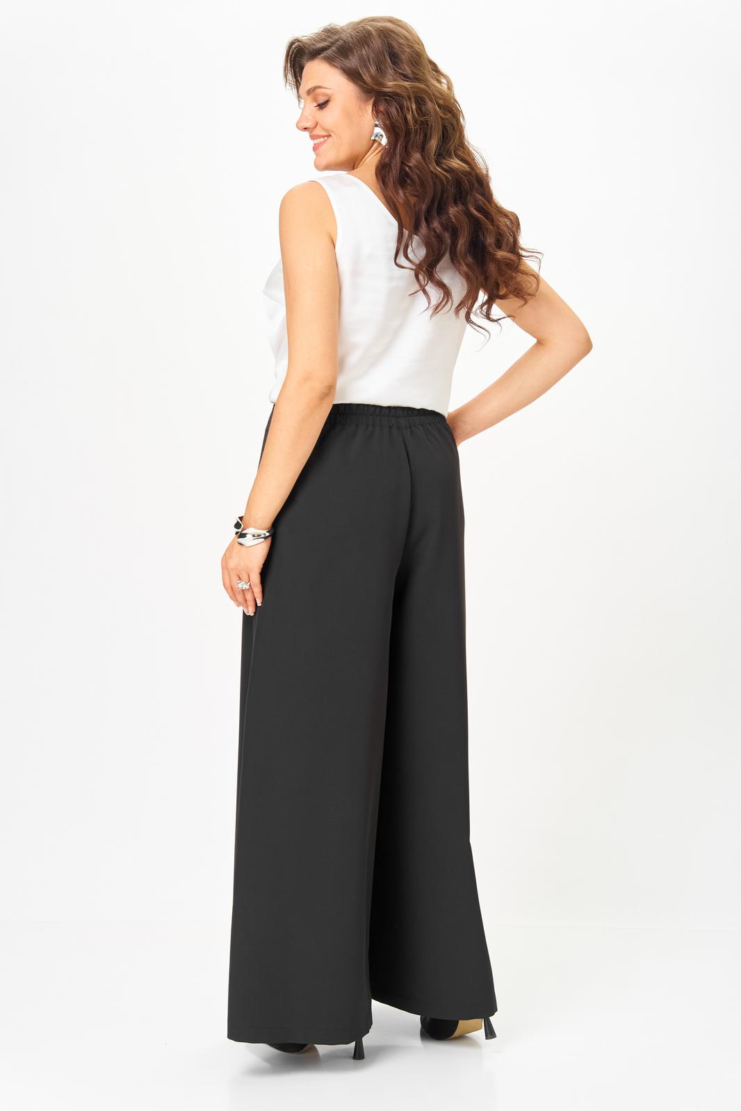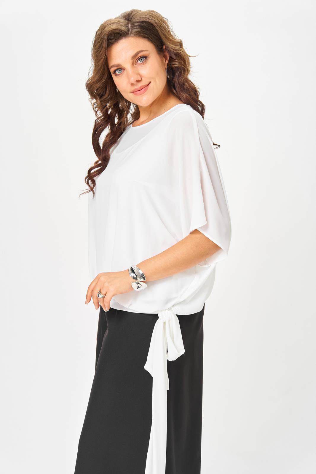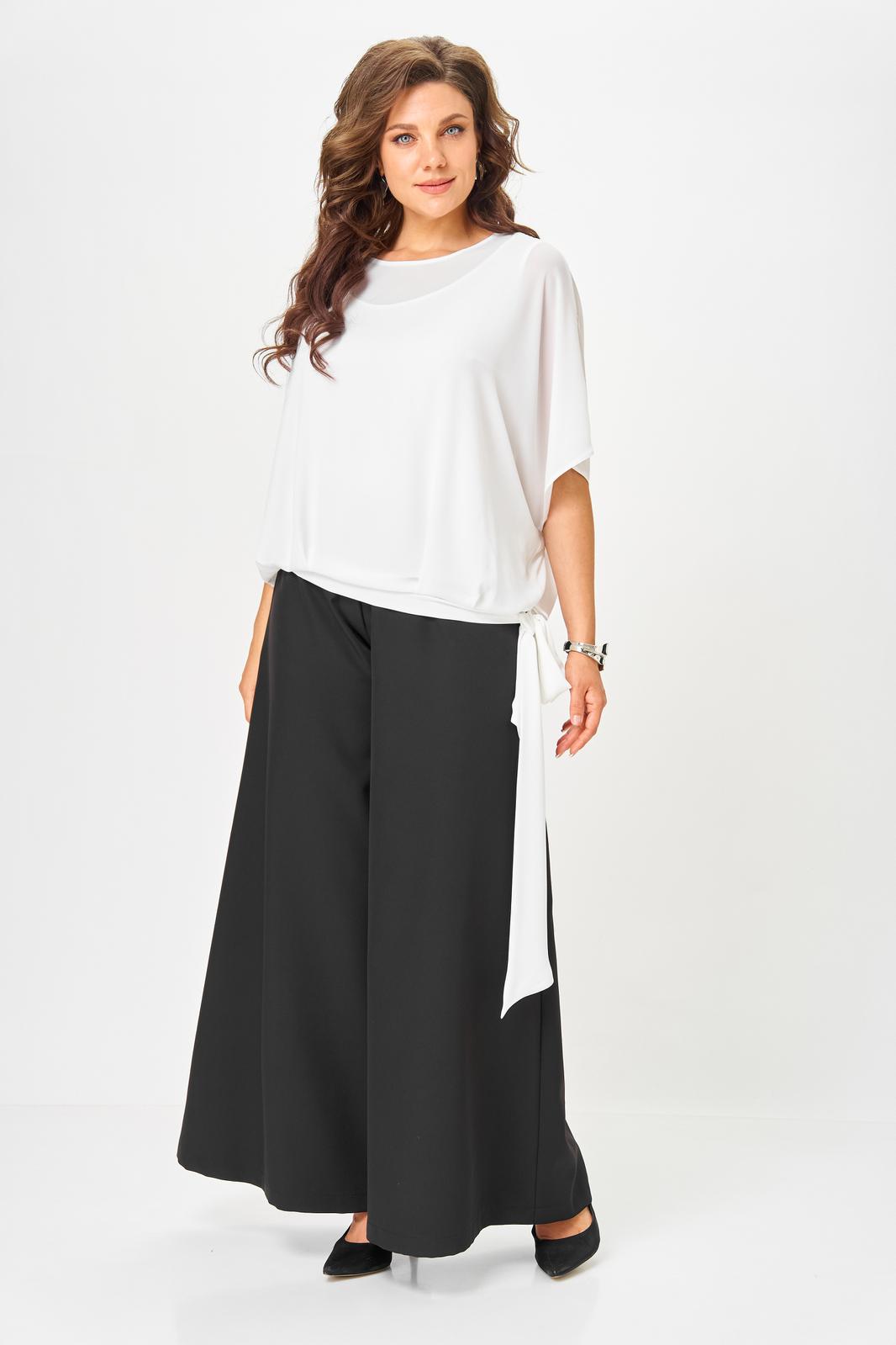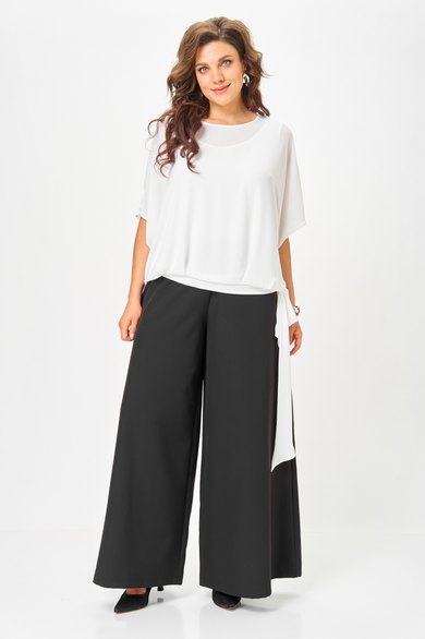 Комплект состоит из блузки топа и брюк. Блузка выполнена из однотонного креп-шифона, топ выполнен из блузочной однотонной ткани, брюки выполнены из однотонной струящейся ткани, контрастной по цвету.