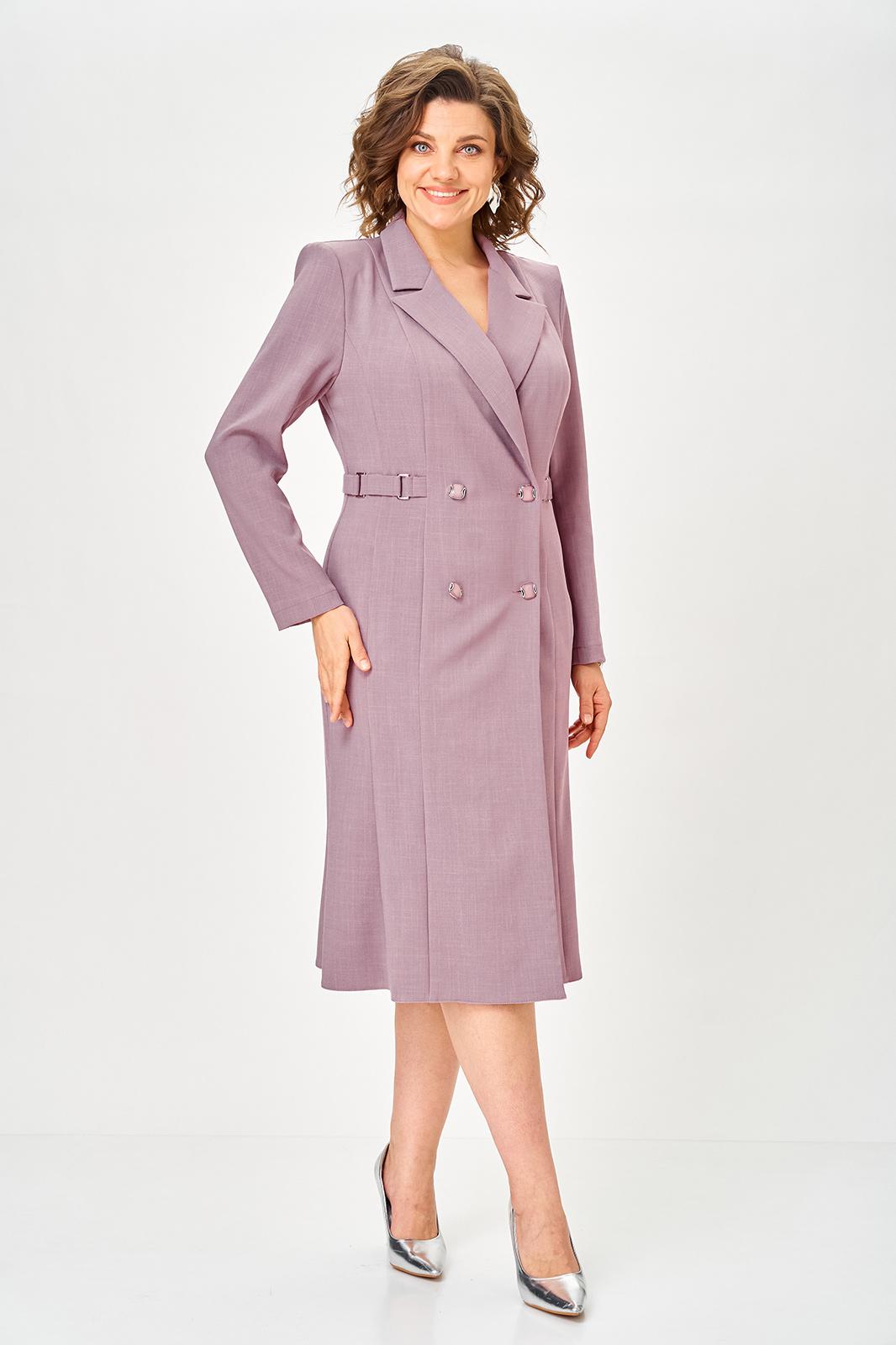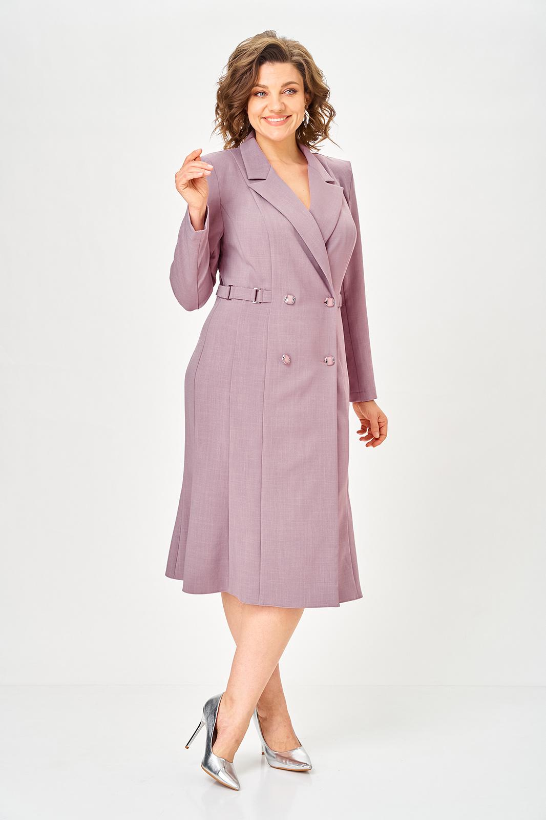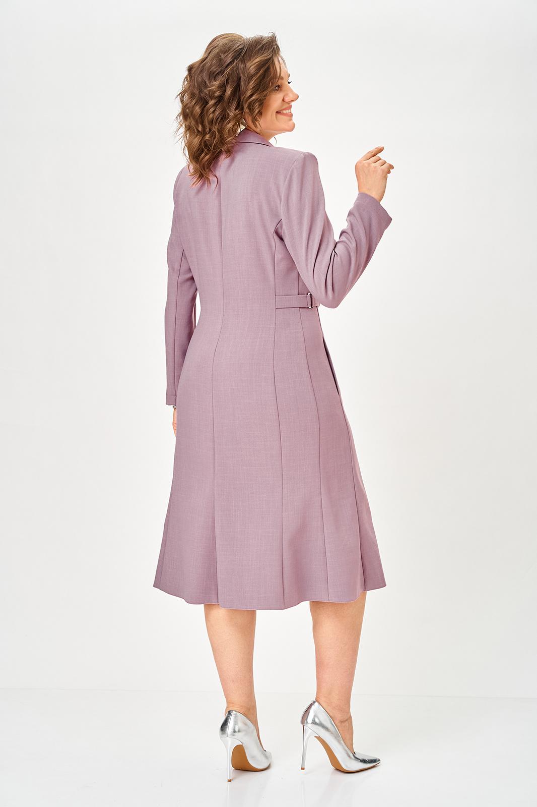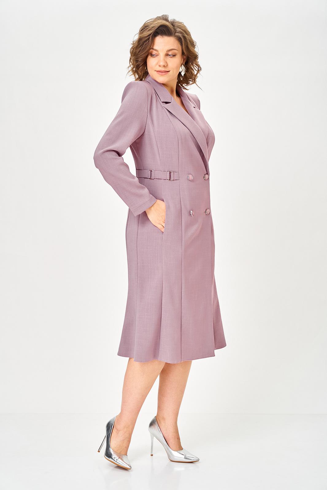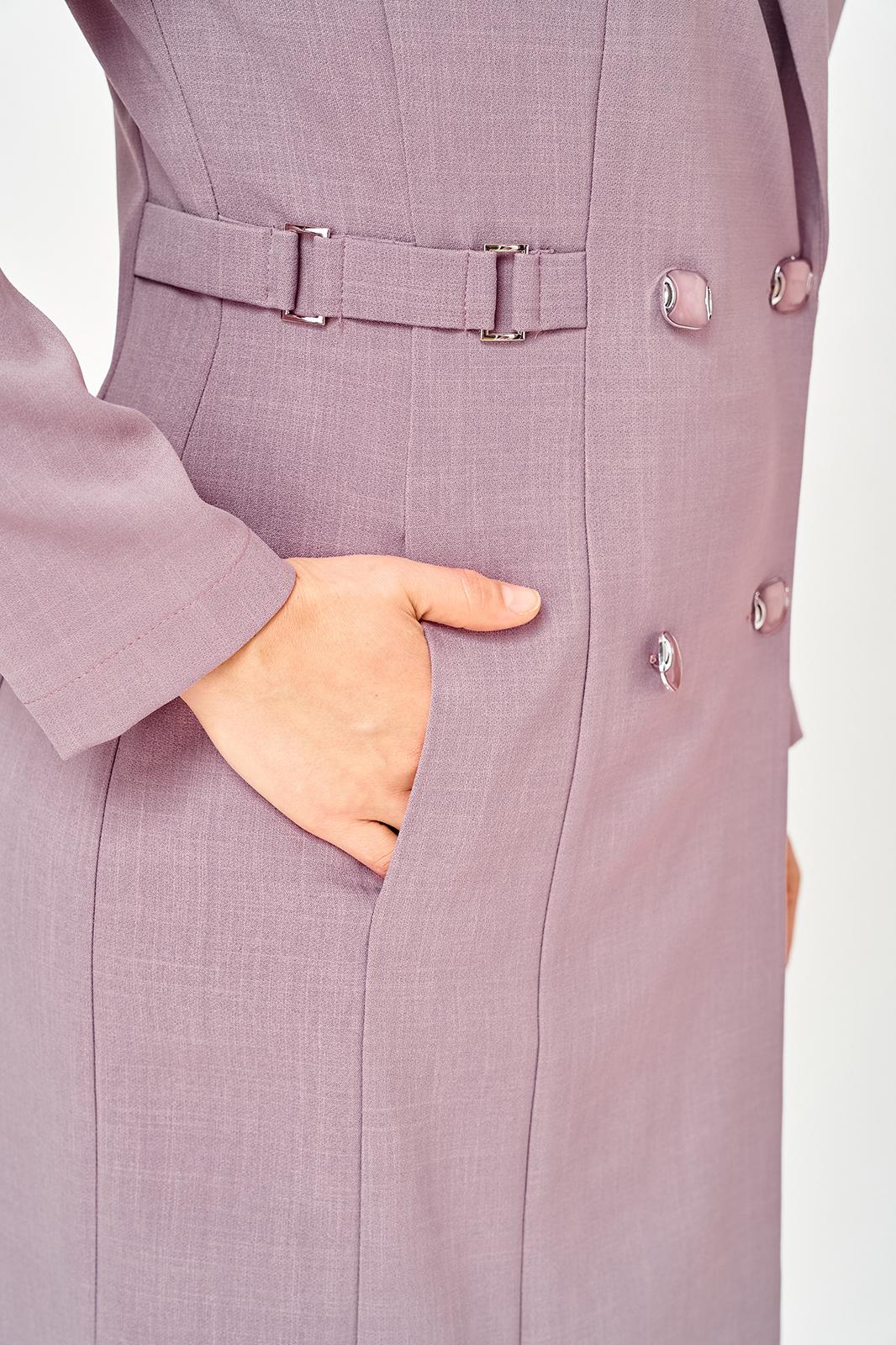 Платье полуприлегающего силуэта, выполнено из однотонной ткани. Платье длиной за колено, с небольшим расклешением по низу. Полочка платья с двубортной застежкой на пуговицы. Полочка с вертикальными рельефами. В шве притачивания бочка к средней части полочки обработан карман. Горловина V-образной формы, с отложными лацканами и воротником пиджачного типа. В области талии выполнен декоративный элемент из хлястиков и металлических рамок.