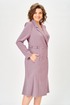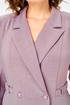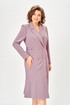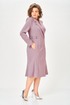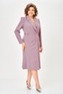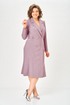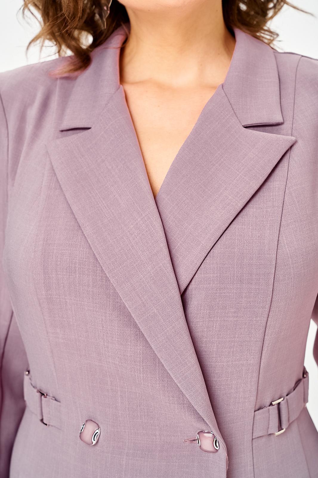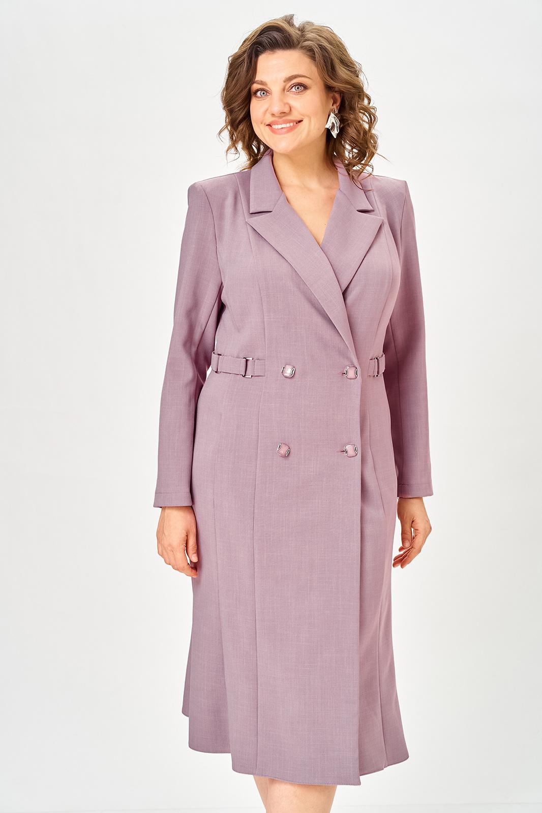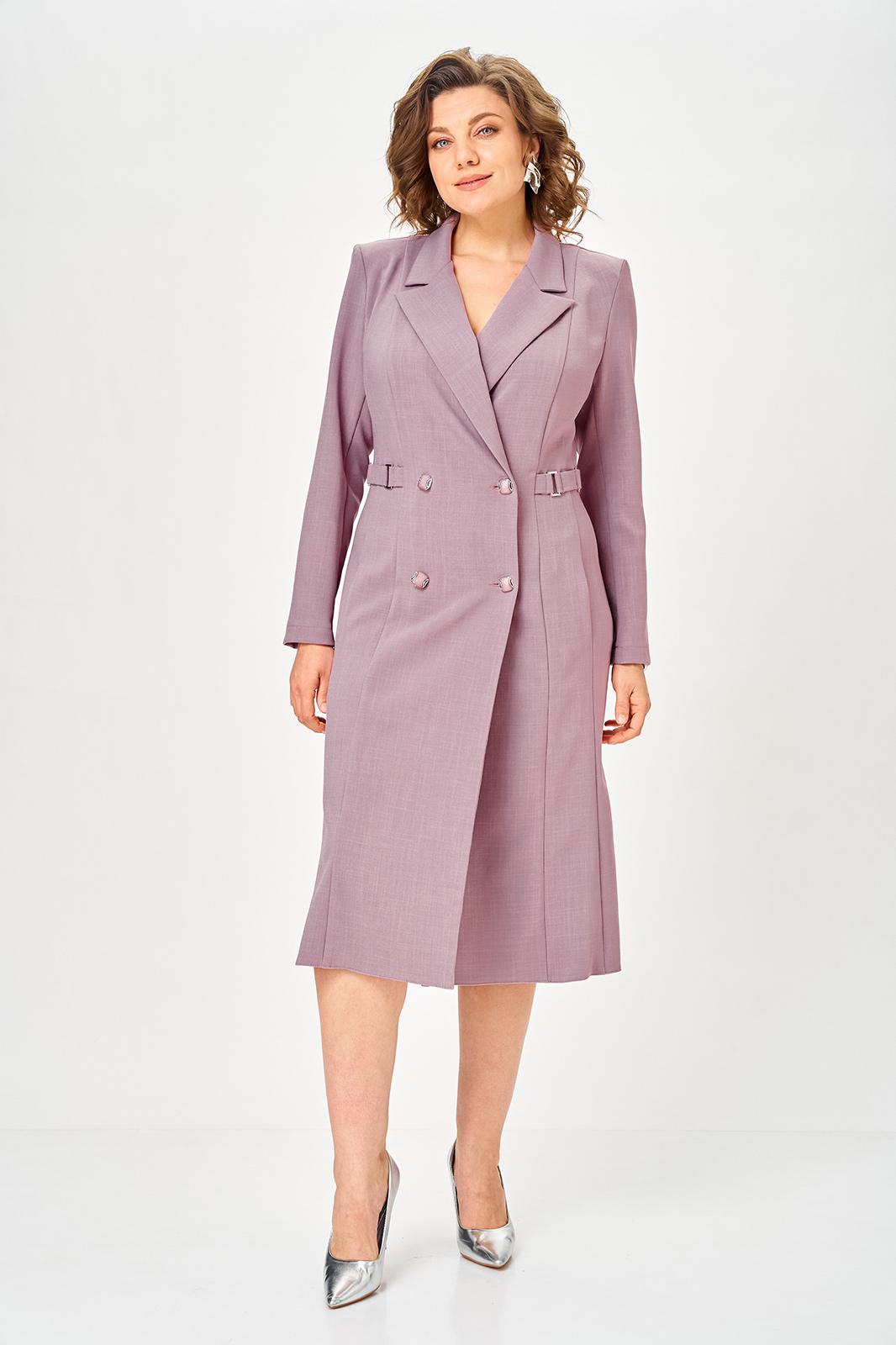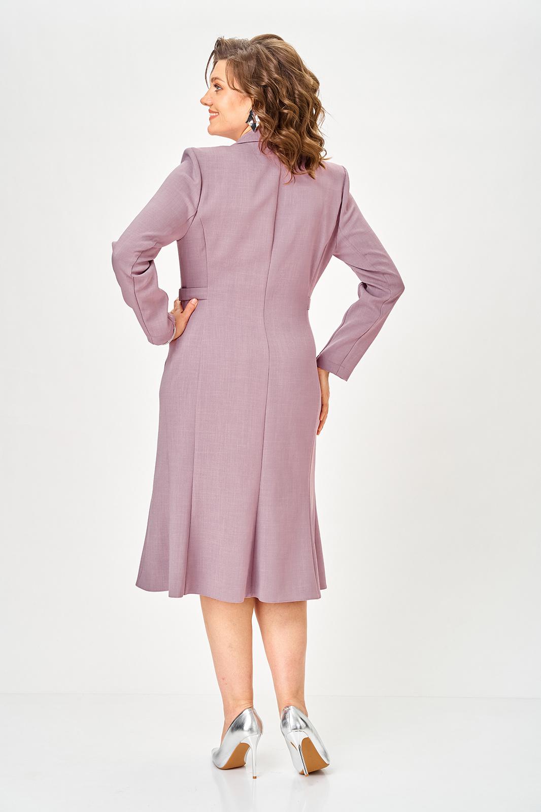 Платье полуприлегающего силуэта, выполнено из однотонной ткани. Платье длиной за колено, с небольшим расклешением по низу. Полочка платья с двубортной застежкой на пуговицы. Полочка с вертикальными рельефами. В шве притачивания бочка к средней части полочки обработан карман. Горловина V-образной формы, с отложными лацканами и воротником пиджачного типа. В области талии выполнен декоративный элемент из хлястиков и металлических рамок.