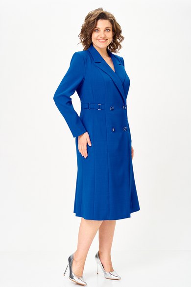 Платье полуприлегающего силуэта, выполнено из однотонной ткани. Платье длиной за колено, с небольшим расклешением по низу. Полочка платья с двубортной застежкой на пуговицы. Полочка с вертикальными рельефами. В шве притачивания бочка к средней части полочки обработан карман. Горловина V-образной формы, с отложными лацканами и воротником пиджачного типа. В области талии выполнен декоративный элемент из хлястиков и металлических рамок.