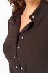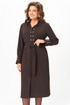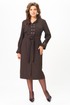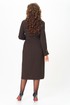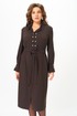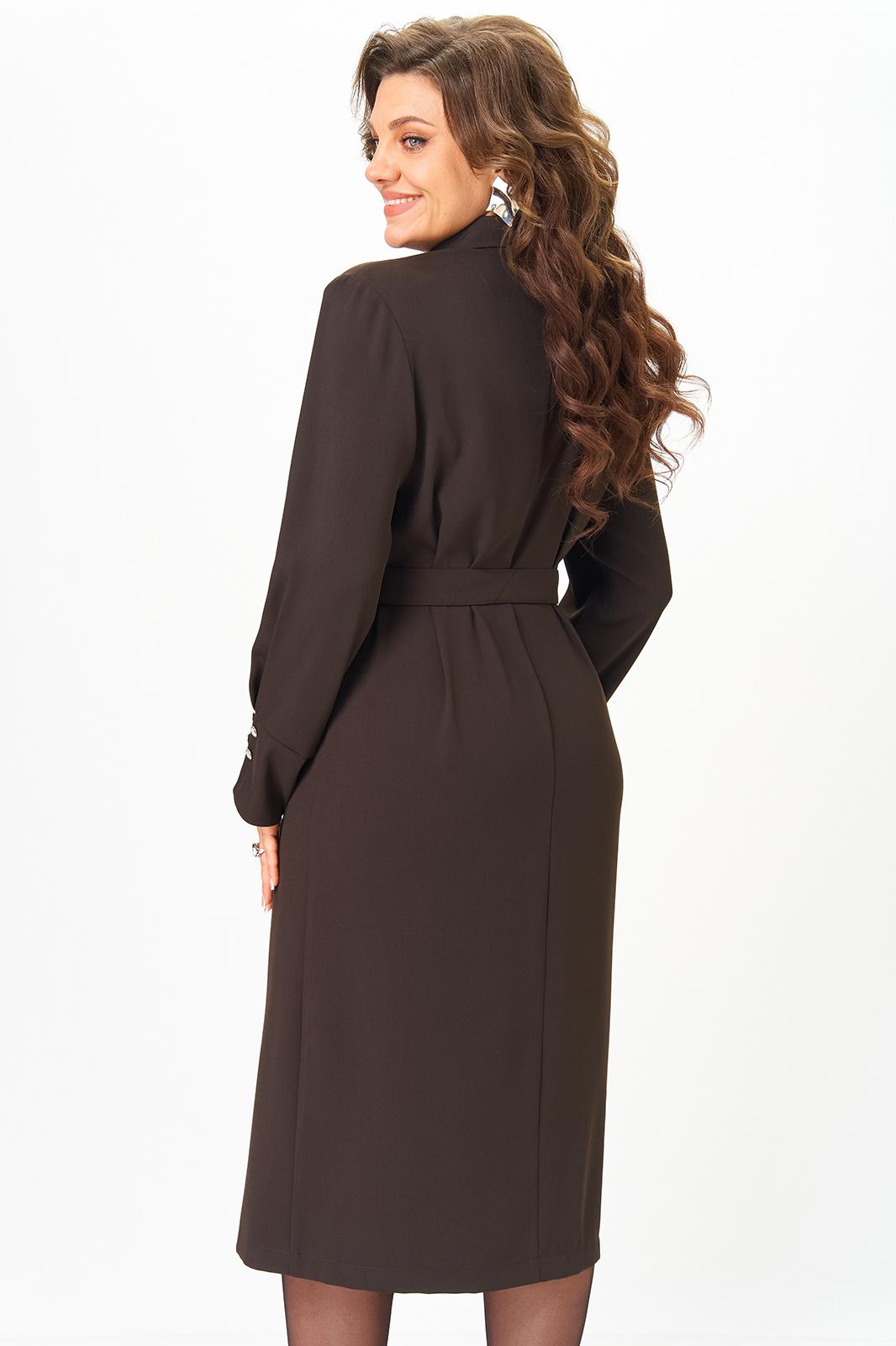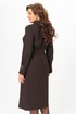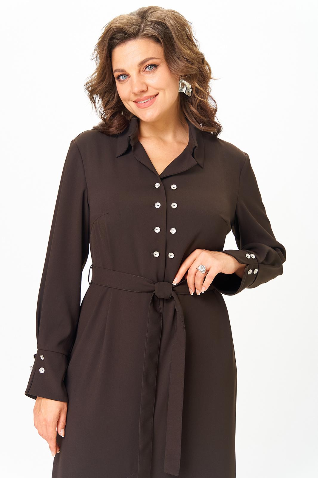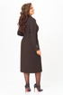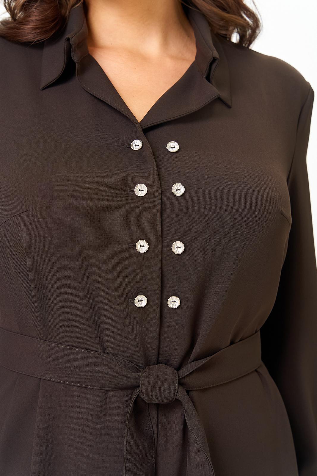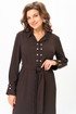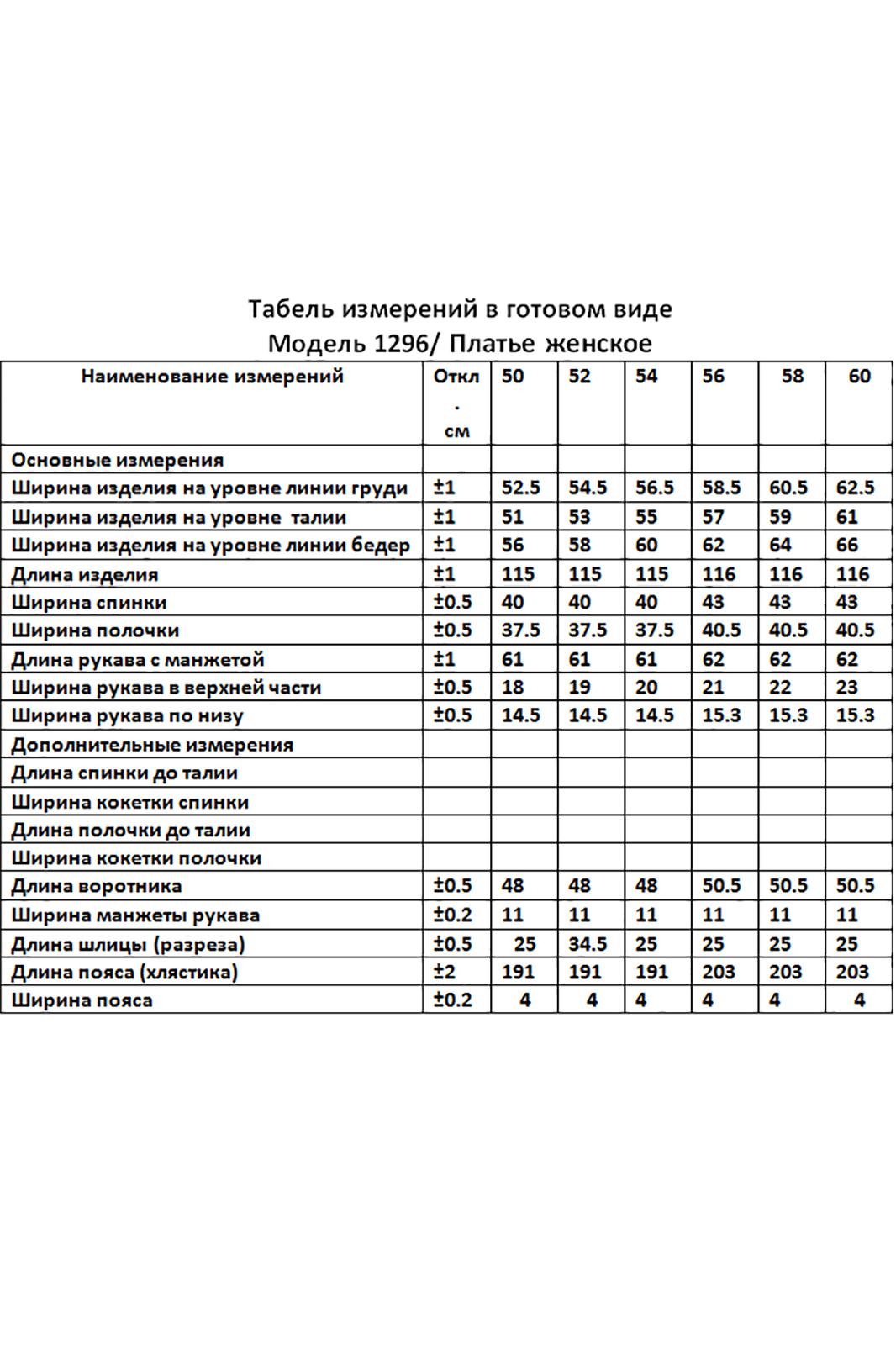 Полочка платья с центральным швом, в верхней части которого выполнена оригинальная застежка на петли и пуговицы, в нижней части центрального шва полочки обработана шлица. Полочка с нагрудными вытачками. Горловина круглой формы с воротником рубашечного типа. Спинка со средним швом. Рукав втачной, одношовный, длинный, по низу со складкой и притачной манжетой. Манжета с разрезом по низу и декором из пуговиц.
