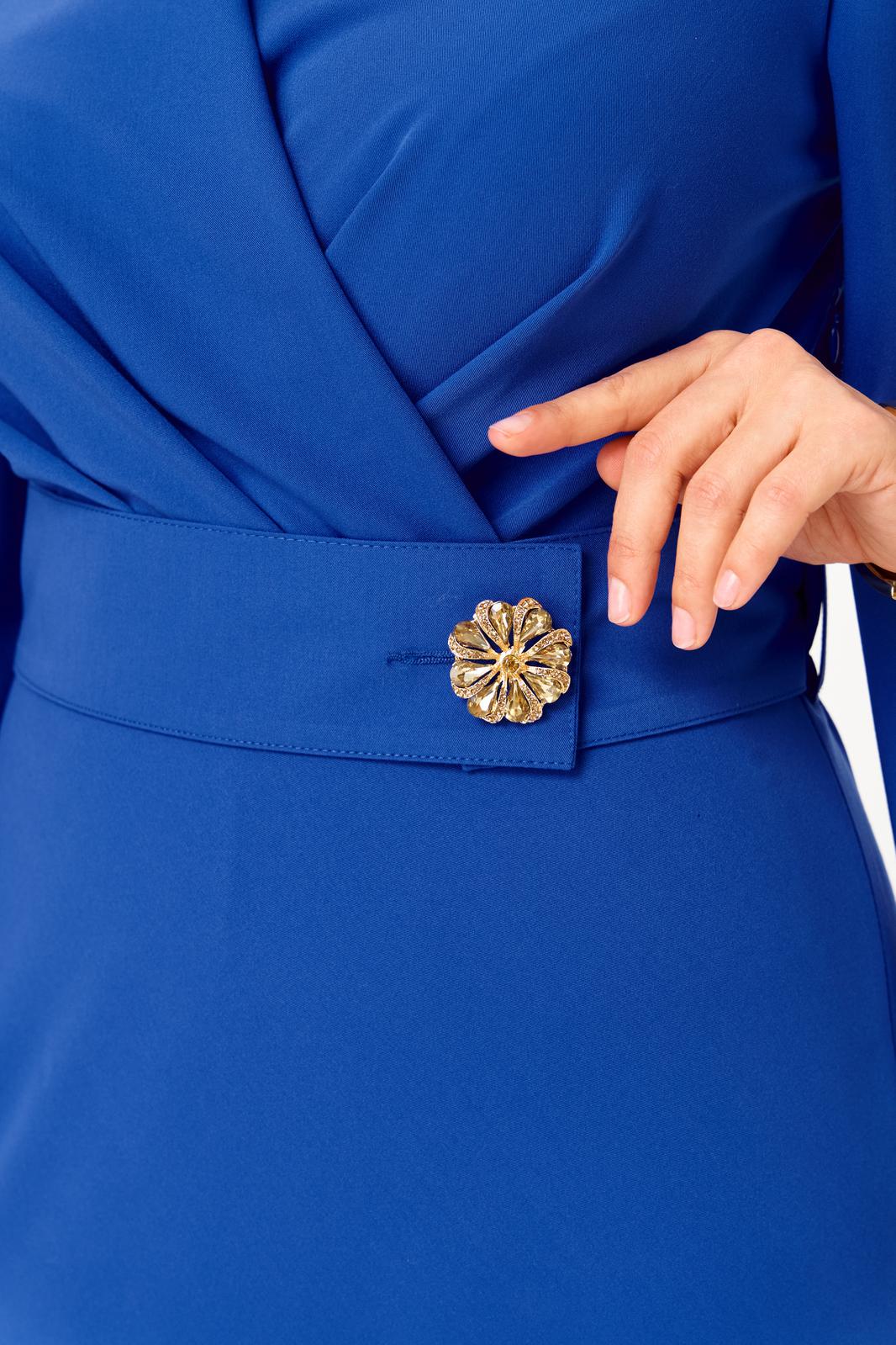 Платье отрезное по линии талии. Полочка с иммитацией запаха и складками по линии талии. Горловина V-образной формы. Спинка с талиевыми вытачками. Рукав втачной, обьемный к низу, с драпировкой. Юбка полуприлегающая по бедрам, свободная и широкая по низу. По боковым швам в области талии настрочены шлевки, через которые продет пояс, крепящийся на пуговицу.