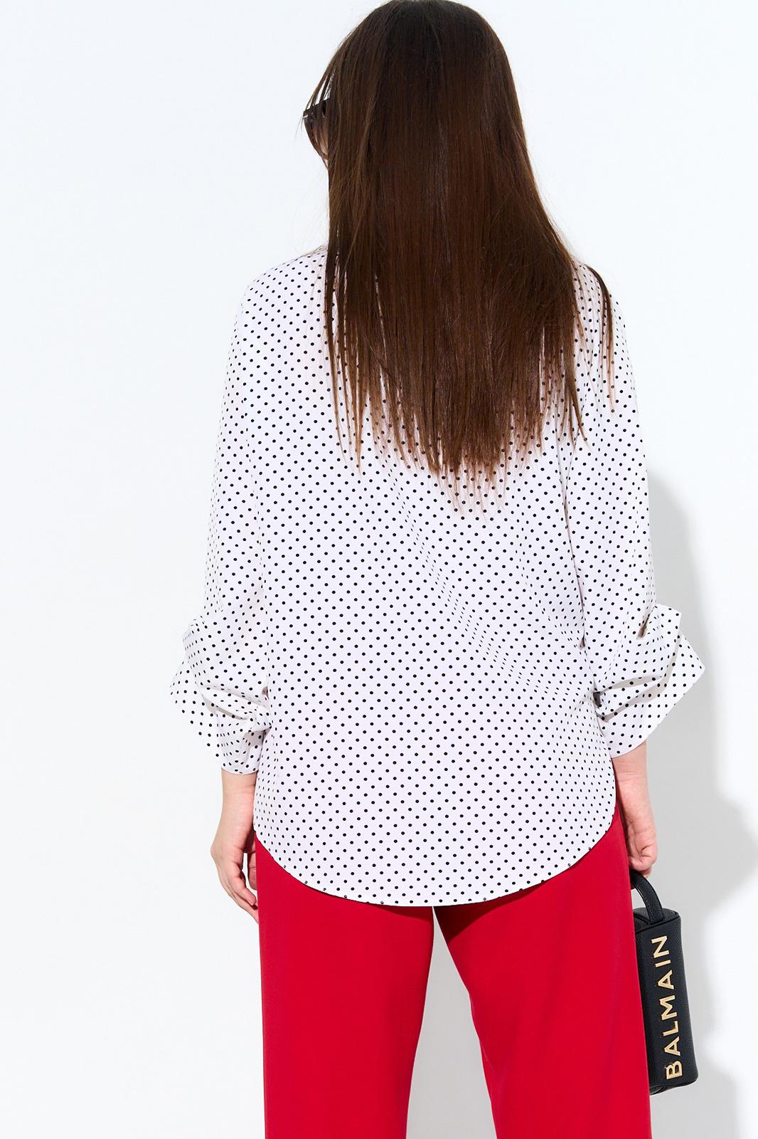 Блузка женская из текстильной, блузочной ткани. Модель прямого силуэта, рукав углублённый , рубашечного типа. Перед идет с запахом, низ блузы ассиметричный, по полочке углы, спинка закруглённая, удлинённая. По рукаву идут защипы. По горловине полочки пришит логотип бренда. Длина по спинке: 82 см. Длина рукава: 47 см