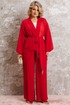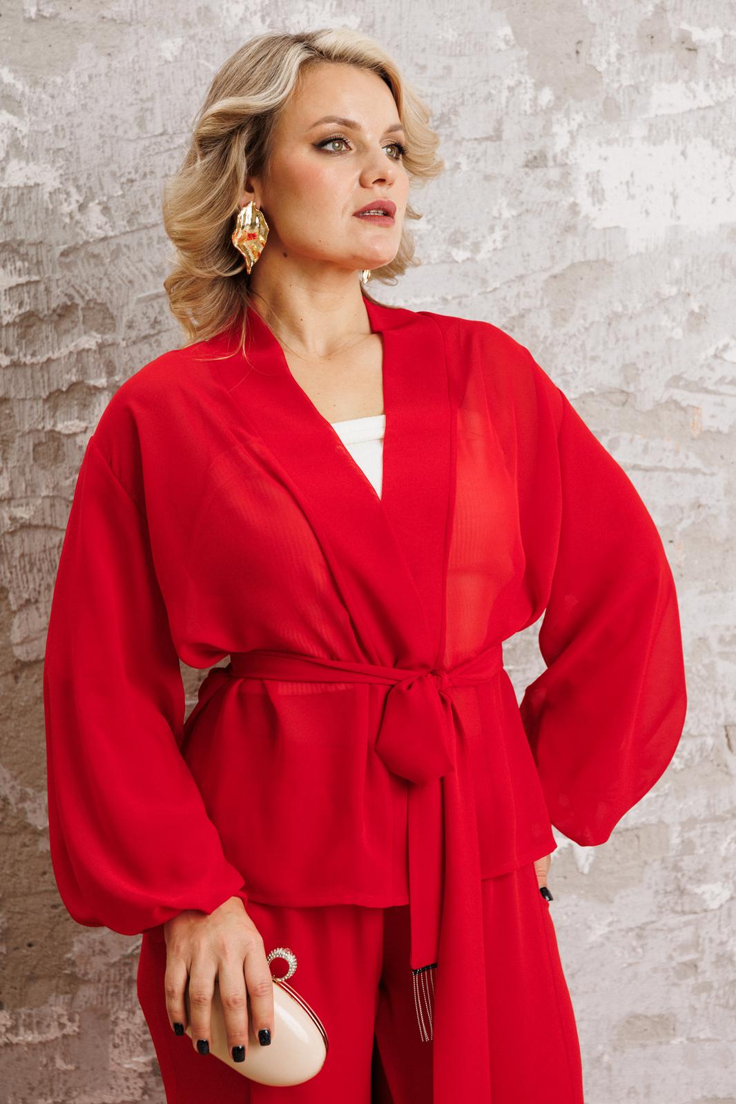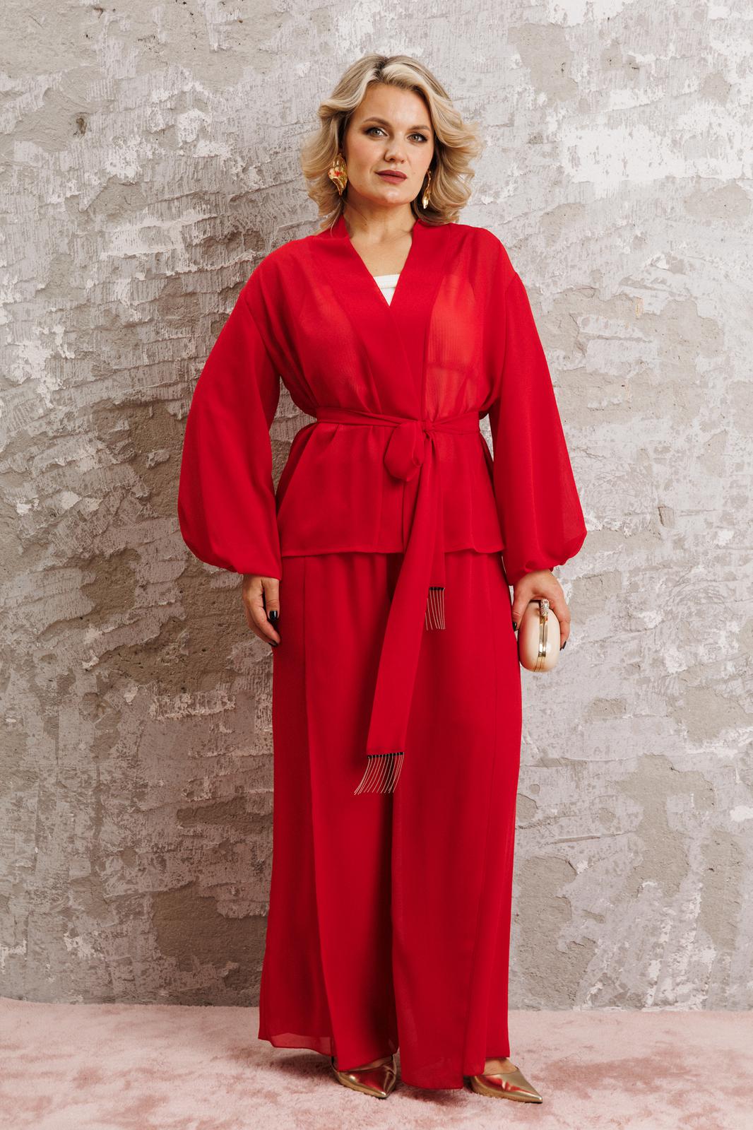 Элегантный вечерний костюм-двойка из шифона, состоящий из блузки свободного кроя и широких брюк. Красивый и эффектный брючный костюм - это идеальный образ для особых случаев, вечерних выходов, праздничных и торжественных мероприятий, будь то корпоратив, свадьба, юбилей, выпускной, день рождения, Новый год Блузка прямого силуэта из шифона со пущенной линией плеча. Рукав двойной, расширенный к низу со складками. По спинке и полочке идет планка. В комплекте с блузкой идет съемный пояс. На концах пояса металлизированная бахрома. Брюки прямые на трикотажной подкладке масло, с запахом по переду, пояс на резинке.Благодаря фасону и крою, костюм визуально вытянет силуэт, сделает фигуру стройнее, подчеркнет ее достоинства, скроет недостатки. Элегантный брючный костюм от Anastasia- комфорт и уверенность в себе на любом мероприятии Длина блузки: (48-56)-61см. Длина рукава-52см. Длина брюк:(48-54)-105см., (56)-108см.