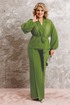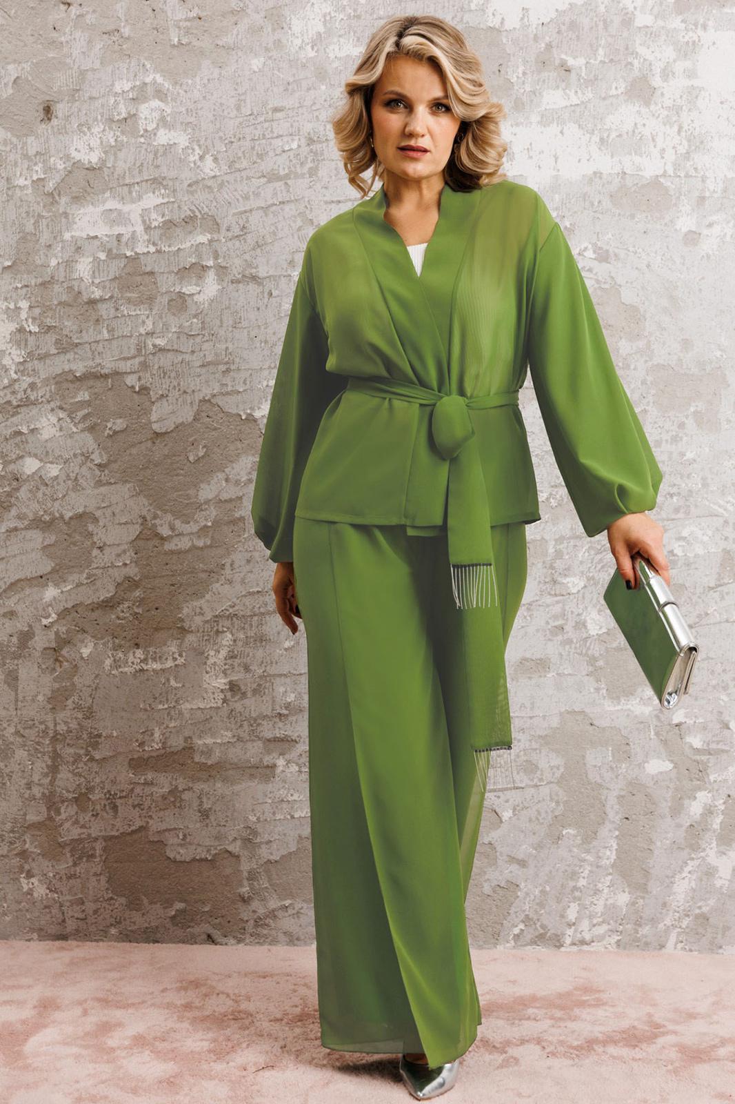 Элегантный вечерний костюм-двойка из шифона, состоящий из блузки свободного кроя и широких брюк. Красивый и эффектный брючный костюм - это идеальный образ для особых случаев, вечерних выходов, праздничных и торжественных мероприятий, будь то корпоратив, свадьба, юбилей, выпускной, день рождения, Новый год Блузка прямого силуэта из шифона со пущенной линией плеча. Рукав двойной, расширенный к низу со складками. По спинке и полочке идет планка. В комплекте с блузкой идет съемный пояс. На концах пояса металлизированная бахрома. Брюки прямые на трикотажной подкладке масло, с запахом по переду, пояс на резинке.Благодаря фасону и крою, костюм визуально вытянет силуэт, сделает фигуру стройнее, подчеркнет ее достоинства, скроет недостатки. Элегантный брючный костюм от Anastasia- комфорт и уверенность в себе на любом мероприятии Длина блузки: (48-56)-61см. Длина рукава-52см. Длина брюк:(48-54)-105см., (56)-108см.