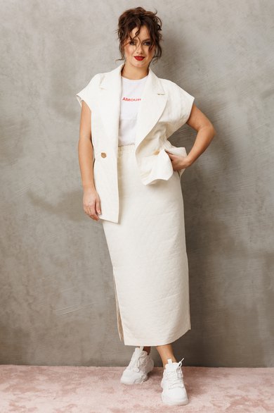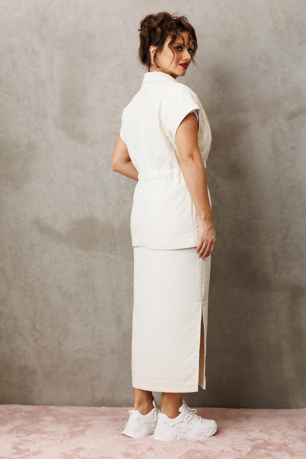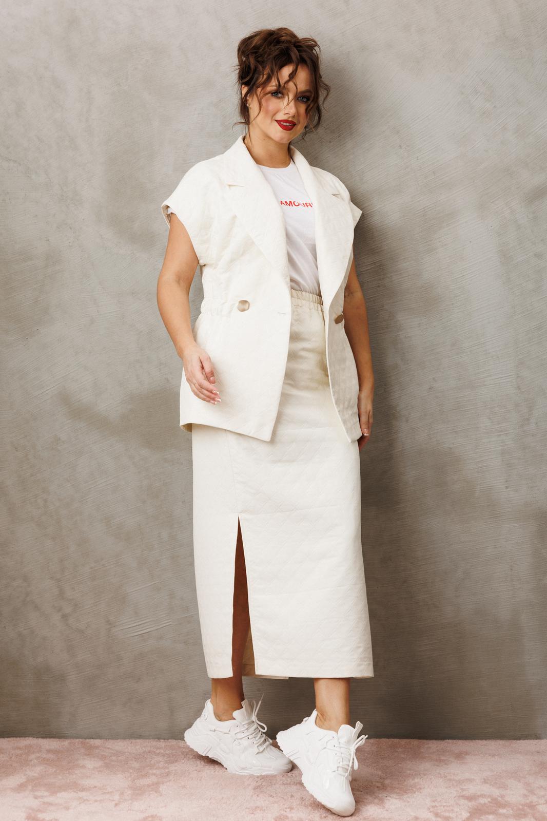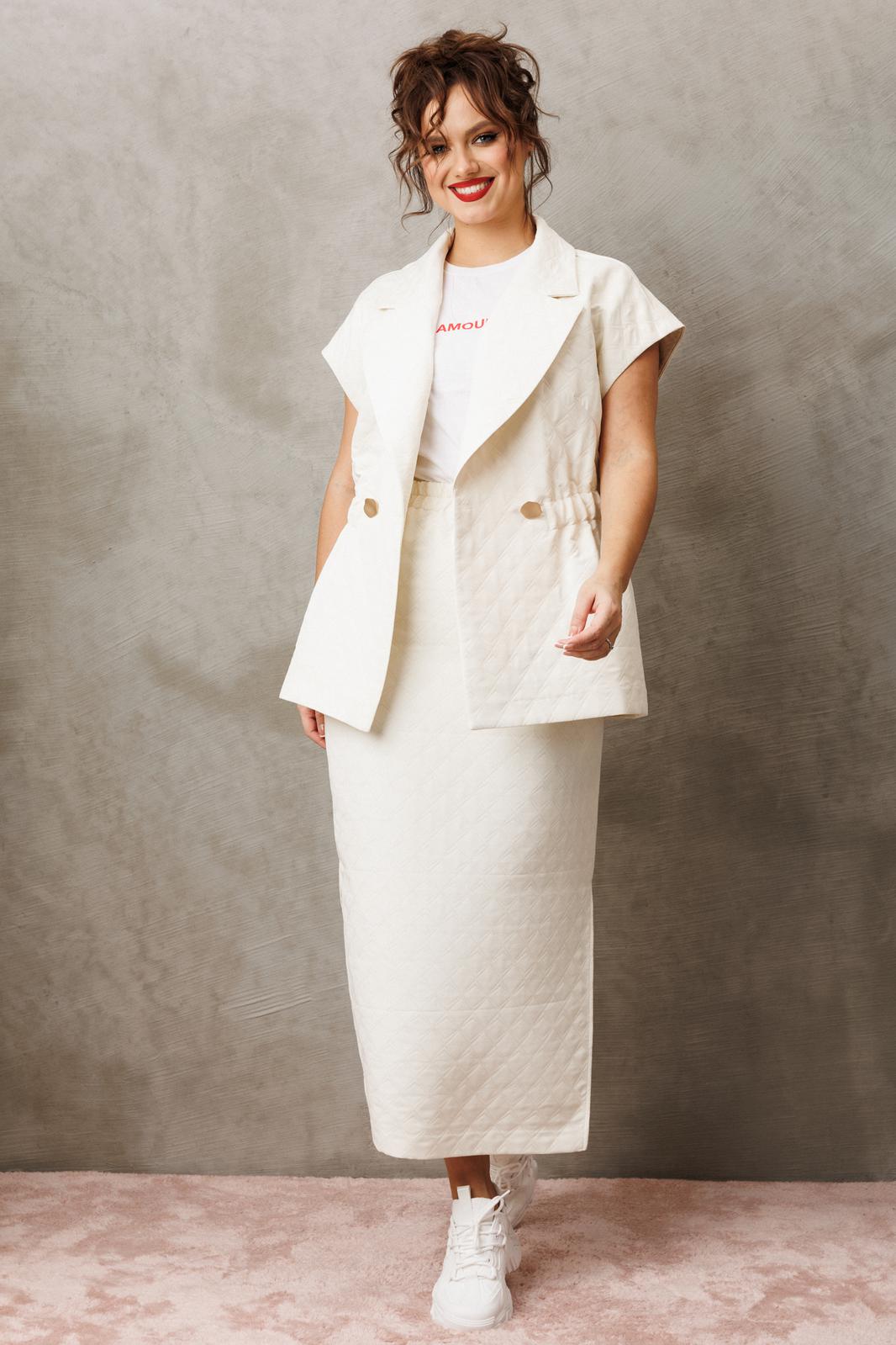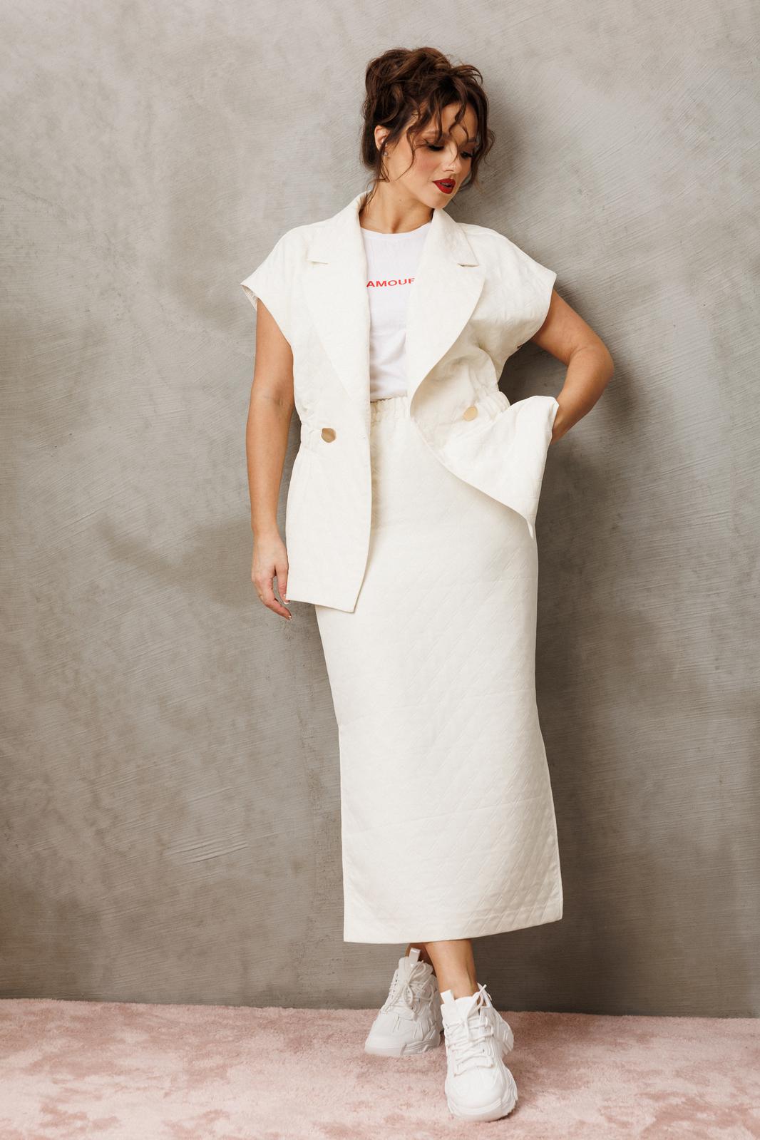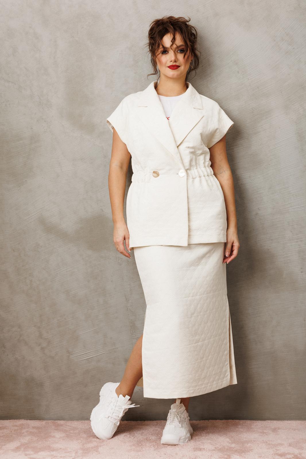Бренд белорусской женской одежды больших размеров Anastasia представляет костюм двойку. Костюм женский 2-х предметный (жилет, юбка) из стеганной ткани станет отличным дополнением к Вашему гардеробу. Подойдет для повседневной носки (работа, офис, прогулки). Достаточно дополнить его соответствующими предметами из вашего гардероба: блузка, майка, водолазка, гольф, свитер, лонгслив, свитшот. Жилет прямого силуэта, со спущенным плечом. Может быть самостоятельным элементом гордерба. Застежка двухбортная, воротник английского типа. По полочке идет грудовая выточка из бокового шва, по спинке средний шов, по талии кулиска-резинка, по бокам -карманы. Юбка-макси, зауженная к низу, по бокам разрезы. Пояс отрезной на резинке. Благодаря своему крою и фасону костюм подчеркивает женственные формы и скрывает то, что должно быть незаметным. Это повседневный вариант на каждый день для занятий в школе или для офиса, на работу или на прогулку. Наденьте его на деловую встречу, официальное мероприятие, школьное торжество. Модель подойдёт для образа в университет или колледж. Этот предмет одежды подчеркнет вашу элегантность и сделает образ более женственным. Длина по спинке (48-52)-70см, (54-58)-71 см. Длина юбки (48-58) - 88см.
