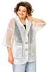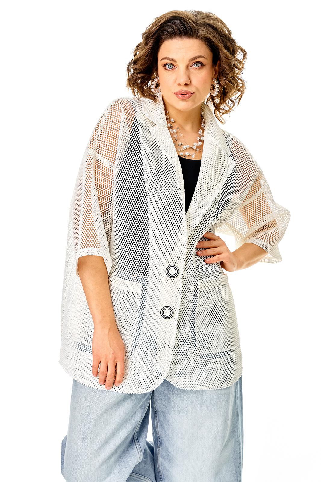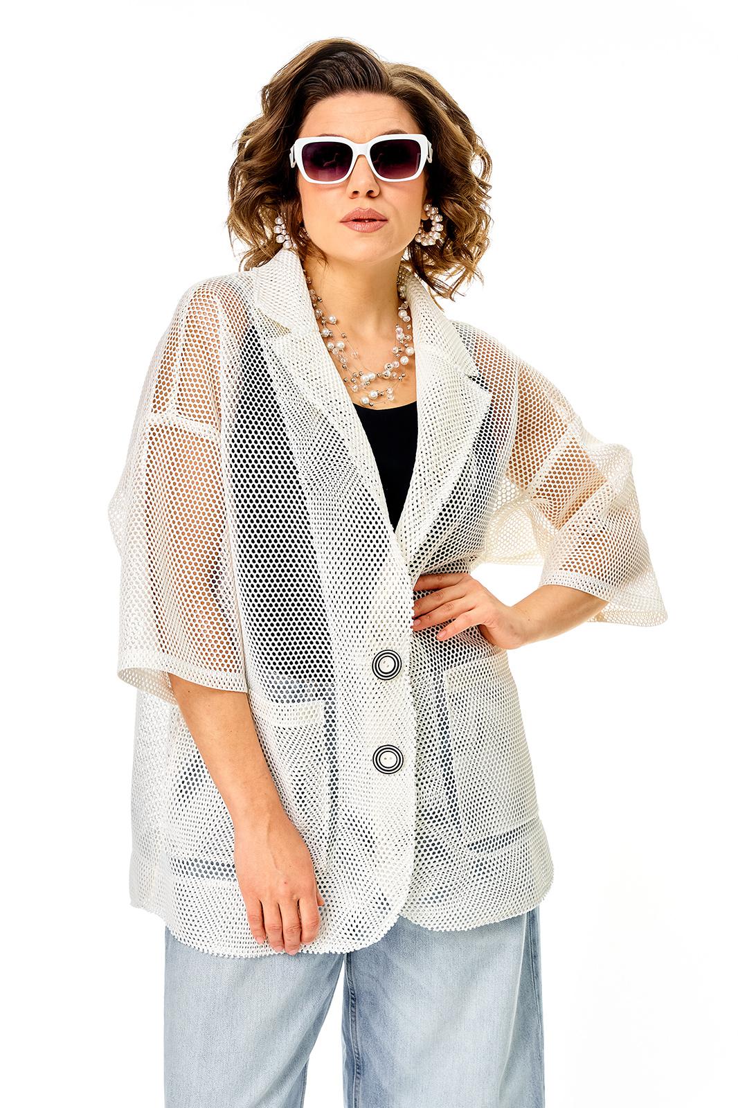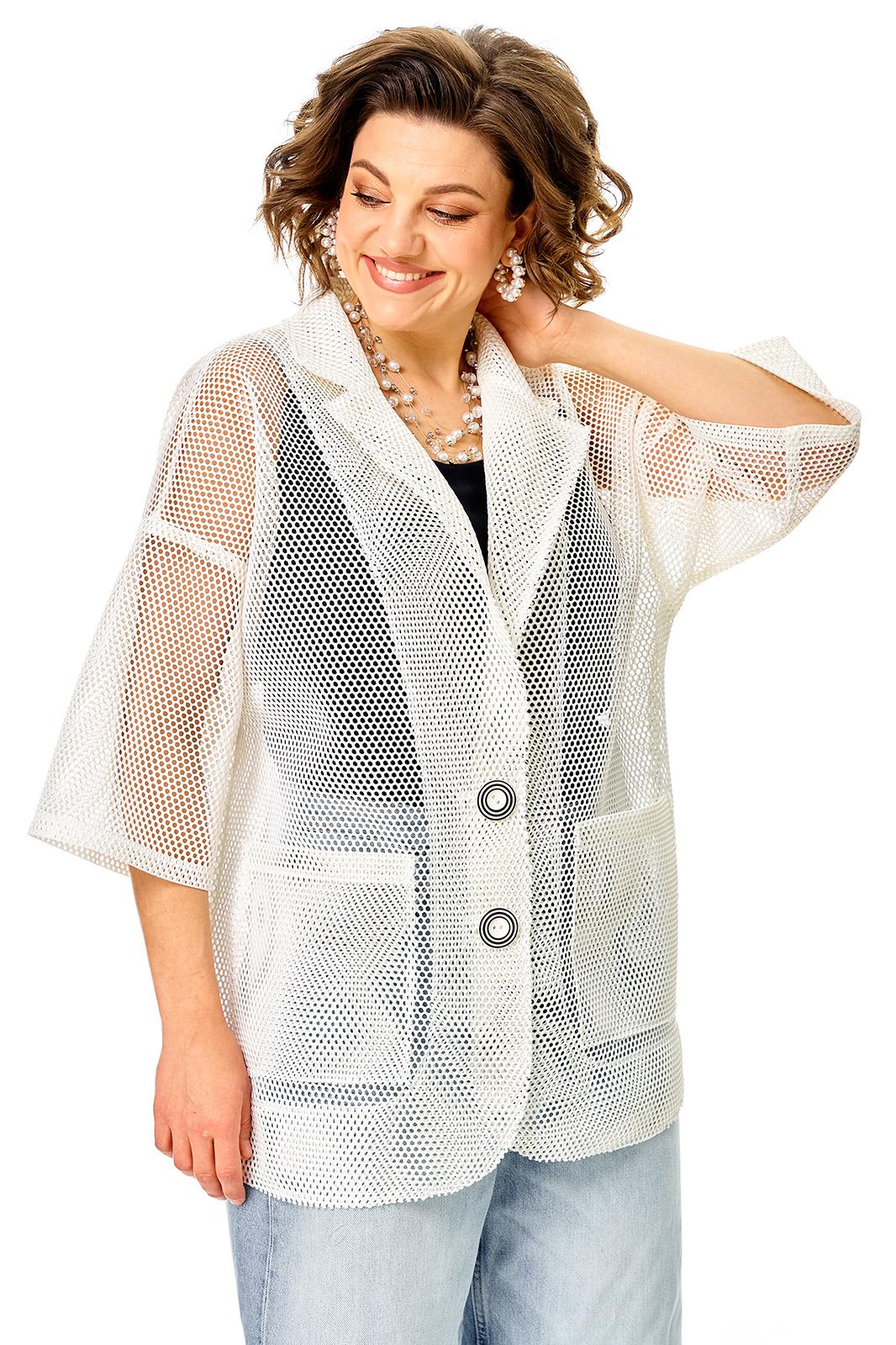Жакет женский из оригинального трикотажного полотна, напоминающего объемные соты, станет отличным дополнением к вашему гардеробу. Модель прямого силуэта со спущенным рукавом, рукав 3/4 длины, застежка на петлю и пуговицу, воротник пиждачного типа. По полочке идут накладные карманы, низ фигурный. Все шва и срезы не обработаны. Длина рукава: (50-66)-28 см. Длина по спинке : (50-54)-76 см., (56-60)-78 см, (62-66)-80 см