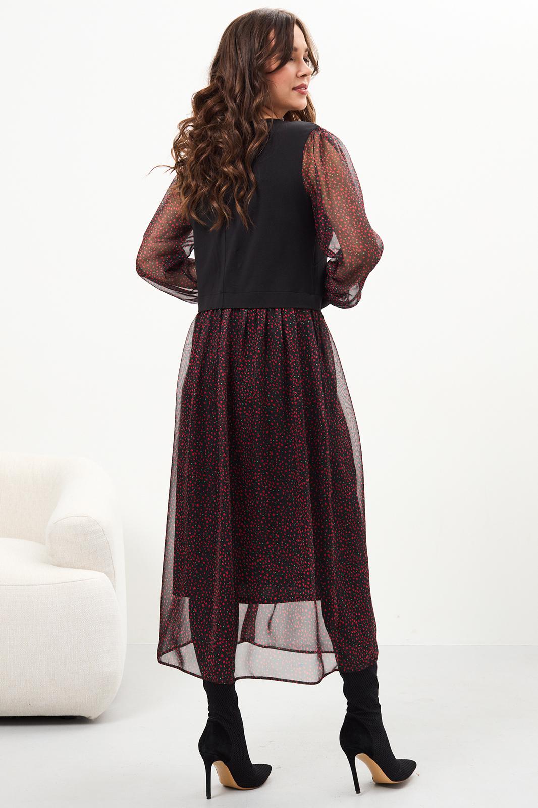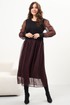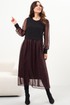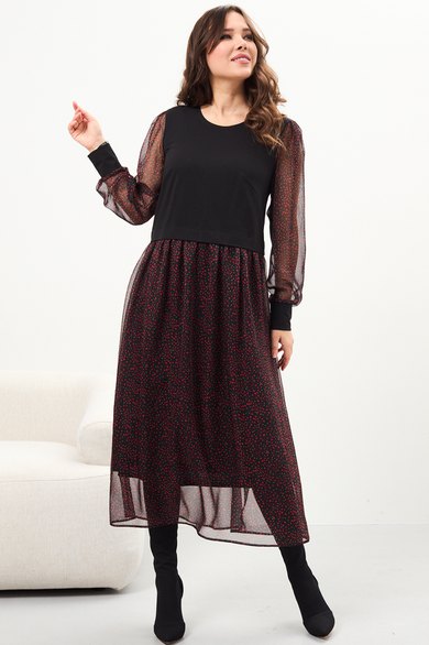 Платье женское прямого силуэта из двух видов ткани: спинка, полочка и манжет из трикотажного полотна. Рукава и юбка из текстильной, шифоновой ткани. Платье отрезное по линии талии со сборкой, из бокового шва идет грудовая выточка, рукав на манжете со сборкой по окату. Длина платья (до талии): (50-52)-43см.,(54-58)-45см.Длина юбки: (50-58)-84см. Длина рукава с манжетой: (50-52)-65см., (54-58)-66см.