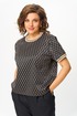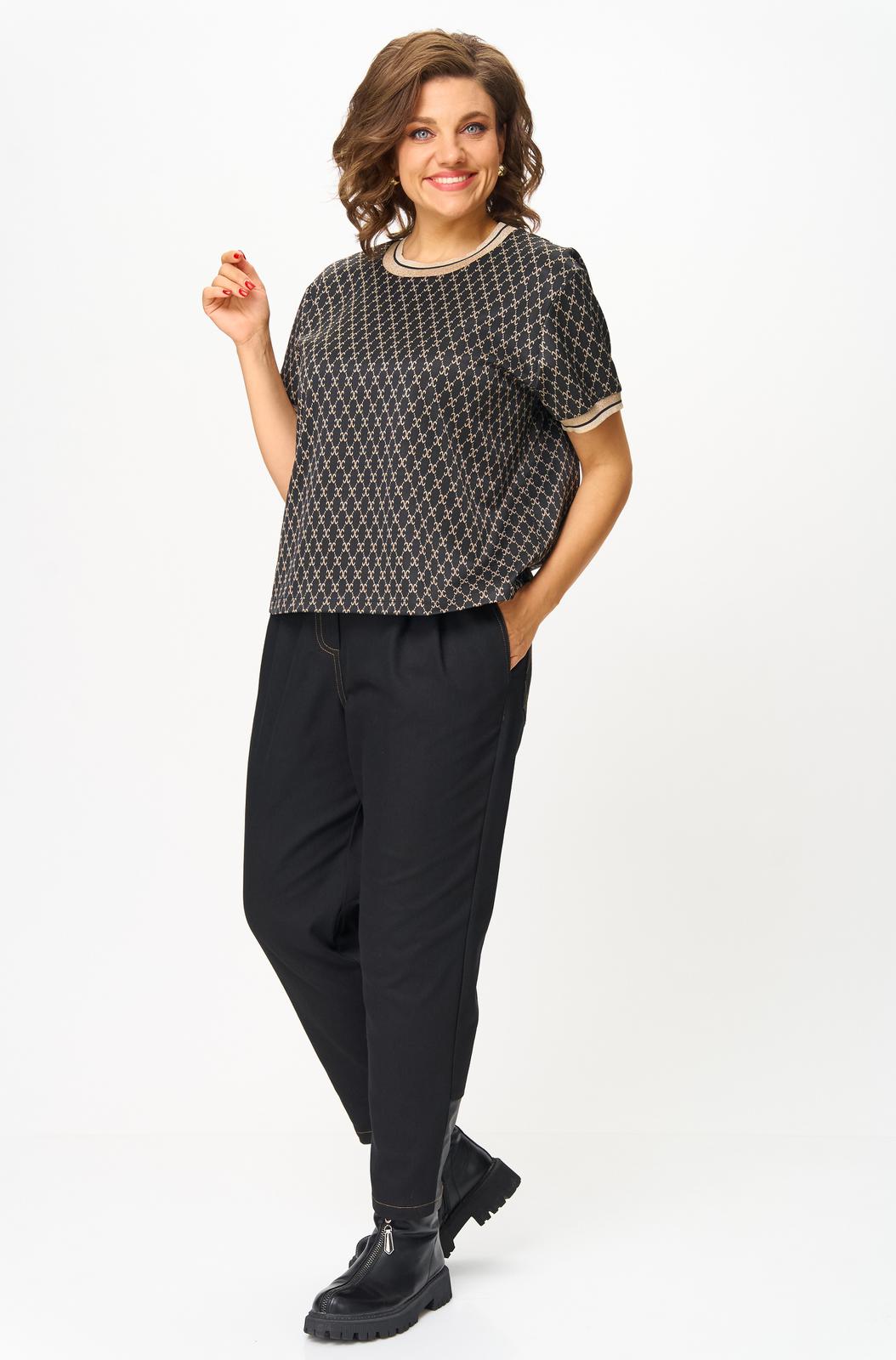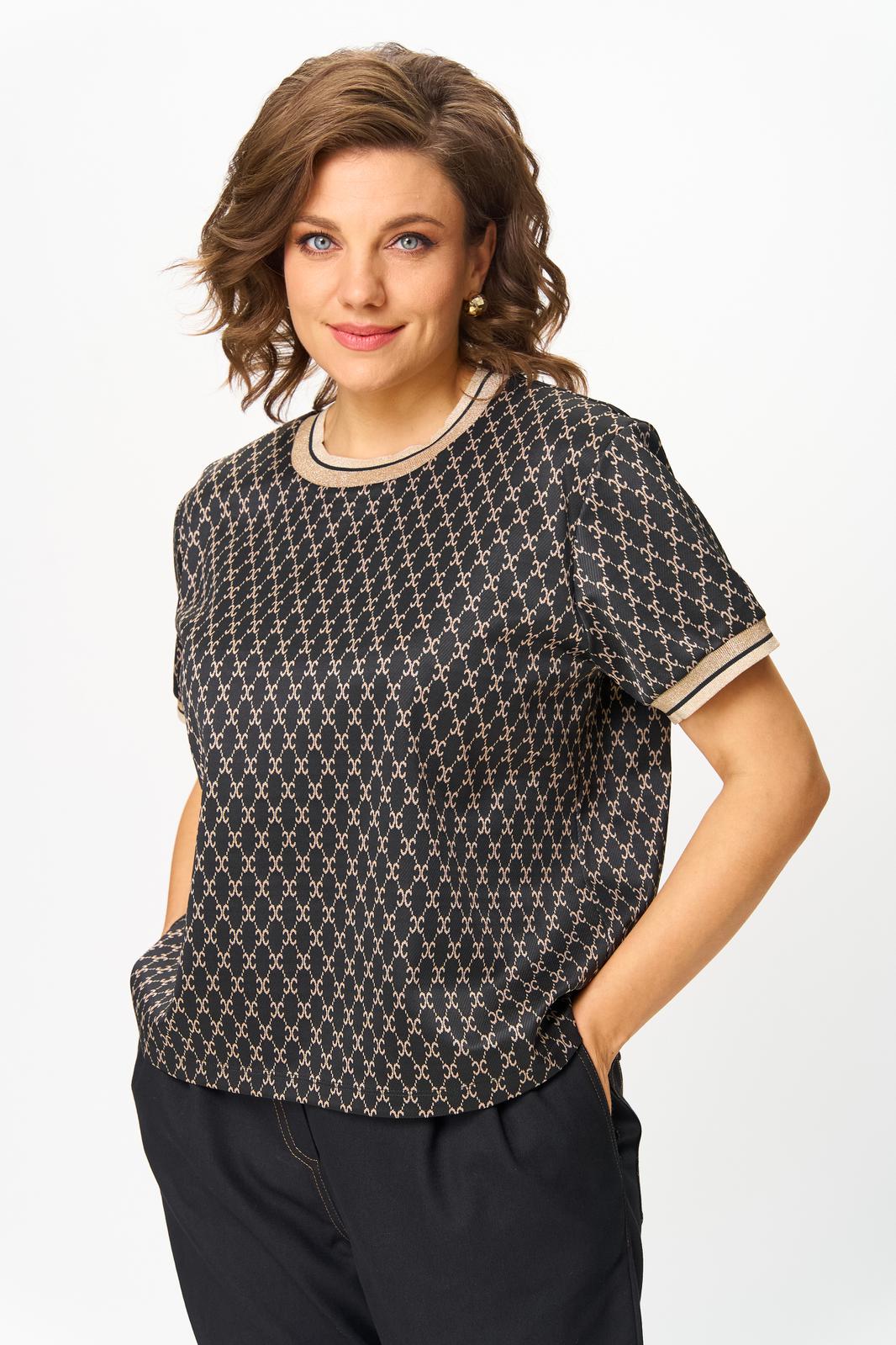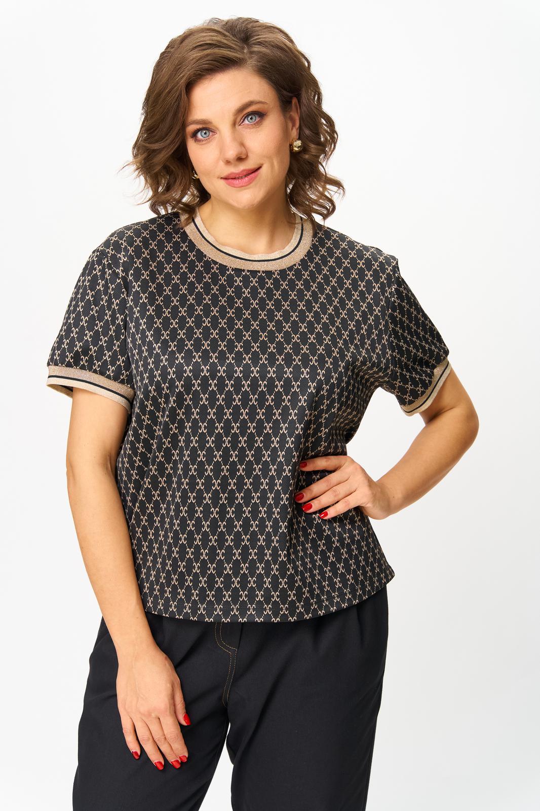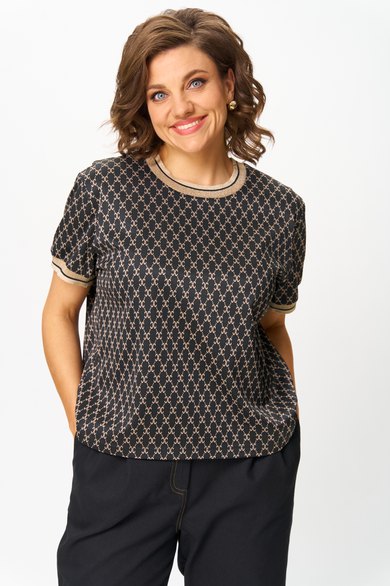 Блузка женская прямого силуэта, выполнена из трикотажного полотна. Горловина круглой формы, рукав одношовный. Горловина и рукав обработаны декоративной бейкой.