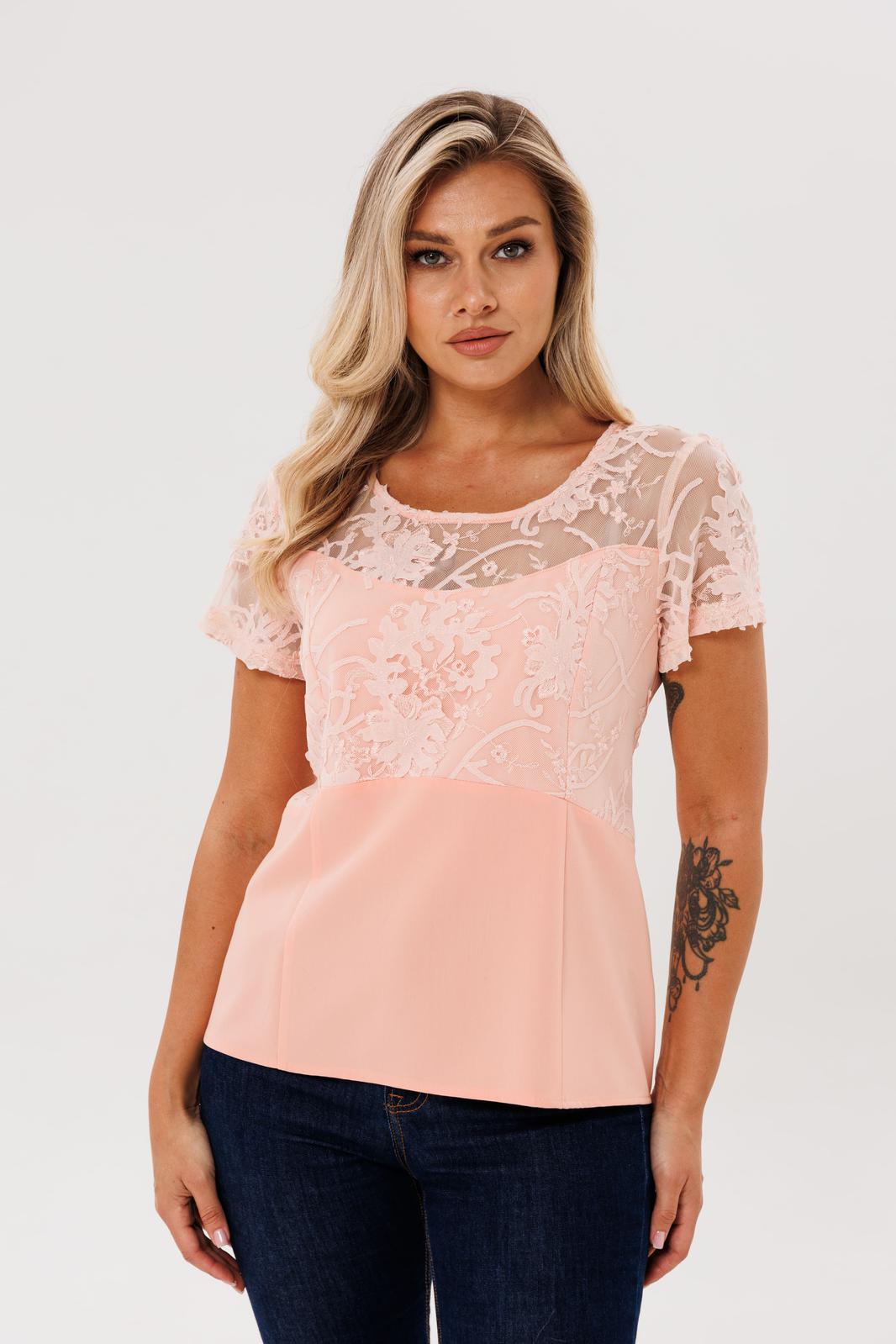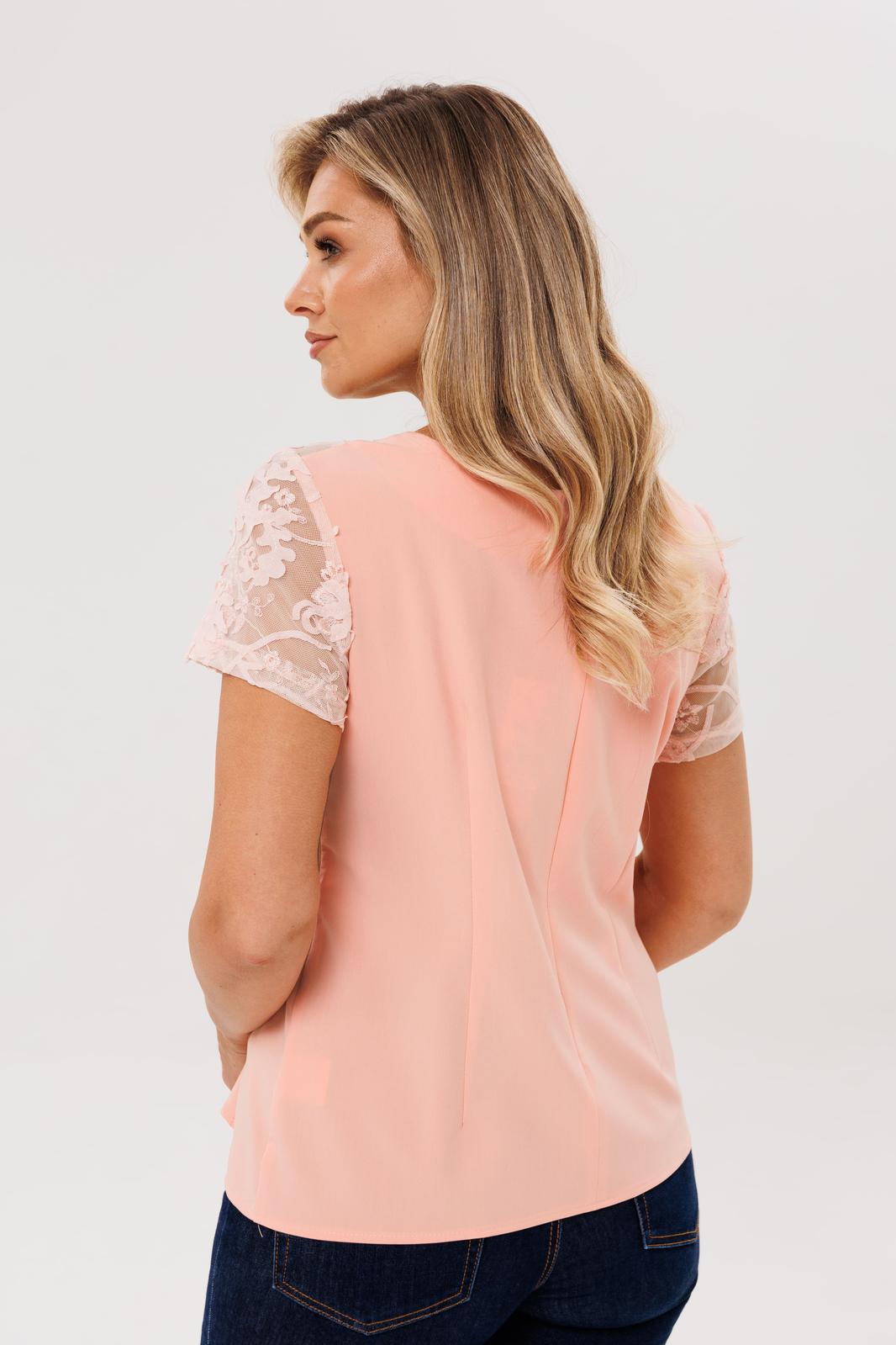 Округлый вырез горловины выглядит аккуратно и мягко, а короткий втачной кружевной рукав добавляет воздушности. Спинка со средним швом и талиевыми вытачками формирует правильный силуэт, а застёжка на скрытую молнию в среднем шве остаётся почти незаметной, сохраняя чистоту линий. Слегка расширенная нижняя часть блузы придаёт образу лёгкость и баланс.
