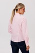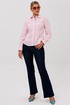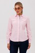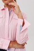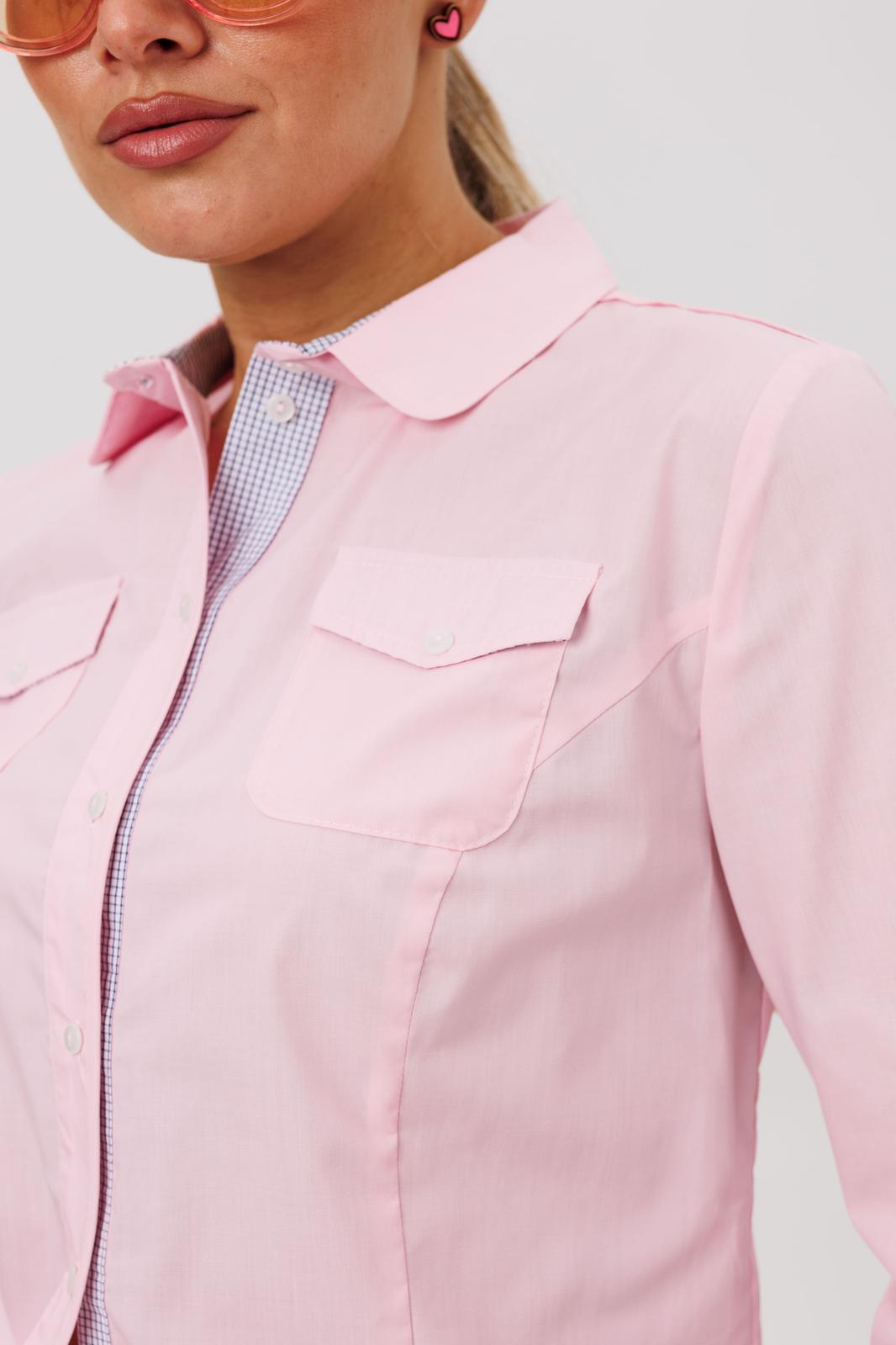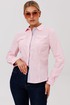 Воротник сорочечного типа и застежка на пуговицы, оформленная притачными планками с декоративной отделкой, подчеркивают классический стиль. Длинные рукава завершаются манжетами, а прорежка на них выделена сложной технологической обработкой с использованием отделочной детали.