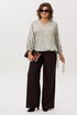 Особую динамику и индивидуальность блузе придают детали: цельнокроеные рукава три четверти подчёркивают целостность и плавность линий, а притачной пояс и манжеты, собранные в нежную сборку благодаря эластичной резинке, создают выразительный контраст с текучестью основной ткани. Эта умная конструкция позволяет вам самостоятельно регулировать длину блузы, творчески преобразуя её силуэт — от парящего и расслабленного до более собранного и чёткого.