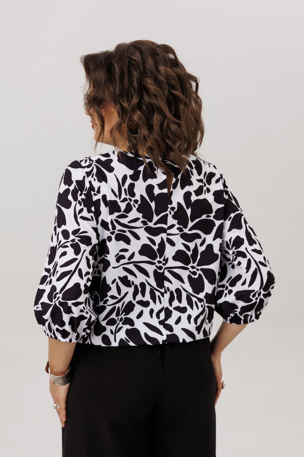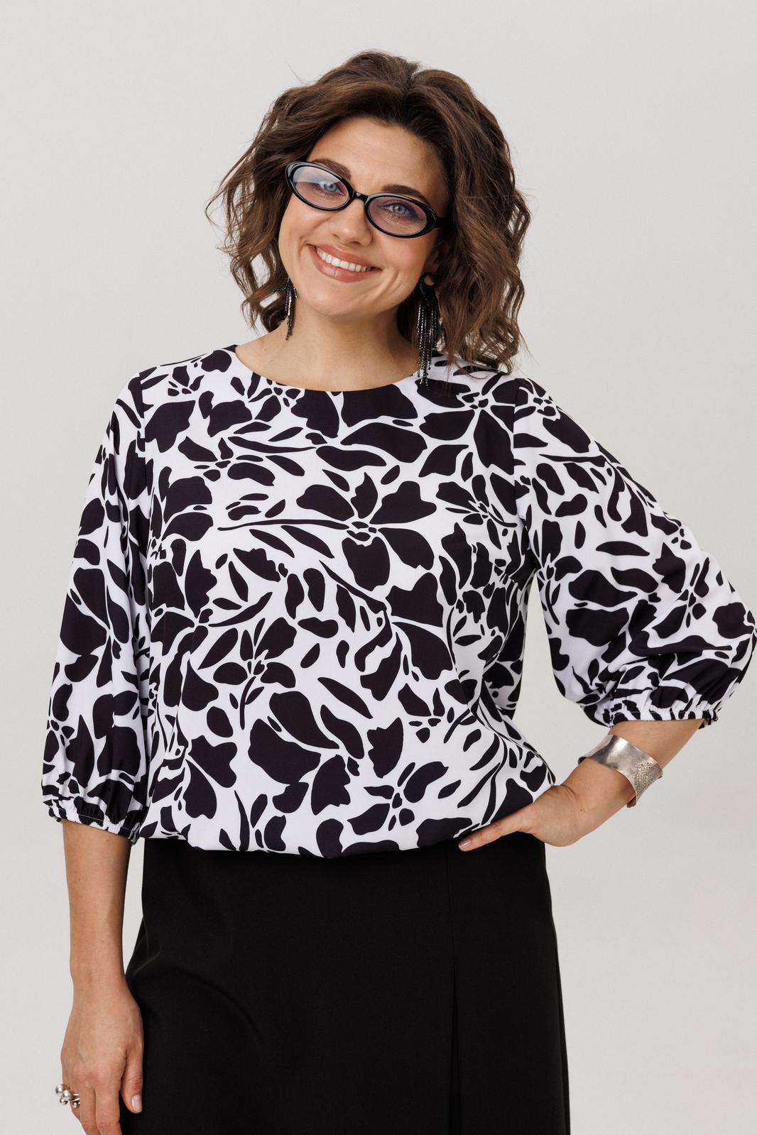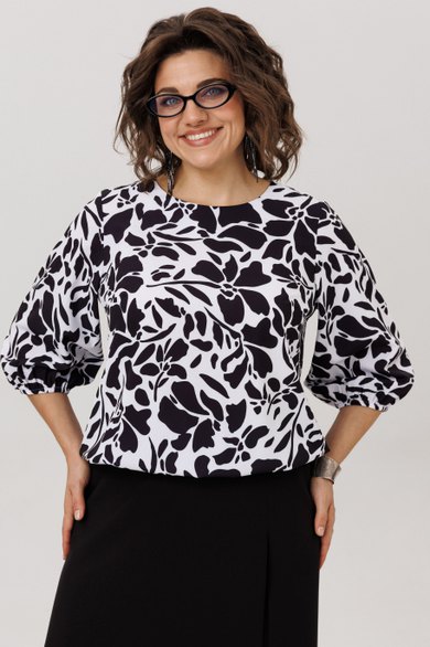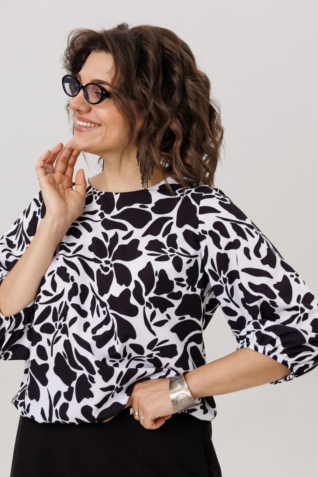 Её мягкий, обнимающий шею круглый вырез подчёркивает изящество, а рукава три четверти с аккуратными манжетами добавляют образу лёгкую, воздушную ноту. Особую прелесть и практичность блузе придаёт мягкая резинка по низу, позволяющая легко регулировать длину и степень прилегания, создавая идеальный баланс между удобством и элегантностью. Всё это великолепие завершает нежный цвет «черно-белые цветы», превращающий простоту кроя в настоящее ежедневное вдохновение.