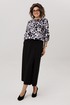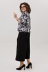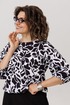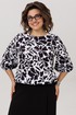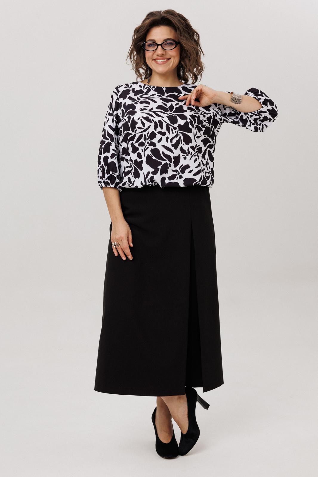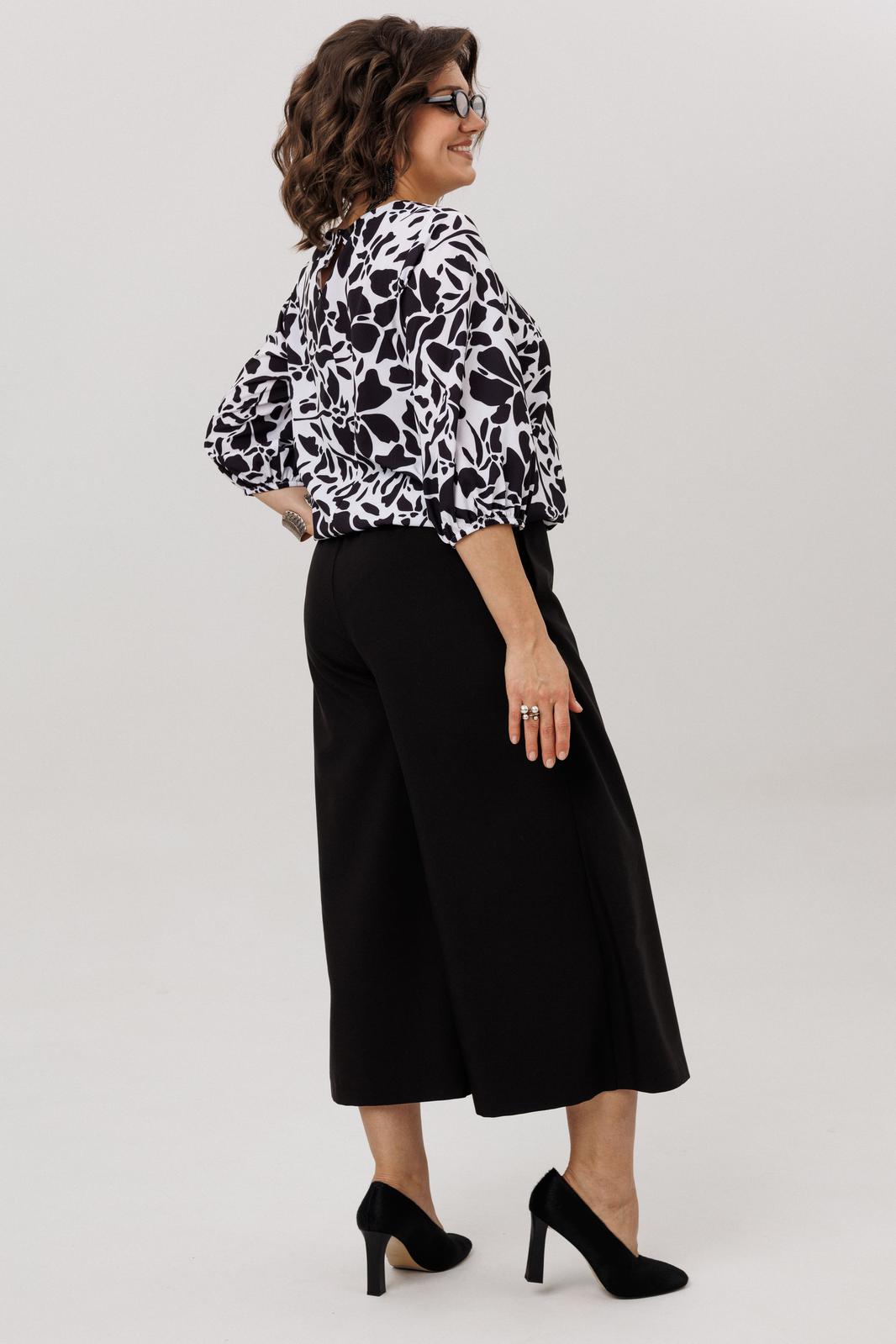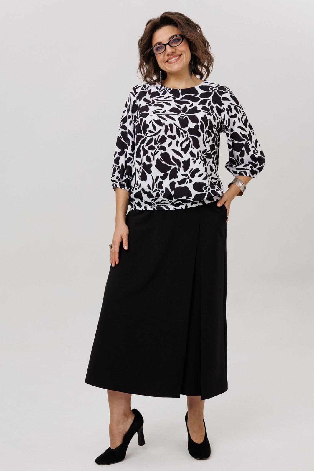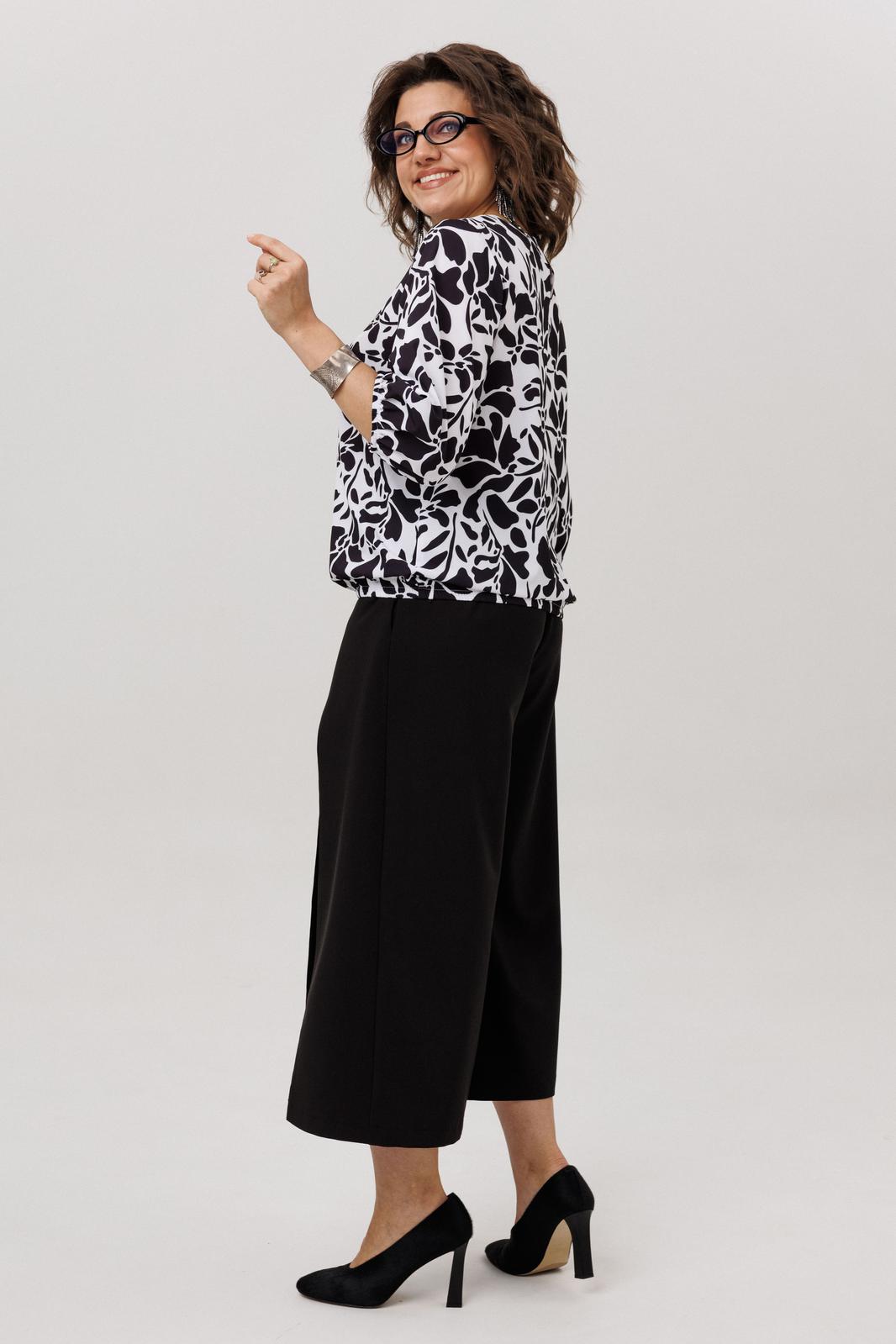 Её мягкий, обнимающий шею круглый вырез подчёркивает изящество, а рукава три четверти с аккуратными манжетами добавляют образу лёгкую, воздушную ноту. Особую прелесть и практичность блузе придаёт мягкая резинка по низу, позволяющая легко регулировать длину и степень прилегания, создавая идеальный баланс между удобством и элегантностью. Всё это великолепие завершает нежный цвет «черно-белые цветы», превращающий простоту кроя в настоящее ежедневное вдохновение.