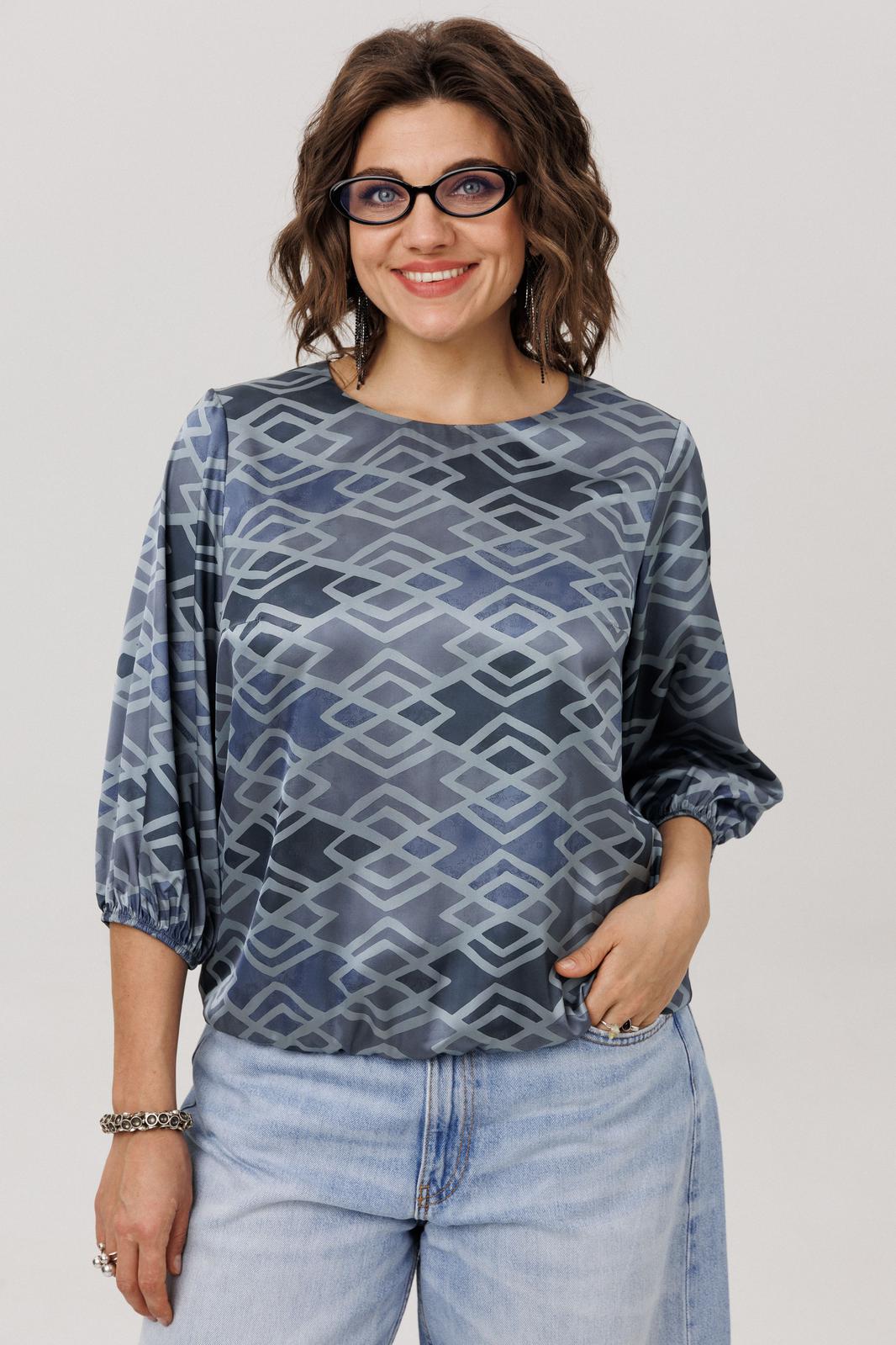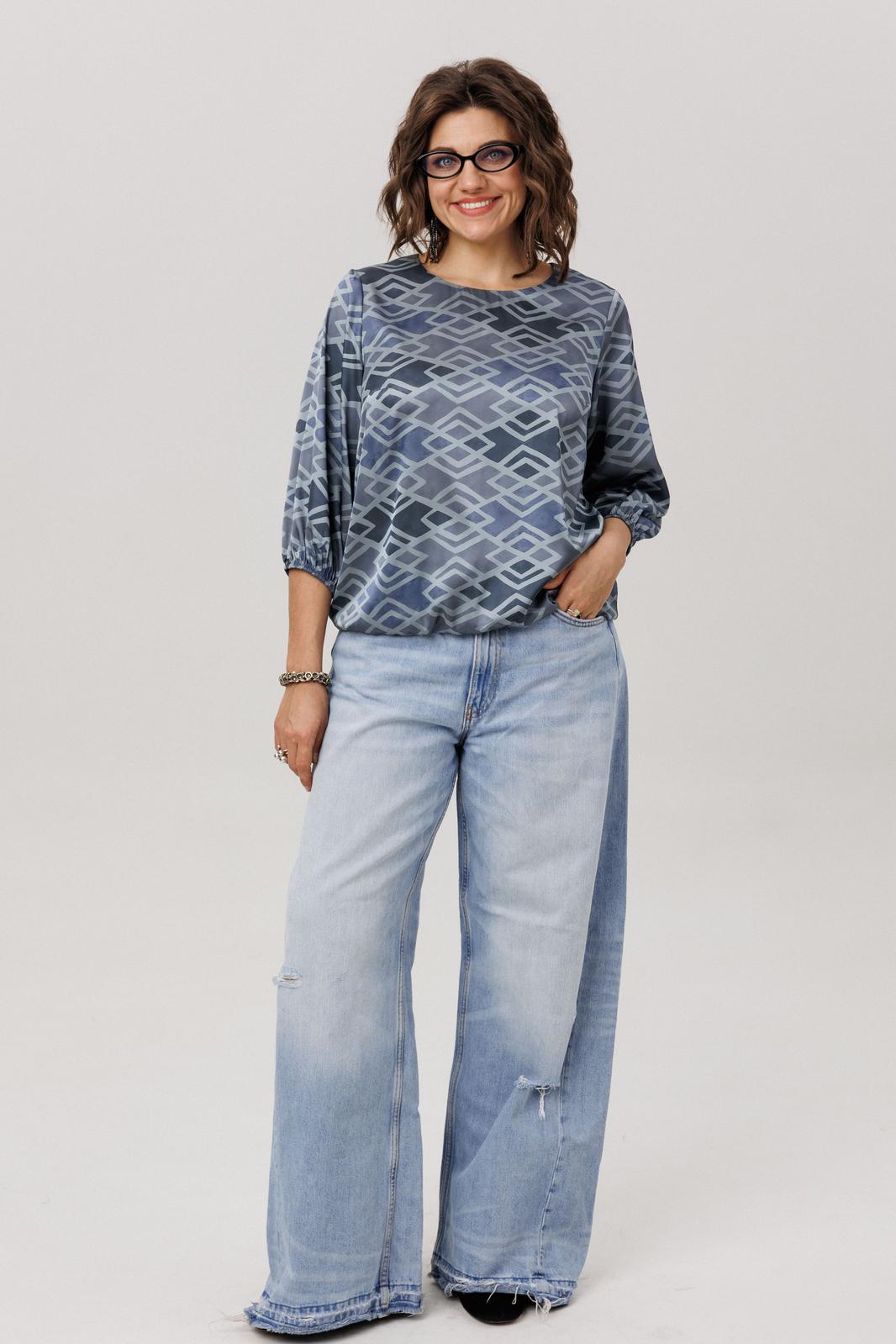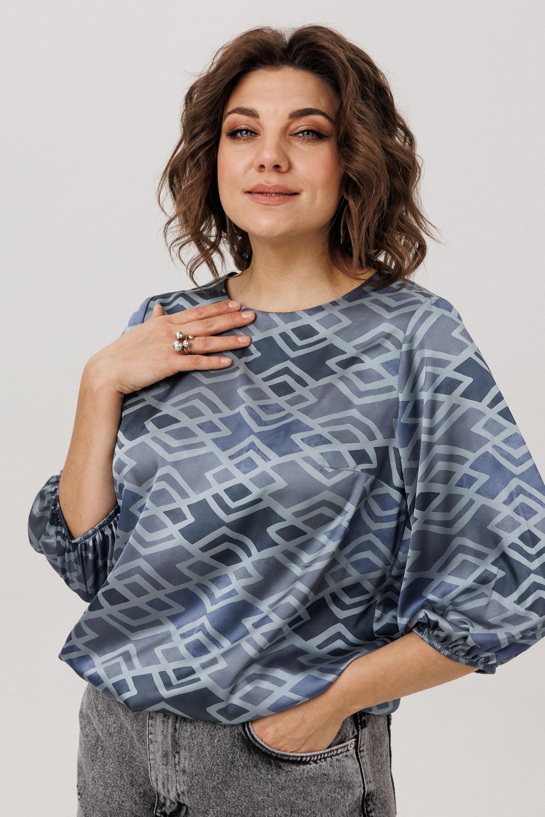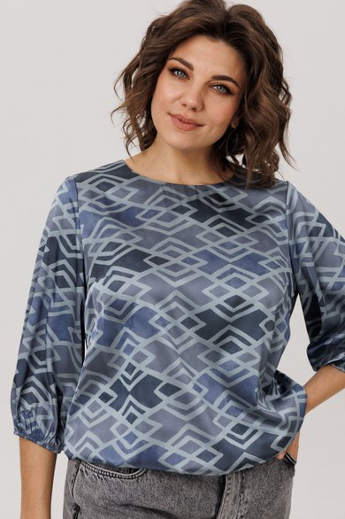 Её мягкий, обнимающий шею круглый вырез подчёркивает изящество, а рукава три четверти с аккуратными манжетами добавляют образу лёгкую, воздушную ноту. Особую прелесть и практичность блузе придаёт мягкая резинка по низу, позволяющая легко регулировать длину и степень прилегания, создавая идеальный баланс между удобством и элегантностью. Всё это великолепие завершает нежный «аронианский синий» цвет, превращающий простоту кроя в настоящее ежедневное вдохновение.