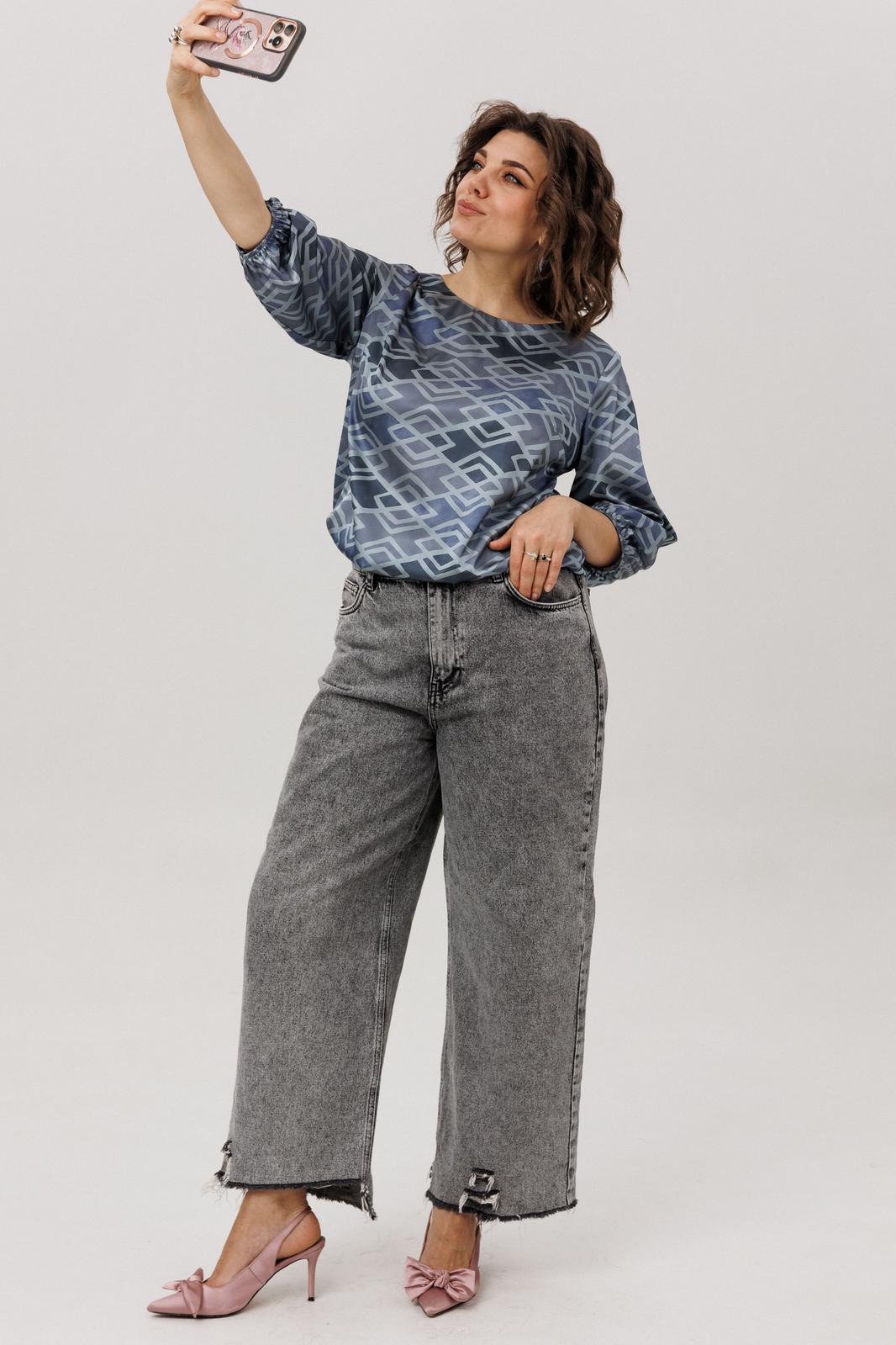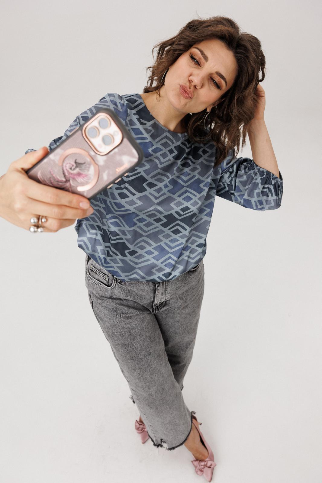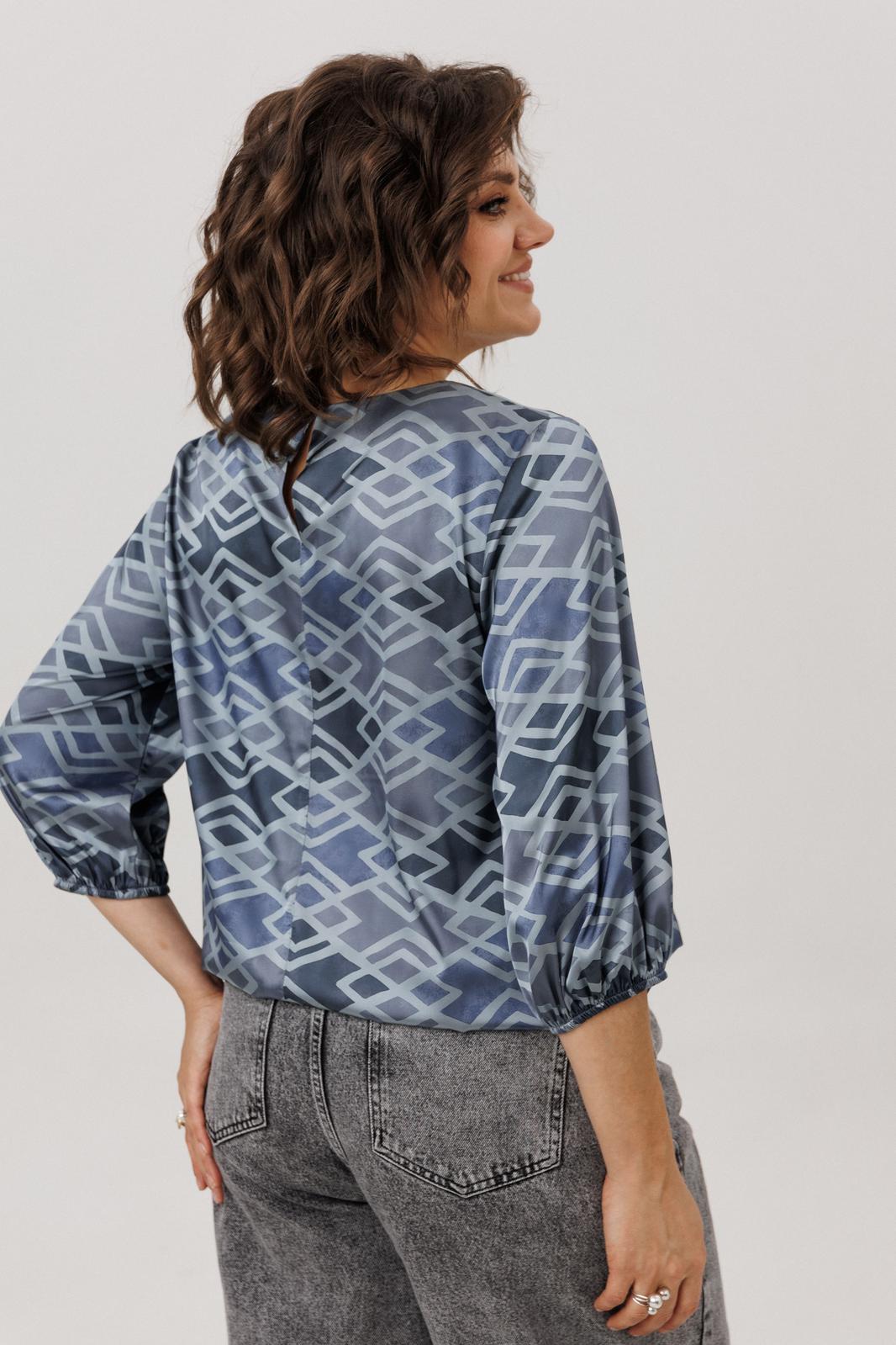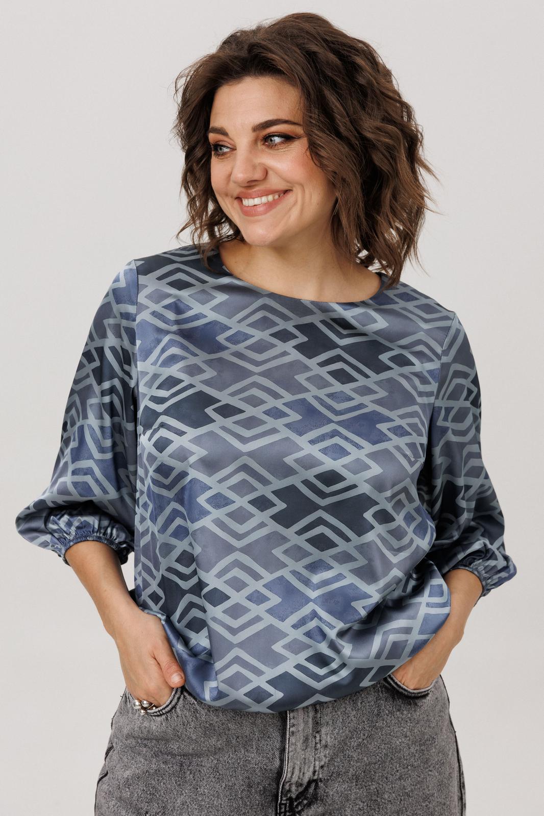 Её мягкий, обнимающий шею круглый вырез подчёркивает изящество, а рукава три четверти с аккуратными манжетами добавляют образу лёгкую, воздушную ноту. Особую прелесть и практичность блузе придаёт мягкая резинка по низу, позволяющая легко регулировать длину и степень прилегания, создавая идеальный баланс между удобством и элегантностью. Всё это великолепие завершает нежный «аронианский синий» цвет, превращающий простоту кроя в настоящее ежедневное вдохновение.