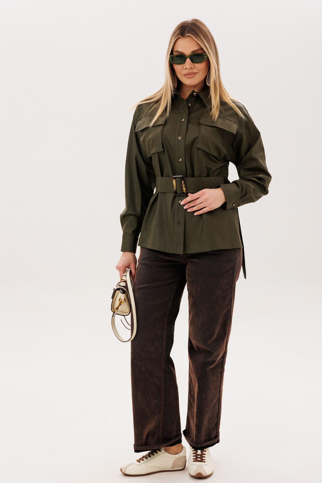 Пояс из той же эко кожи позволяет менять настроение образа - носить рубашку свободно или мягко подчеркнуть талию, создавая более женственный силуэт. Эта модель легко вписывается в гардероб, прекрасно сочетается с джинсами и каблуками, создавая образ, в котором комфорт соединяется с выразительностью. Рубашка, в которой чувствуется уверенность, стиль и особое настроение.