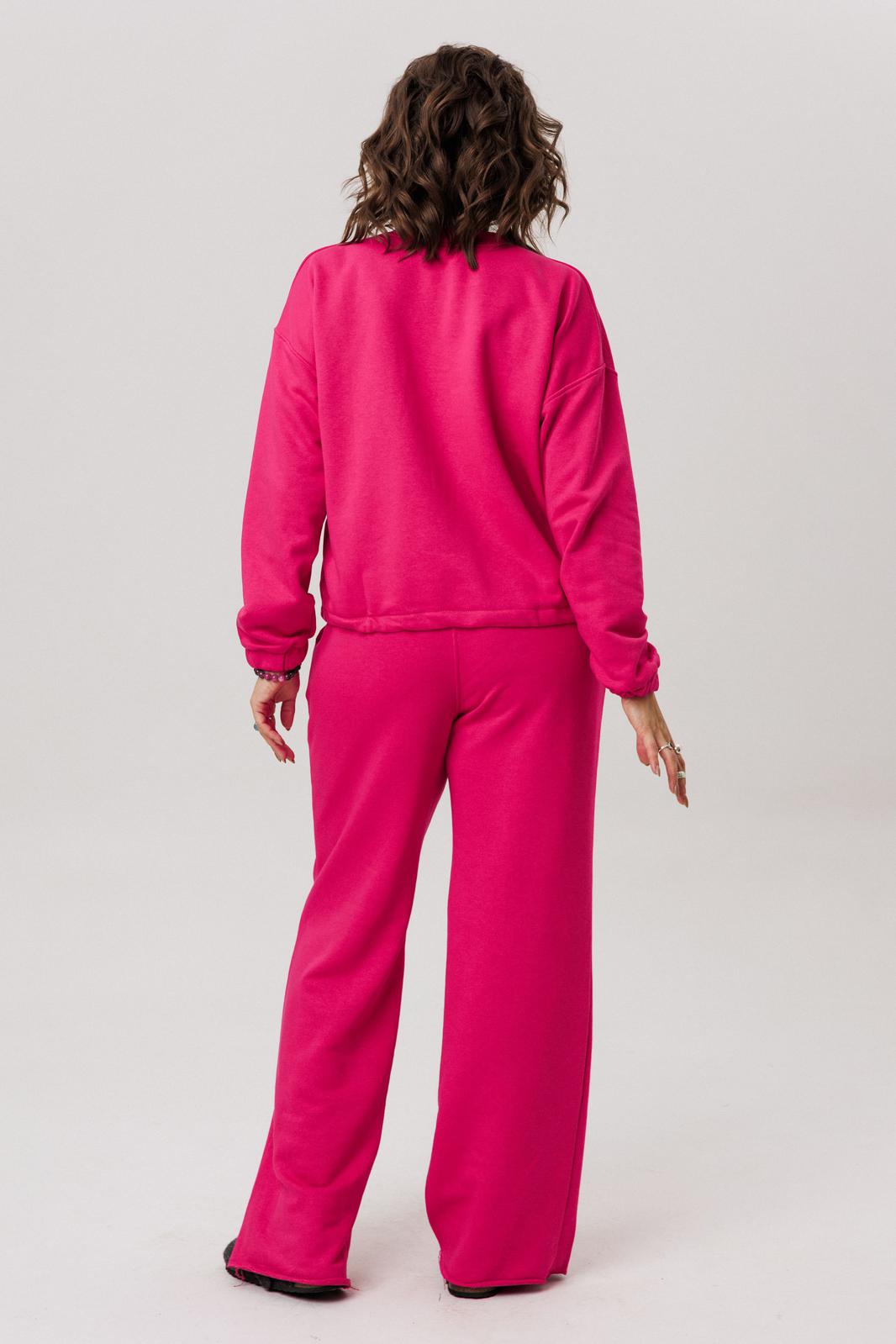Верхняя часть костюма, выполненная в виде объемного свитшота, представляет собой мастерское сочетание расслабленных линий и продуманных деталей. Удлиненная линия плеча и длинные рукава струятся мягкими складками, завершаясь аккуратной манжетой. Фронтальная часть оформлена изящной отрезной кокеткой, а накладные карманы с клапанами, добавляюют образу тактильной выразительности. Низ свитшота, оформленный на кулиске, позволяет вам самостоятельно регулировать степень свободы и объем, делая силуэт именно таким, как вам хочется сегодня.