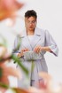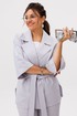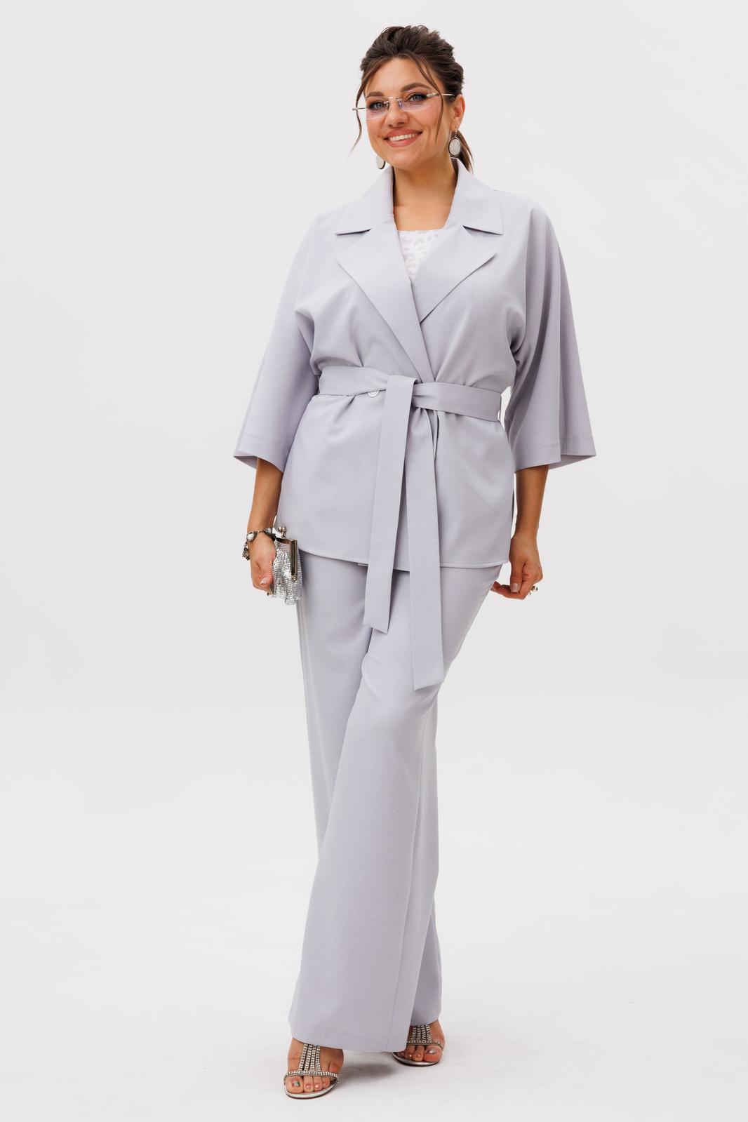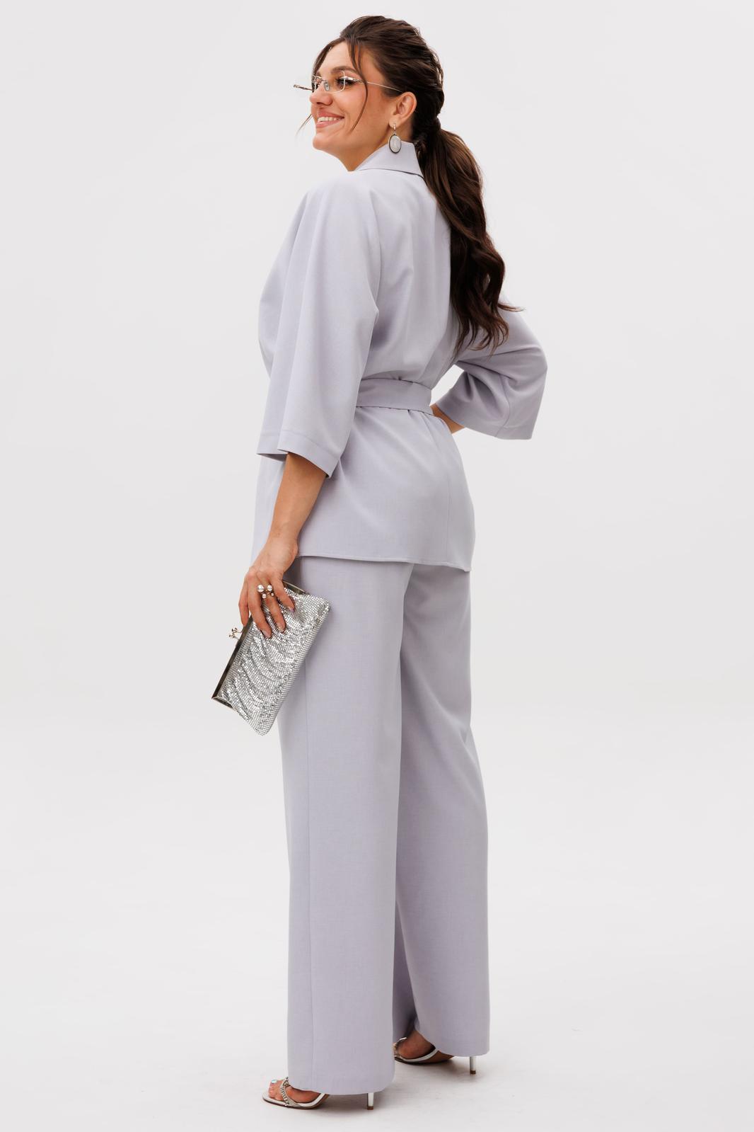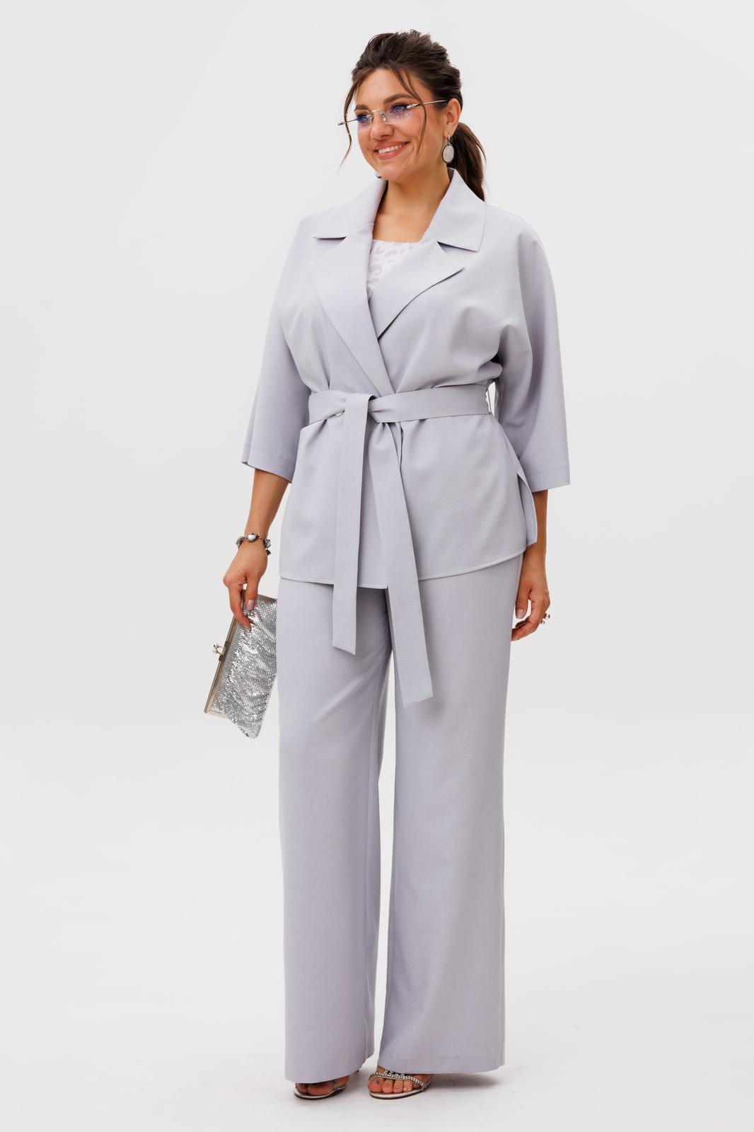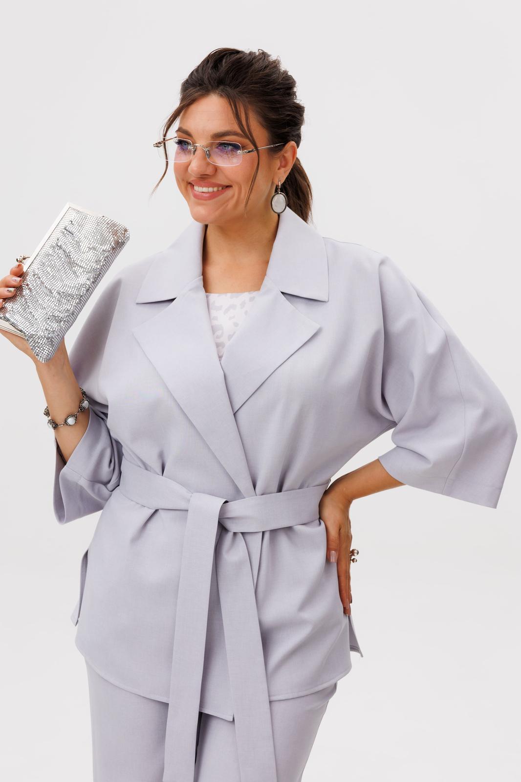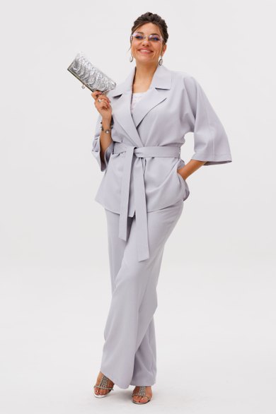 Свободный жакет с мягким отложным воротником и лацканами, двубортная застежка которого застегивается на две лаконичные пуговицы, создает расслабленный, но при этом собранный силуэт. Его цельнокроеные рукава длины три четверти изящно открывают запястья, а боковые разрезы придают образу воздушность и свободу движений, дополняясь тонким поясом, который позволяет менять акценты по настроению.