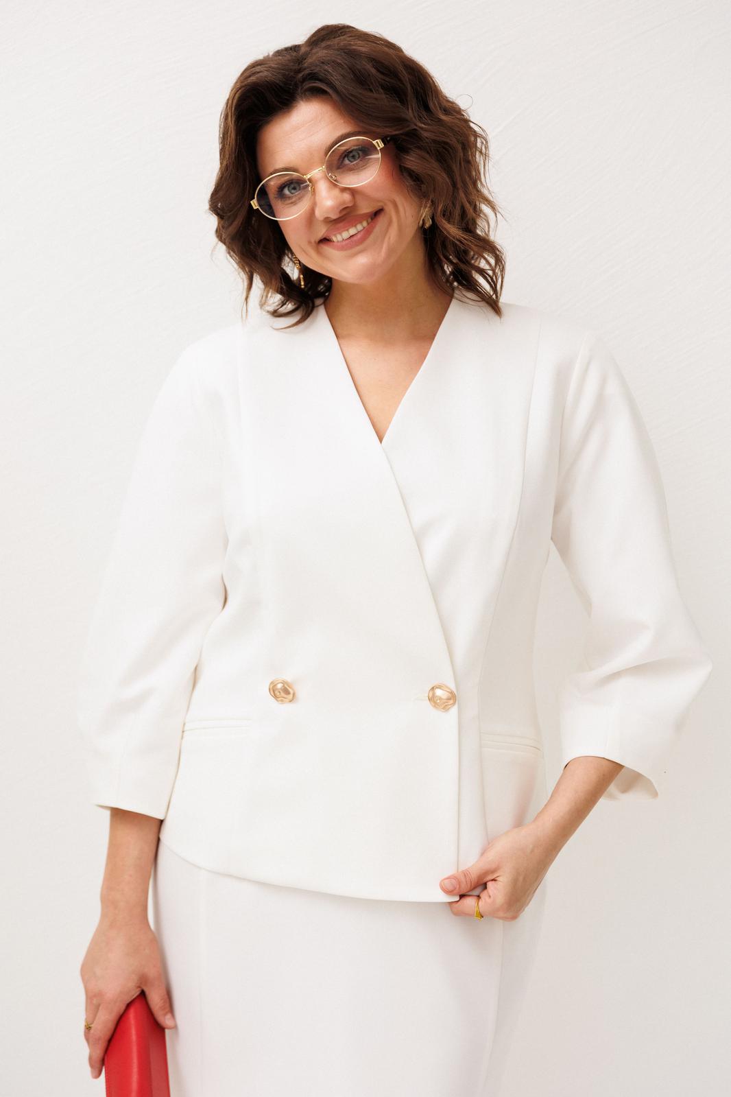 Костюм в нежном оттенке «лебедь» звучит спокойно и благородно, создавая образ, в котором сочетаются женственность, лёгкость и уверенная элегантность.