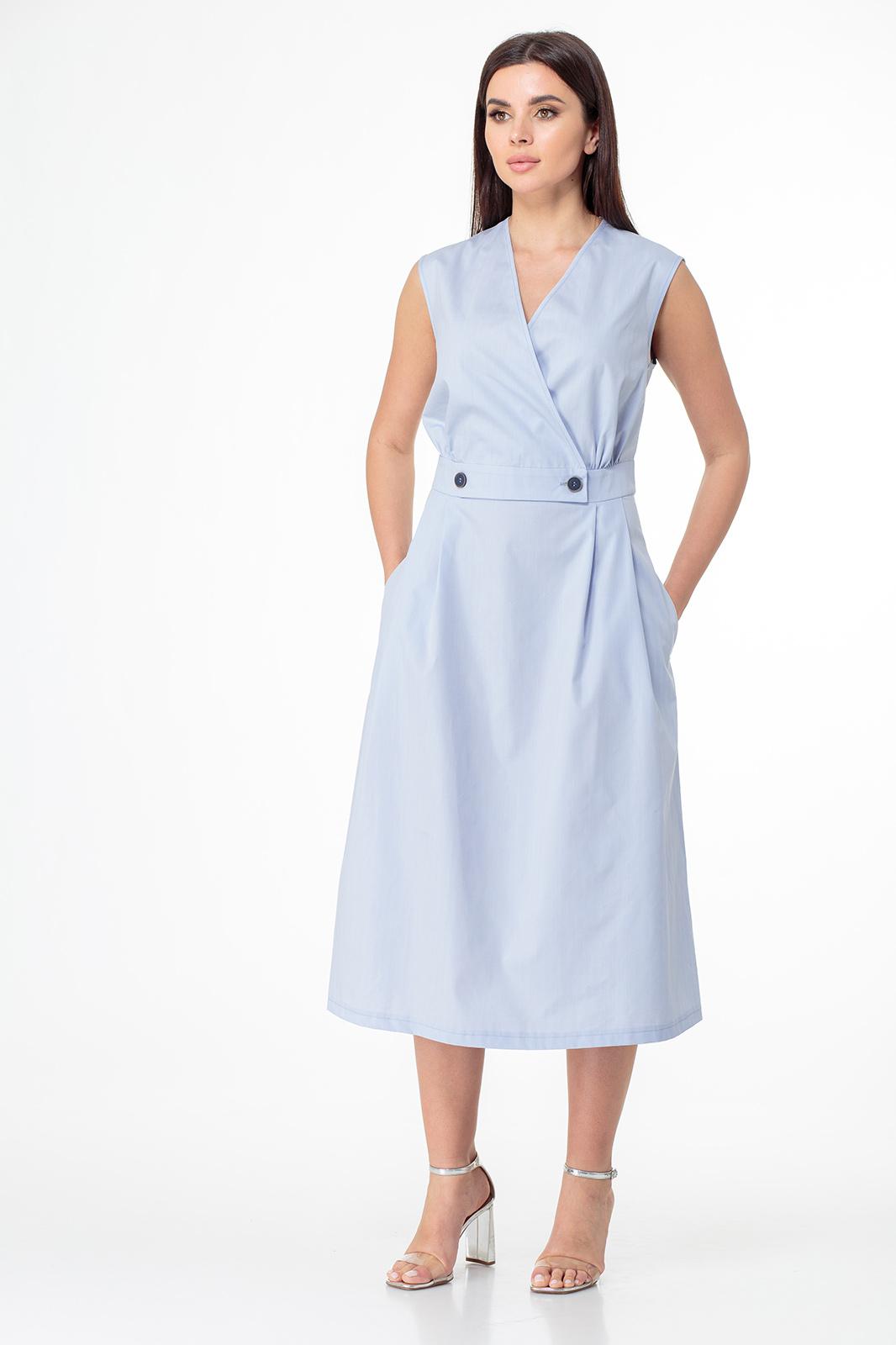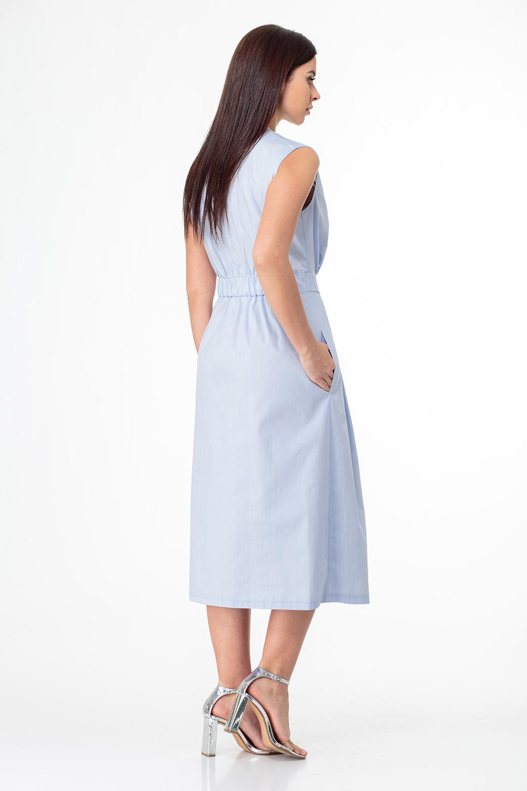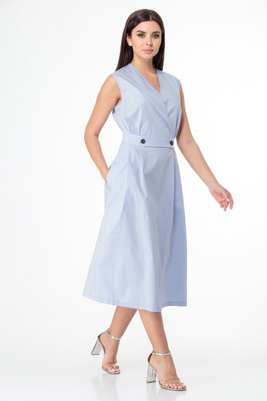 Отрезное по линии талии, лиф с запахом. Нижняя часть платья со складками по переду, расширена к низу. Притачная деталь в области талии по переду имитирует пояс с застежкой на запах. Спинка прямая, расширена книзу, присборена эластичной лентой в области талии. В боковых швах расположены карманы.